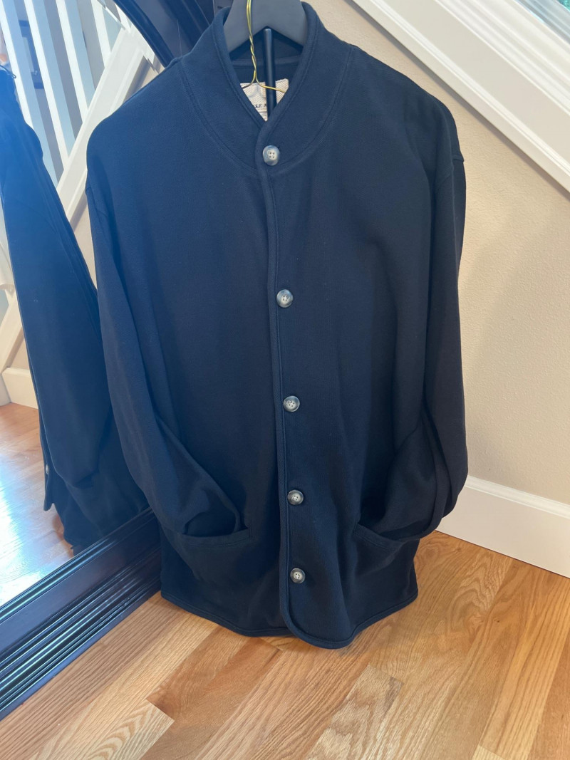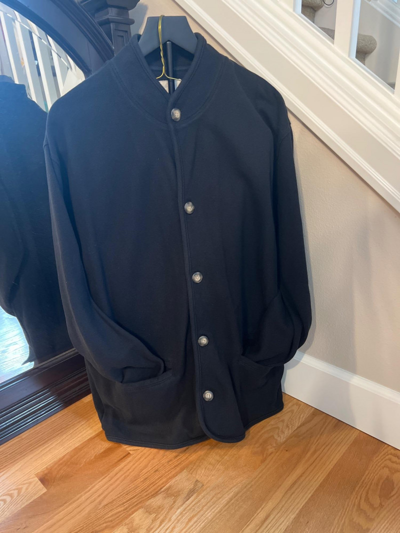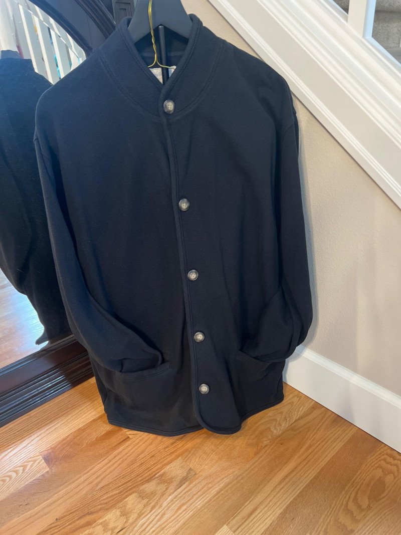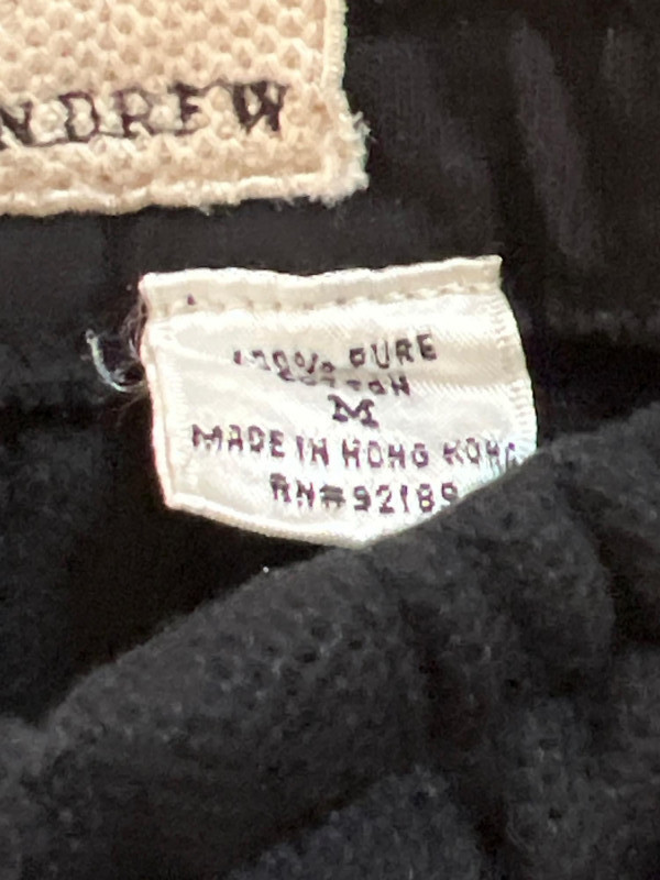 Vintage Derek Andrew women’s two‑piece pant suit in a deep navy blue, crafted from quality cotton with a soft, structured drape. The set includes a collarless button‑front jacket with metallic buttons and matching straight‑leg pants. The clean, minimalist silhouette is characteristic of Derek Andrew’s late‑20th‑century womenswear — practical, understated, and easy to style. Marked Women’s Medium.