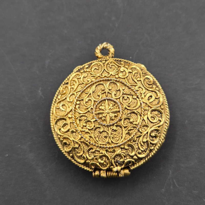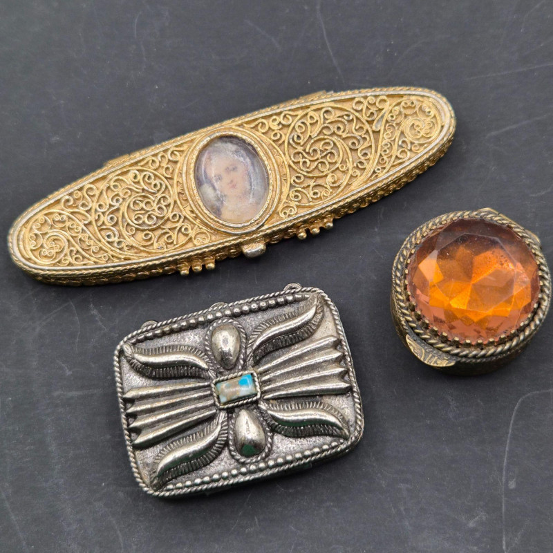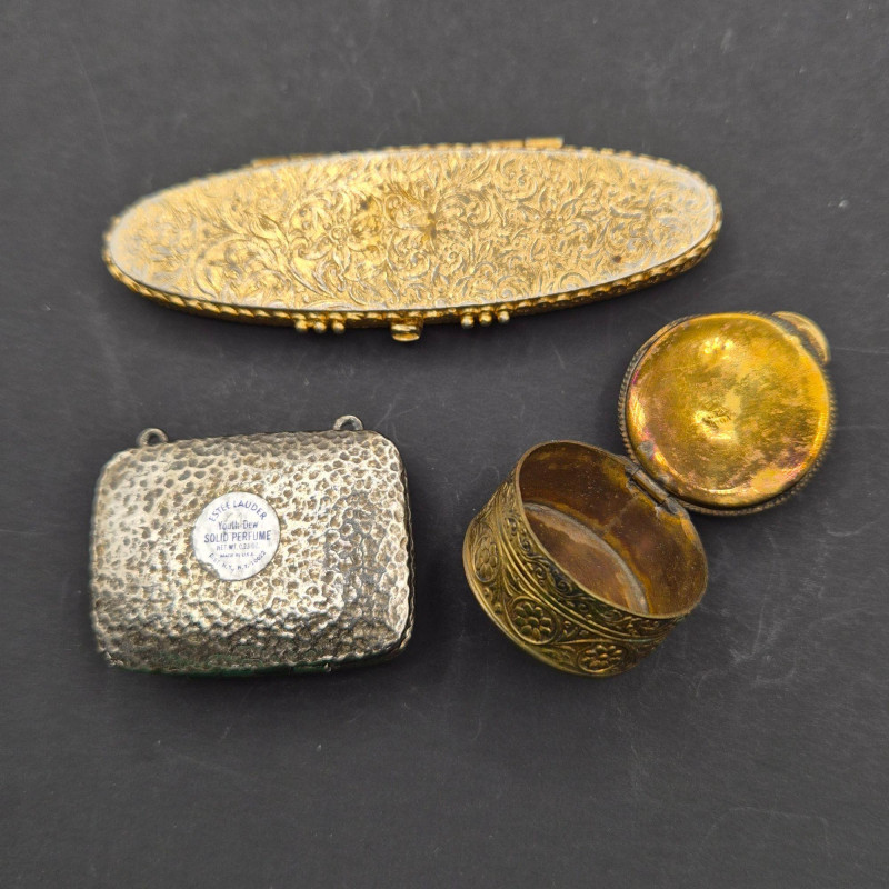 A charming assortment of vintage perfume lockets, compacts, and vanity pieces from iconic beauty houses including Estée Lauder, Max Factor, Avon, Ultima, Houbigant, and others. This lot blends decorative metalwork, nostalgic fragrance packaging, and wearable perfume jewelry.