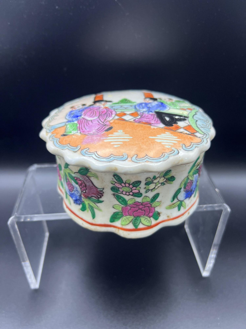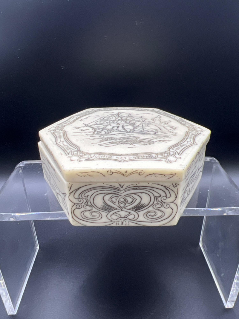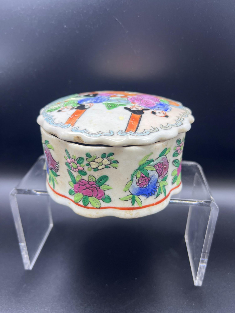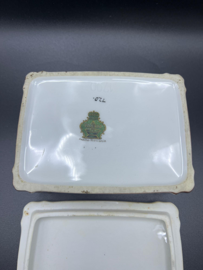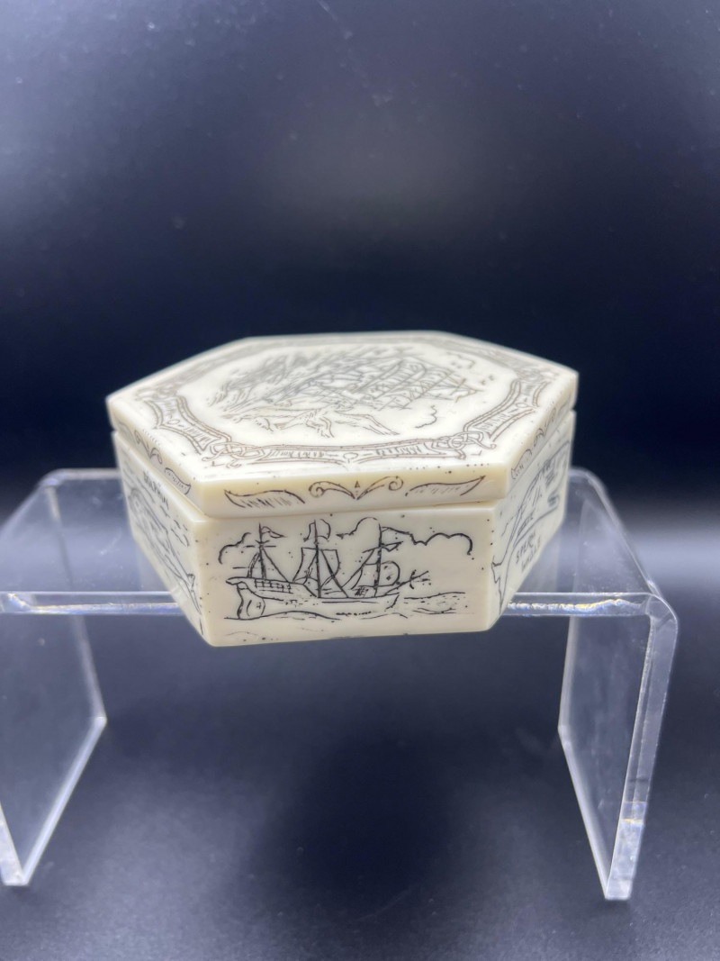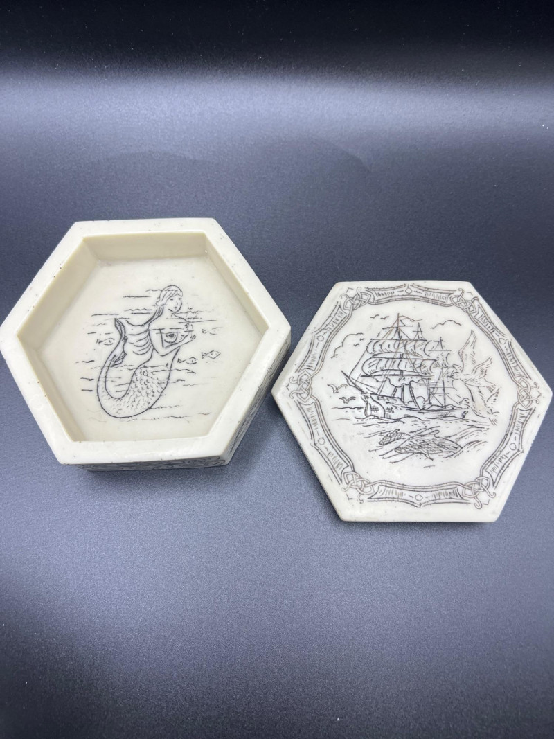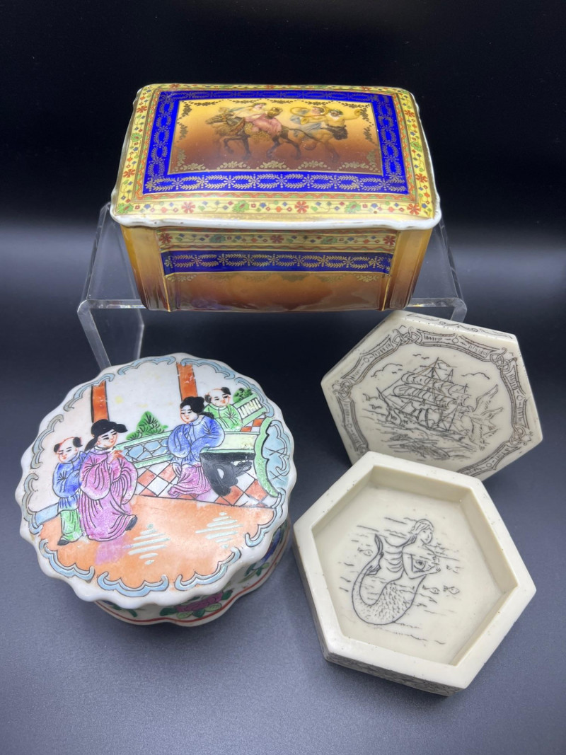 Charming mixed lot of three decorative trinket boxes from different regions and eras: Gloria Czecho‑Slovakia Porcelain Box (5" length x 3.75" width x 2" tall) – Early 20th‑century export porcelain (1918–1939) with scalloped edges and classic transfer decoration. Macau Hand‑Painted Porcelain Box (4.5" round x 2.5" tall) – Mid‑century export "piece with bright enamels, figural scene, and workshop red seal; marked “Hand Painted in Macau.” Soapstone Nautical Box (4" width) – Hexagonal carved stone box featuring engraved scrimshaw‑style artwork, including a sailing ship and marine motifs. A beautifully eclectic grouping ideal for collectors of porcelain, hand‑painted export ware, and carved stone boxes.