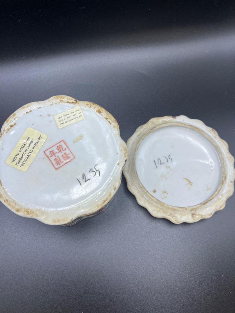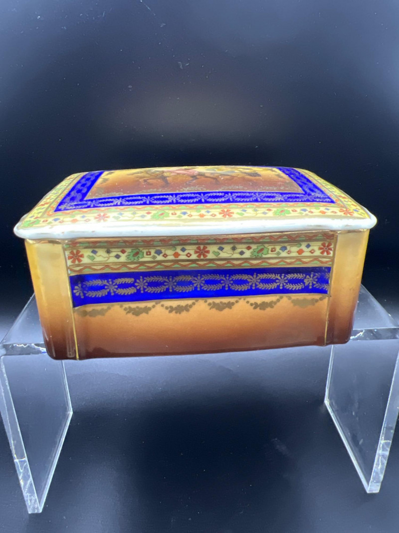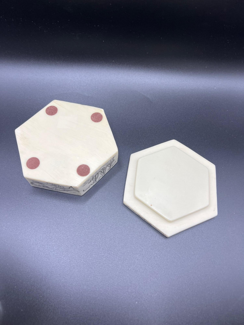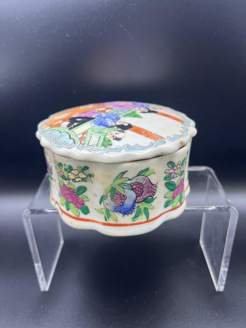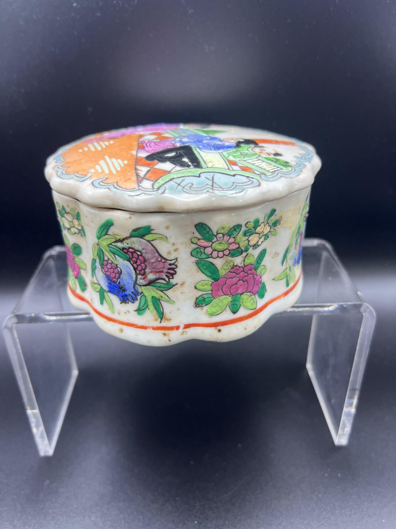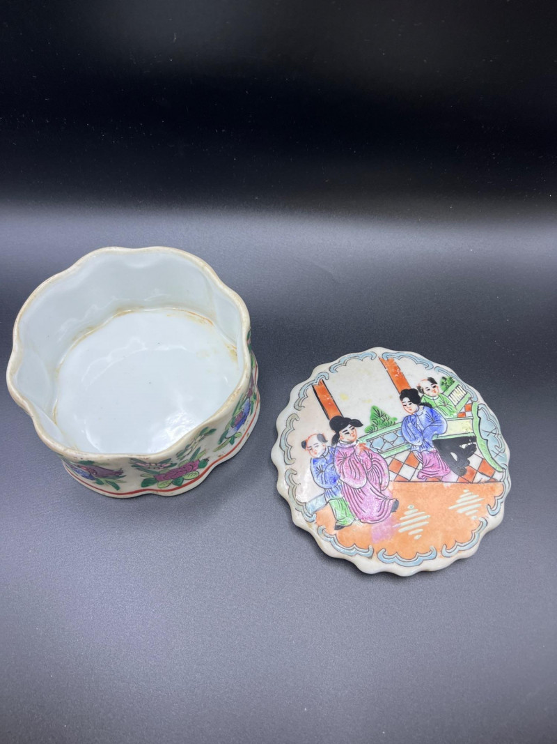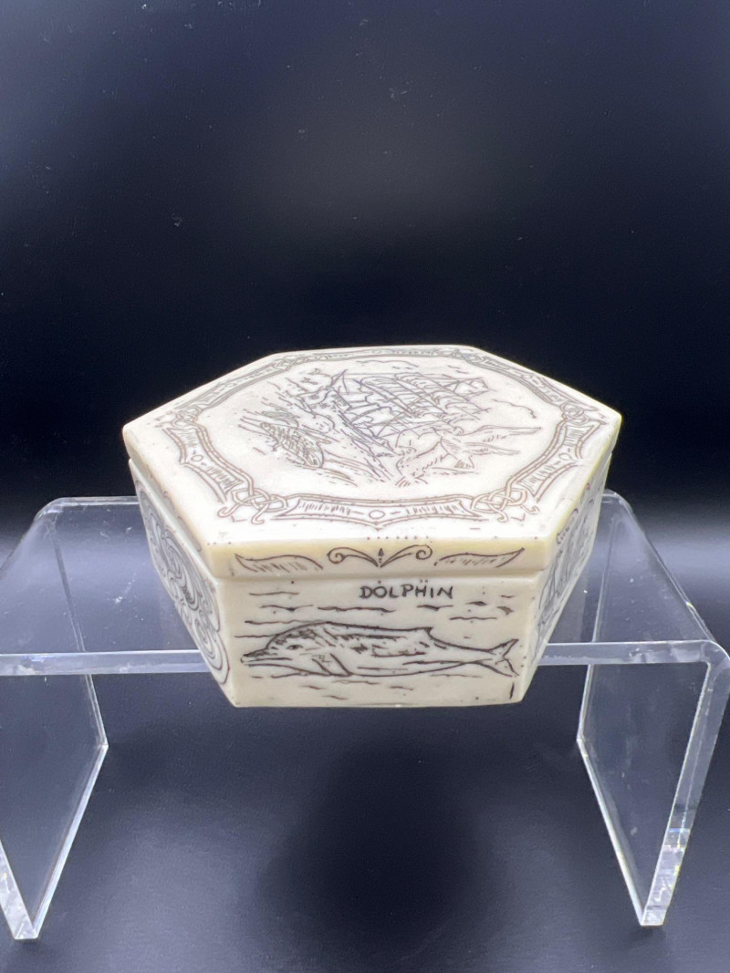 Charming mixed lot of three decorative trinket boxes from different regions and eras: Gloria Czecho‑Slovakia Porcelain Box (5" length x 3.75" width x 2" tall) – Early 20th‑century export porcelain (1918–1939) with scalloped edges and classic transfer decoration. Macau Hand‑Painted Porcelain Box (4.5" round x 2.5" tall) – Mid‑century export "piece with bright enamels, figural scene, and workshop red seal; marked “Hand Painted in Macau.” Soapstone Nautical Box (4" width) – Hexagonal carved stone box featuring engraved scrimshaw‑style artwork, including a sailing ship and marine motifs. A beautifully eclectic grouping ideal for collectors of porcelain, hand‑painted export ware, and carved stone boxes.