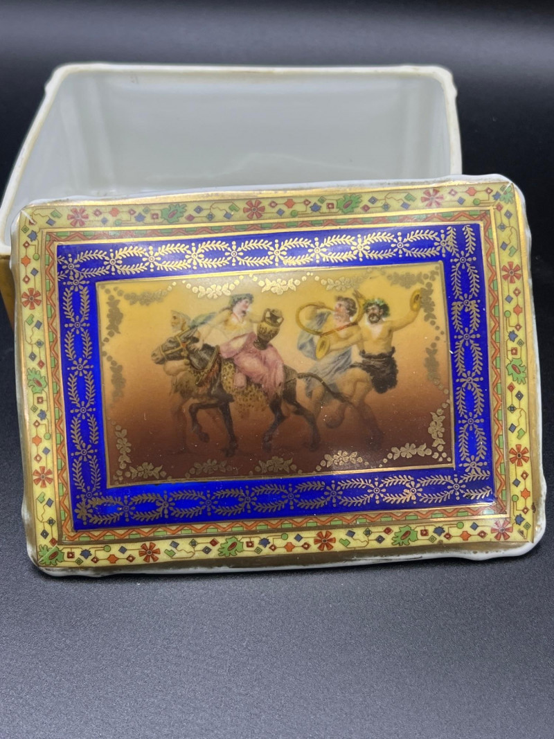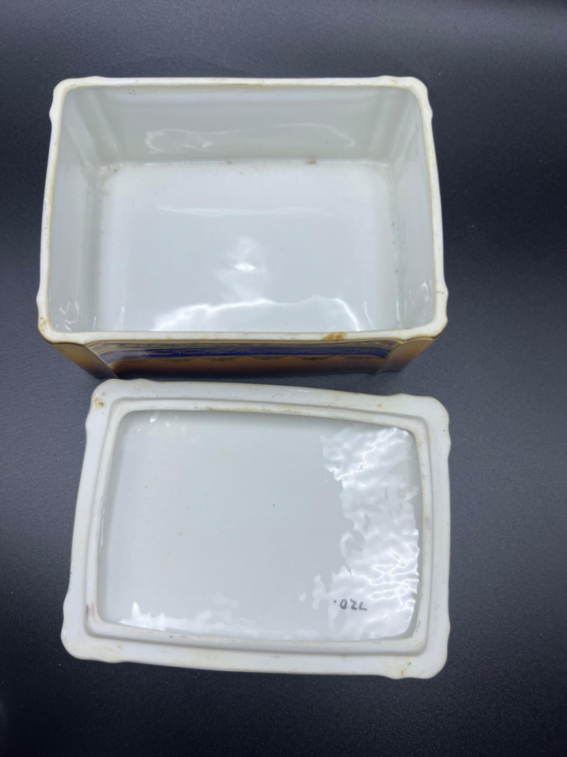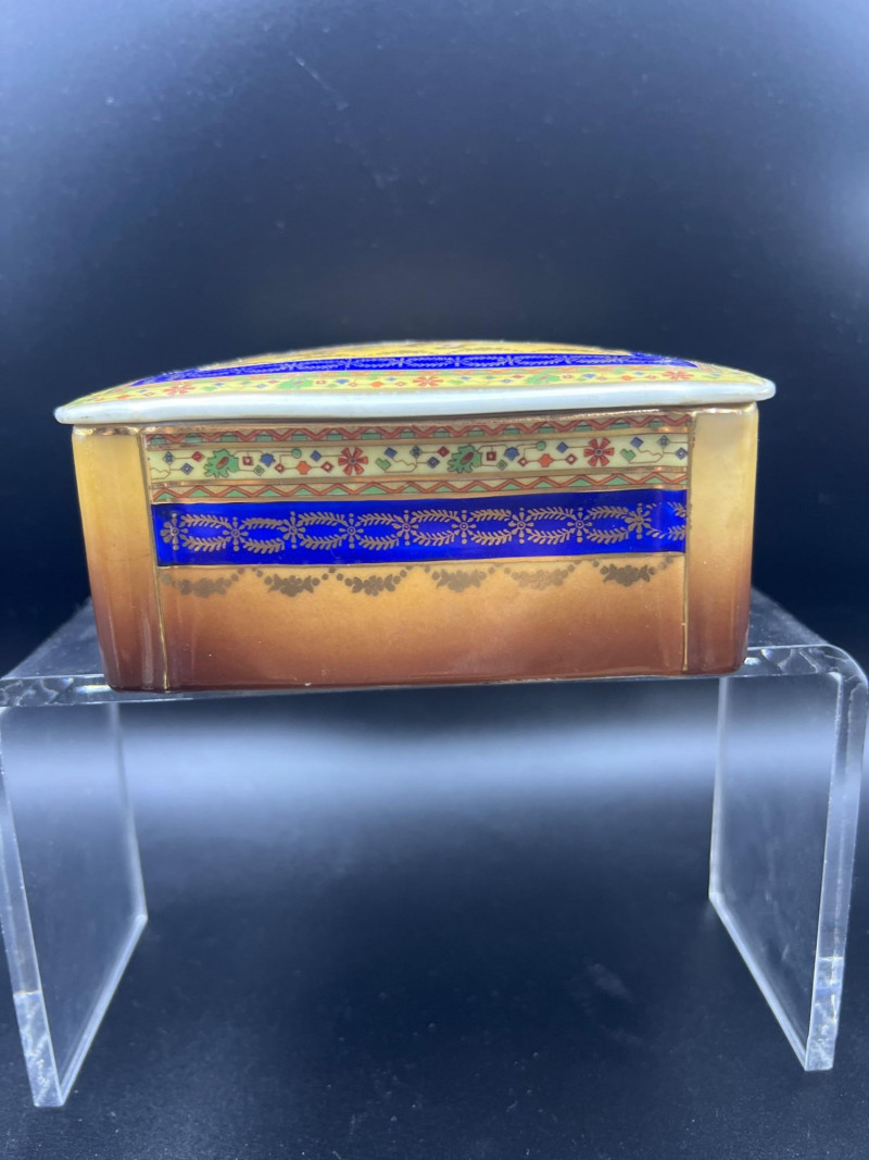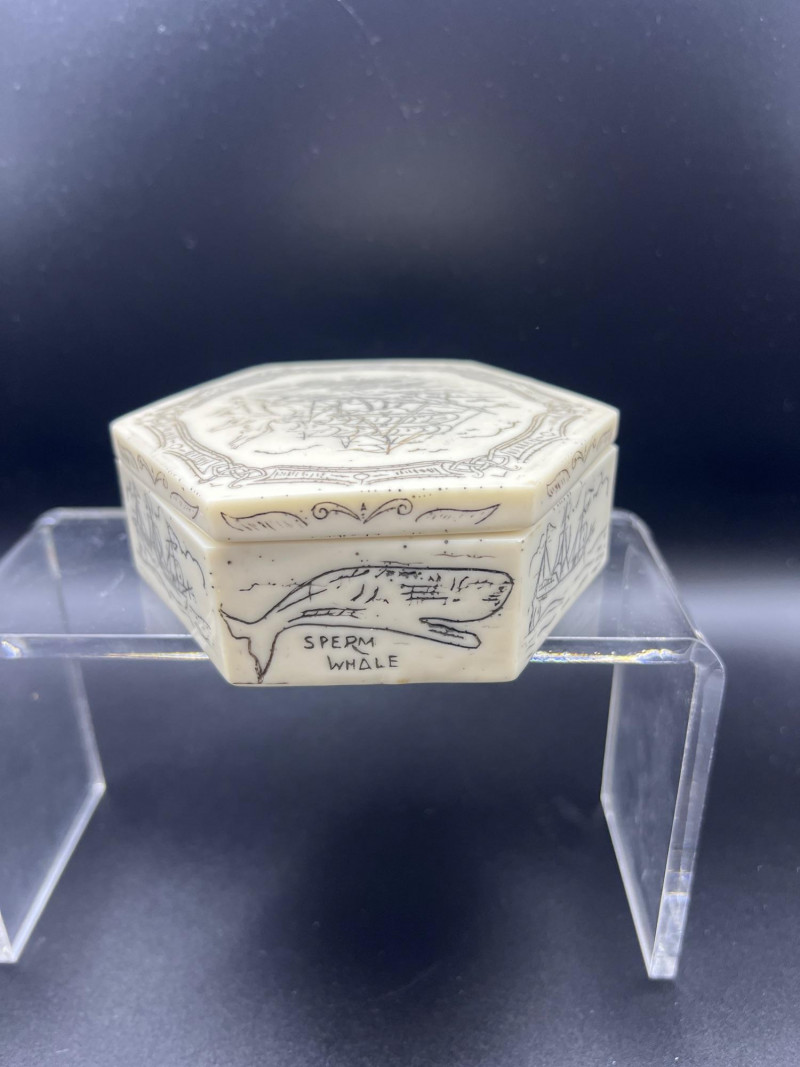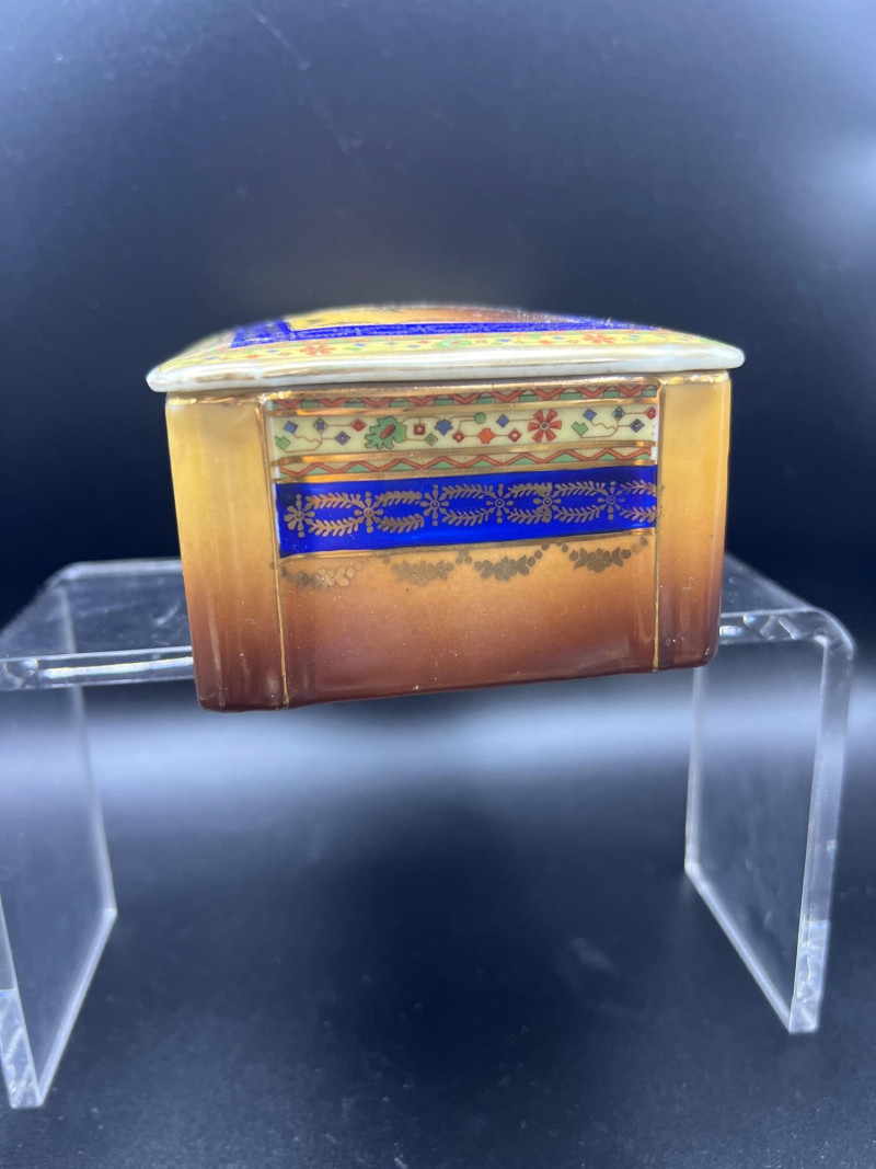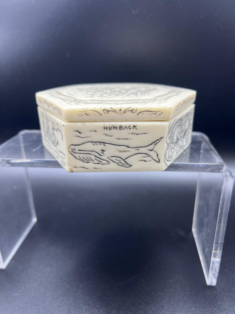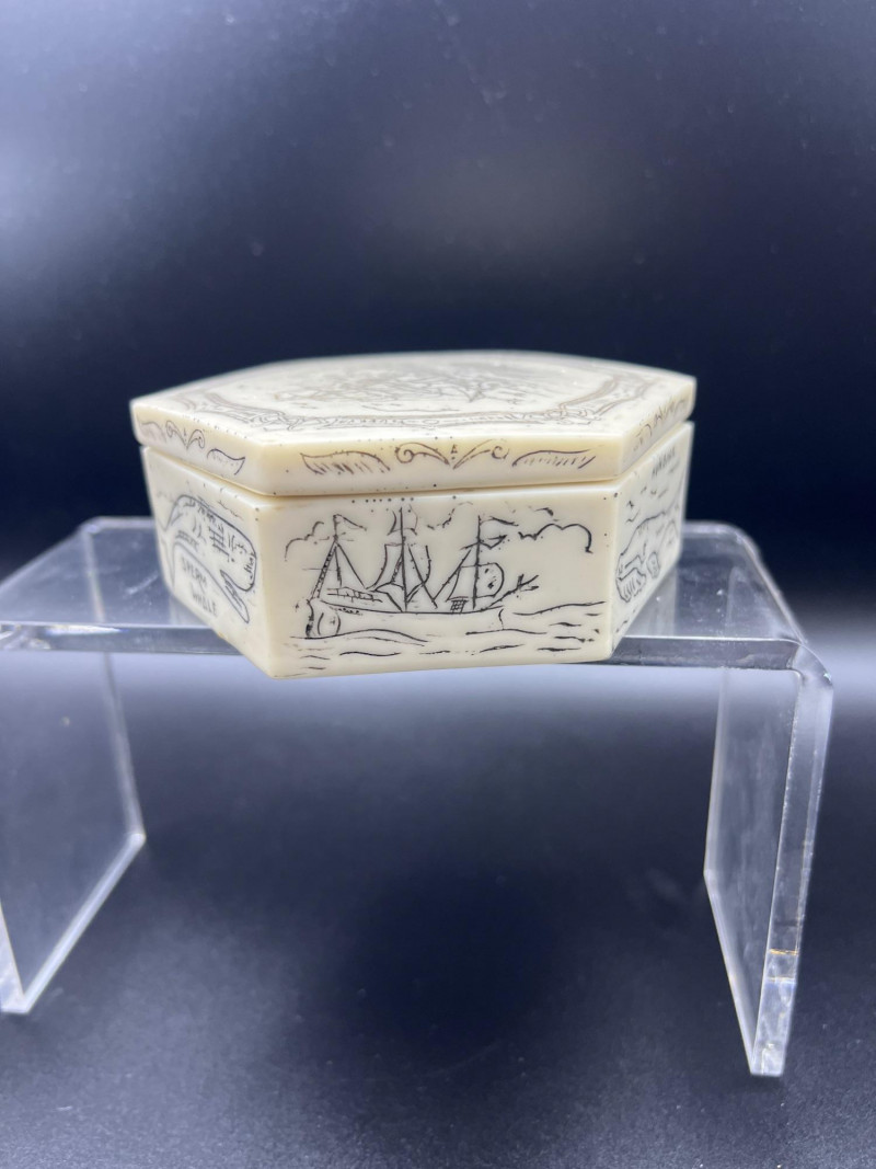Charming mixed lot of three decorative trinket boxes from different regions and eras: Gloria Czecho‑Slovakia Porcelain Box (5" length x 3.75" width x 2" tall) – Early 20th‑century export porcelain (1918–1939) with scalloped edges and classic transfer decoration. Macau Hand‑Painted Porcelain Box (4.5" round x 2.5" tall) – Mid‑century export "piece with bright enamels, figural scene, and workshop red seal; marked “Hand Painted in Macau.” Soapstone Nautical Box (4" width) – Hexagonal carved stone box featuring engraved scrimshaw‑style artwork, including a sailing ship and marine motifs. A beautifully eclectic grouping ideal for collectors of porcelain, hand‑painted export ware, and carved stone boxes.