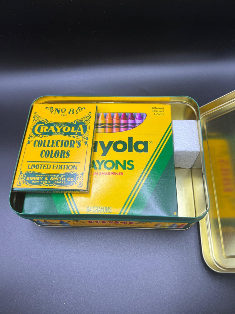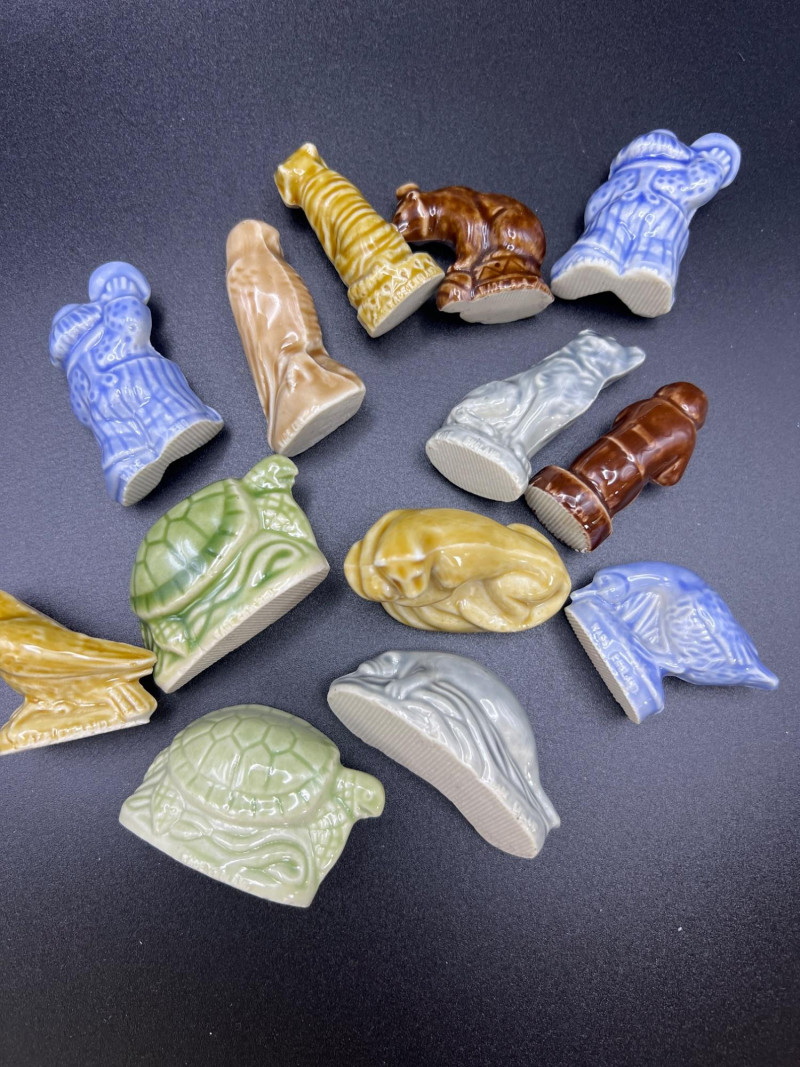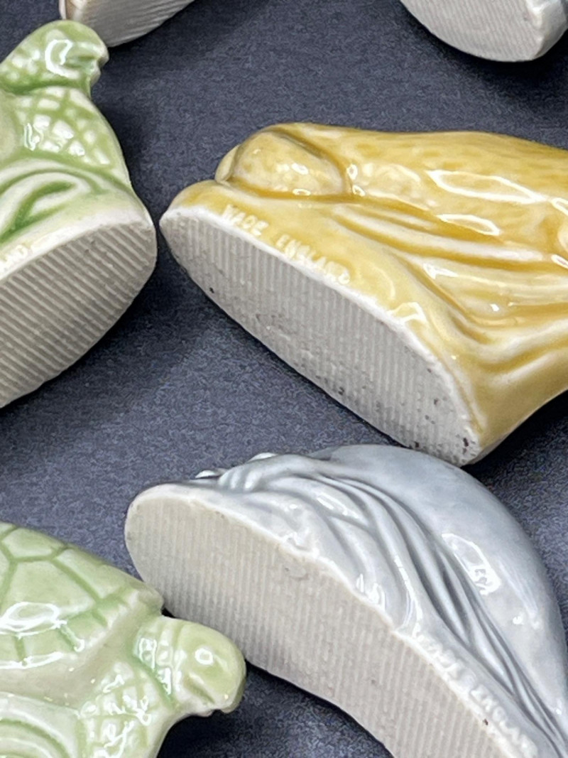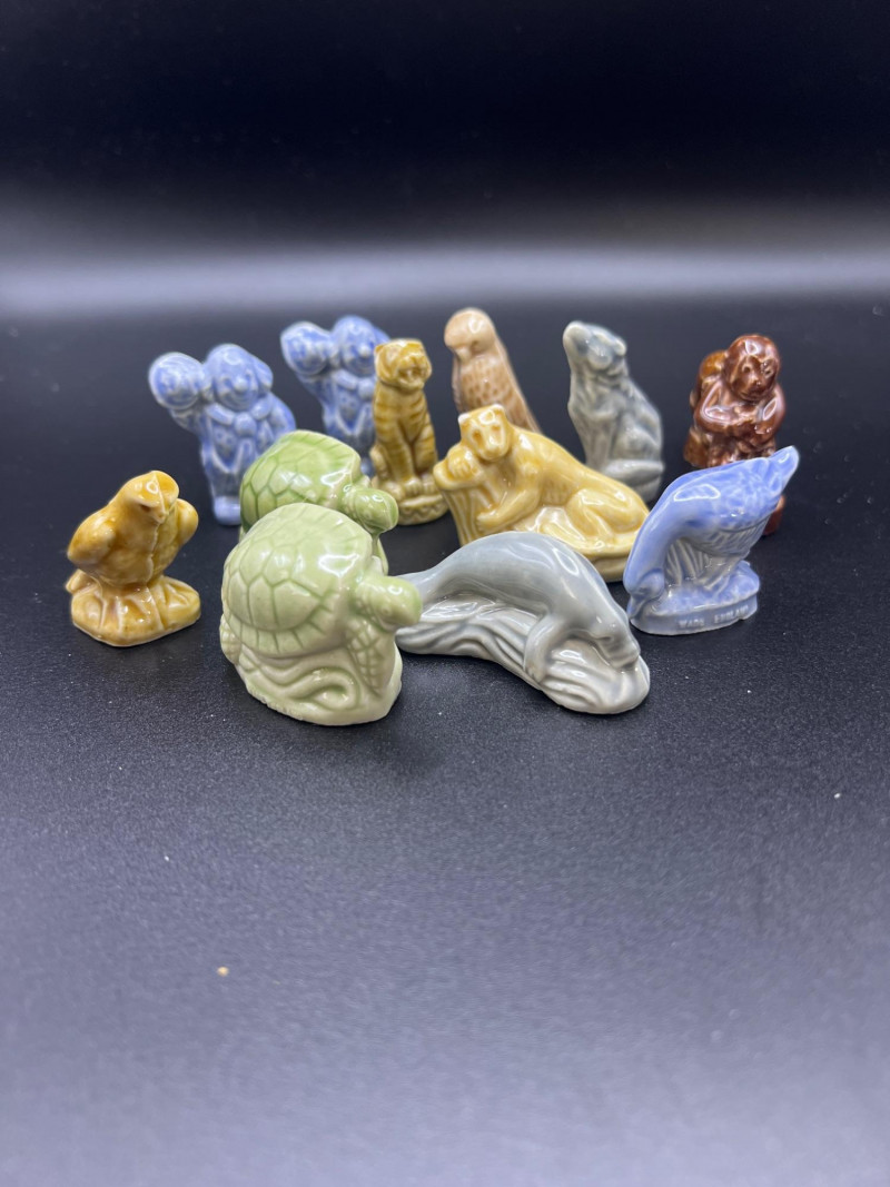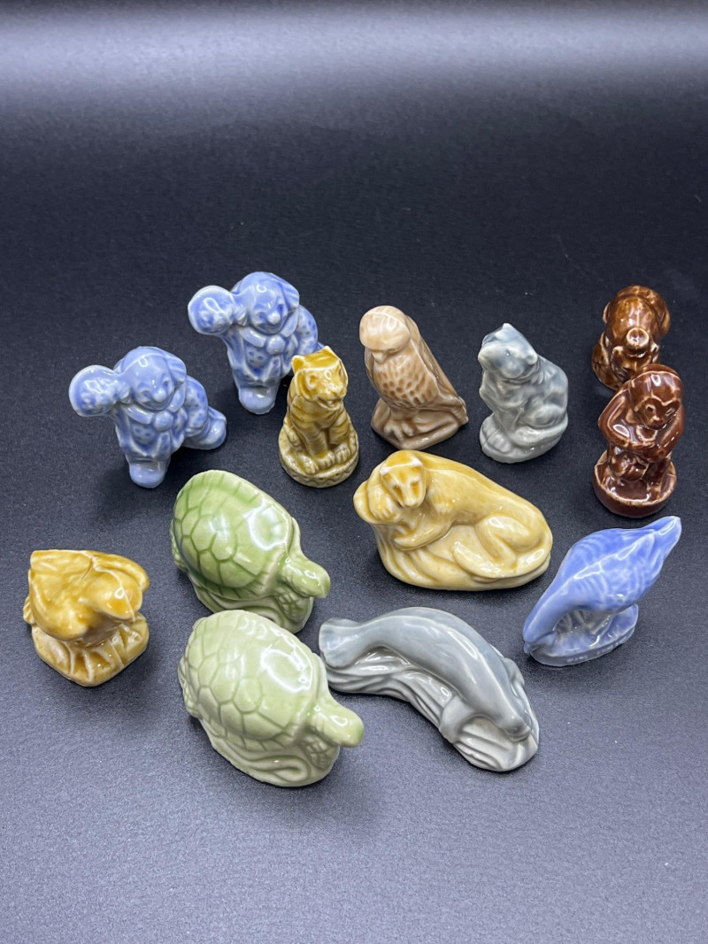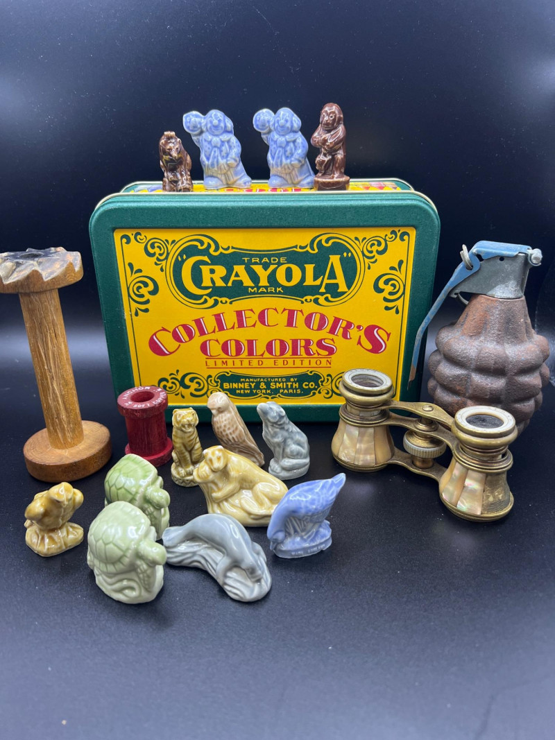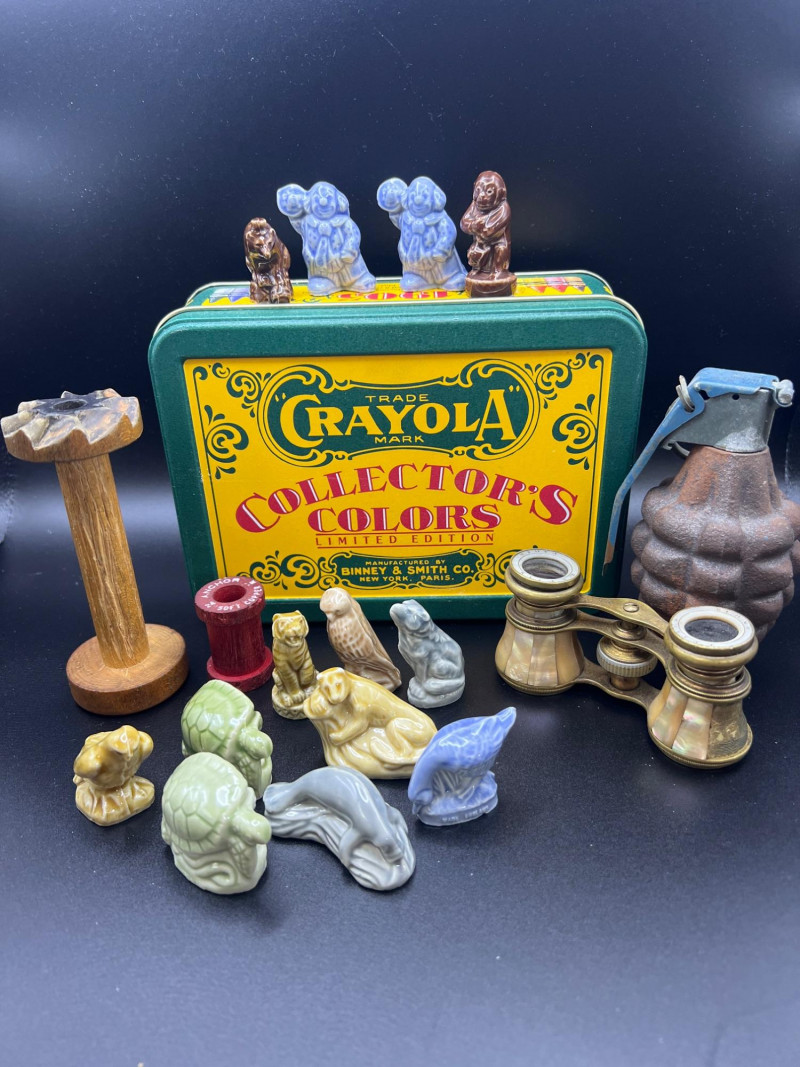 Delightfully eclectic grouping of vintage and collectible smalls, gathered as if from a whimsical cabinet of curiosities. Includes: Crayola Collector’s Colors Limited Edition Tin – Green and yellow metal tin from Binney & Smith. Assorted Miniature Wade's England Red Tea Ceramic Animals – Glazed figurines in various colors and forms, including turtles, birds, dogs, and more. Wooden Spools – Classic sewing‑room accent with red spool. Brass Opera Glasses with Mother‑of‑Pearl Inlay – Elegant vintage field glasses. Marked Linfel's Paris. Metal Grenade – Decorative or novelty piece with industrial character. A charming, whimsical mix perfect for collectors of oddities, miniatures, and vintage display pieces.