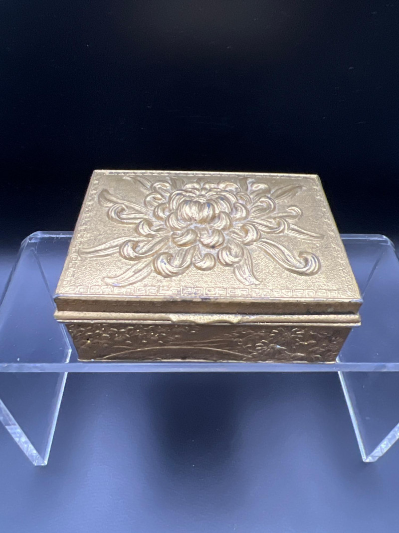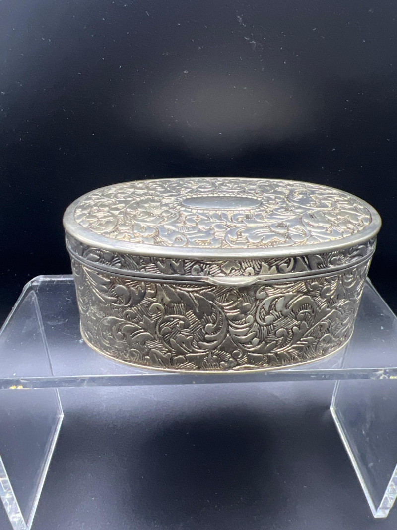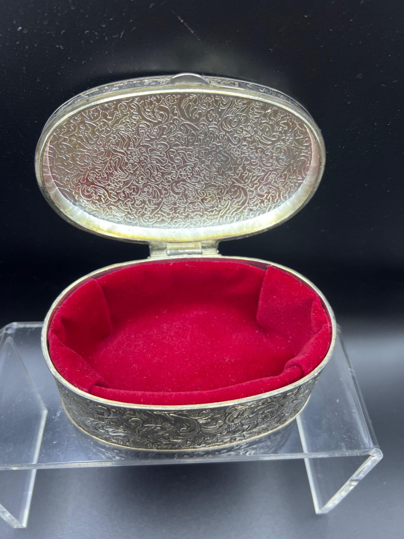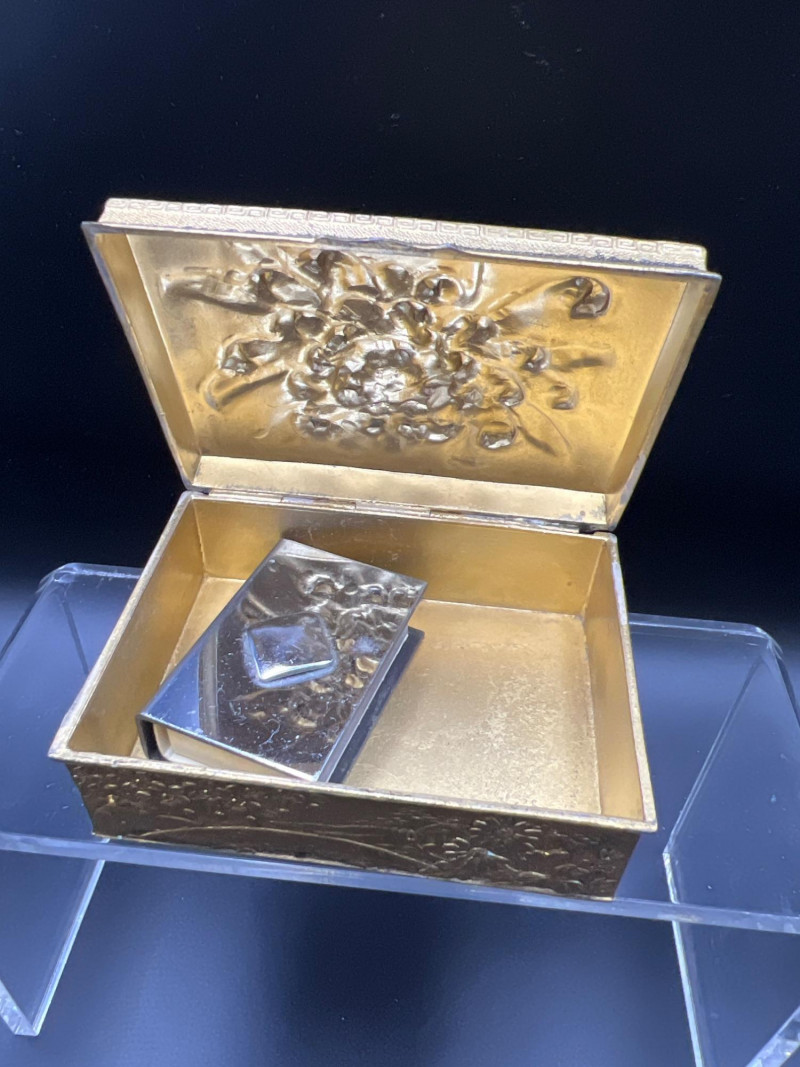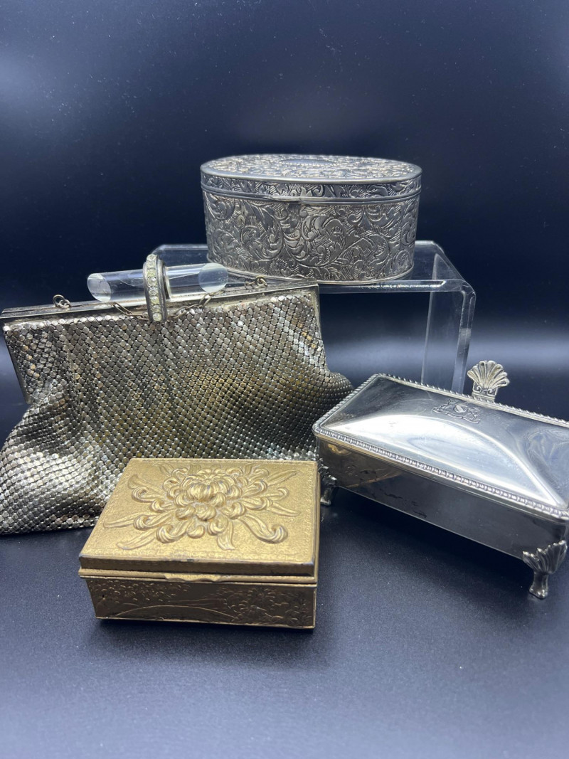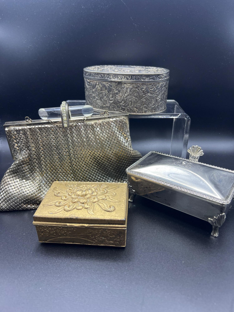 Elegant mixed‑metal vanity lot featuring a mid‑century Josef evening purse paired with three decorative metal trinket boxes: Josef Metal Mesh Evening Bag – Classic mid‑century mesh purse with structured frame and original interior mirror marked Josef. Known for its glamorous sparkle and quality craftsmanship. Gold‑Tone Embossed Trinket Box – Rectangular box with ornate floral relief and hinged lid. Metal match box holder inside. Silver‑Tone Footed Trinket Box – Domed lid with shell finial and decorative feet; hinged construction. Socket in back to insert threaded handle. FB Rogers silverplate. Oval Engraved Silver‑Tone Trinket Box – Intricate floral and leaf engraving around the body; hinged lid. A refined, display‑ready grouping ideal for collectors of vintage handbags, metalwork boxes, and mid‑century vanity décor.