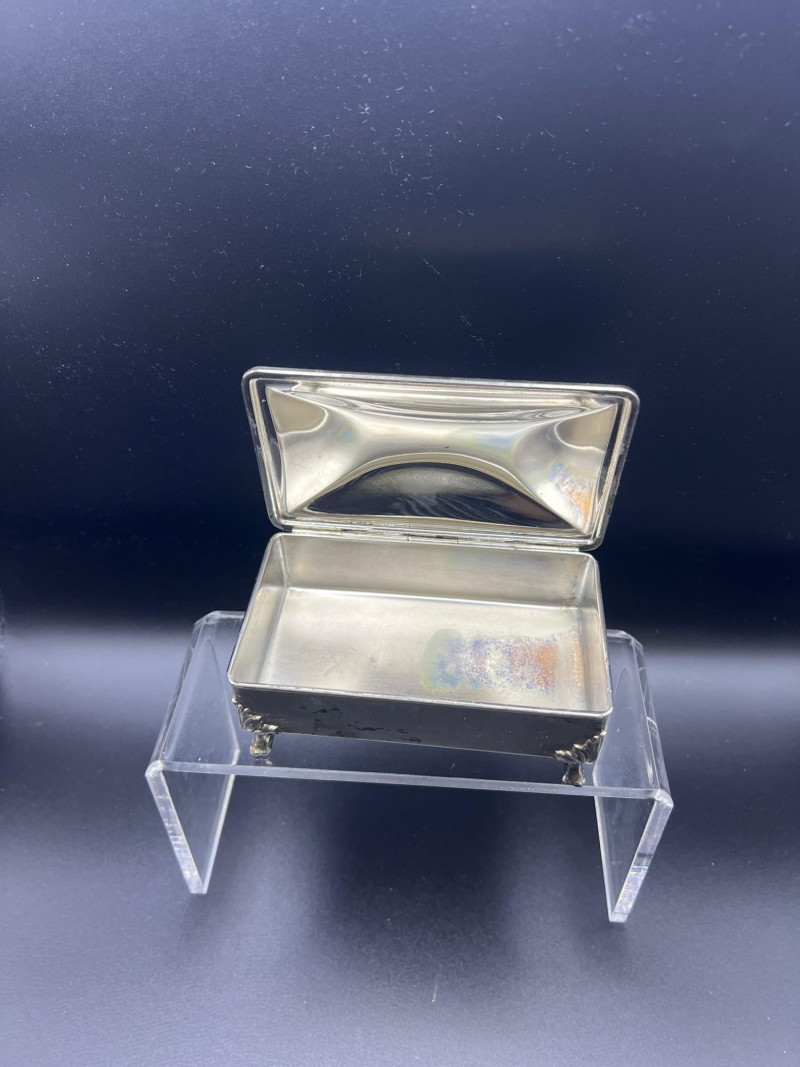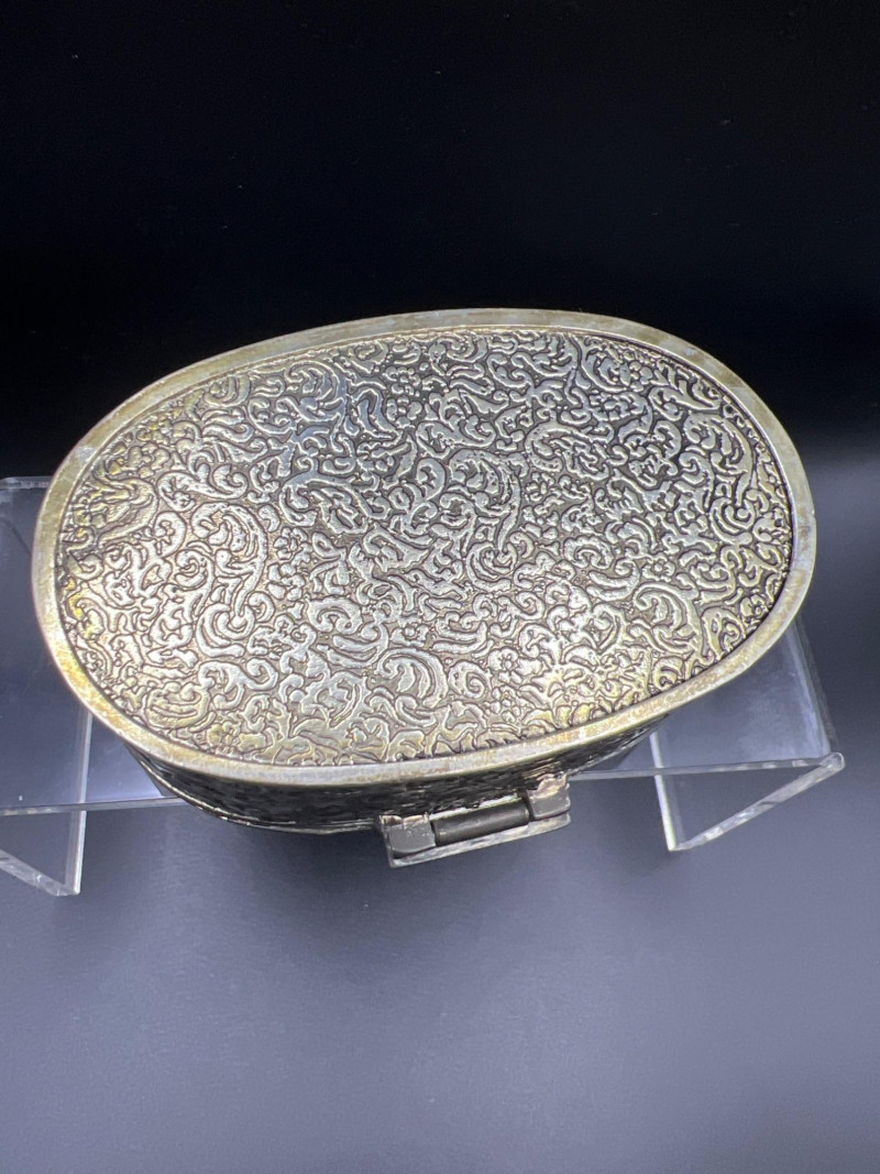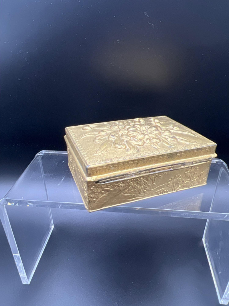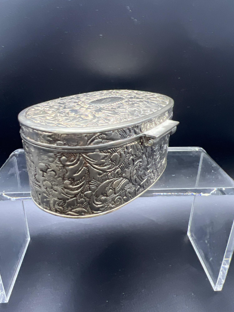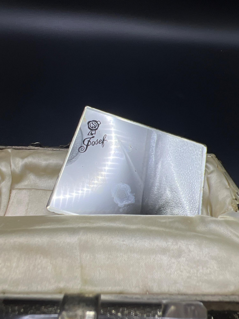 Elegant mixed‑metal vanity lot featuring a mid‑century Josef evening purse paired with three decorative metal trinket boxes: Josef Metal Mesh Evening Bag – Classic mid‑century mesh purse with structured frame and original interior mirror marked Josef. Known for its glamorous sparkle and quality craftsmanship. Gold‑Tone Embossed Trinket Box – Rectangular box with ornate floral relief and hinged lid. Metal match box holder inside. Silver‑Tone Footed Trinket Box – Domed lid with shell finial and decorative feet; hinged construction. Socket in back to insert threaded handle. FB Rogers silverplate. Oval Engraved Silver‑Tone Trinket Box – Intricate floral and leaf engraving around the body; hinged lid. A refined, display‑ready grouping ideal for collectors of vintage handbags, metalwork boxes, and mid‑century vanity décor.