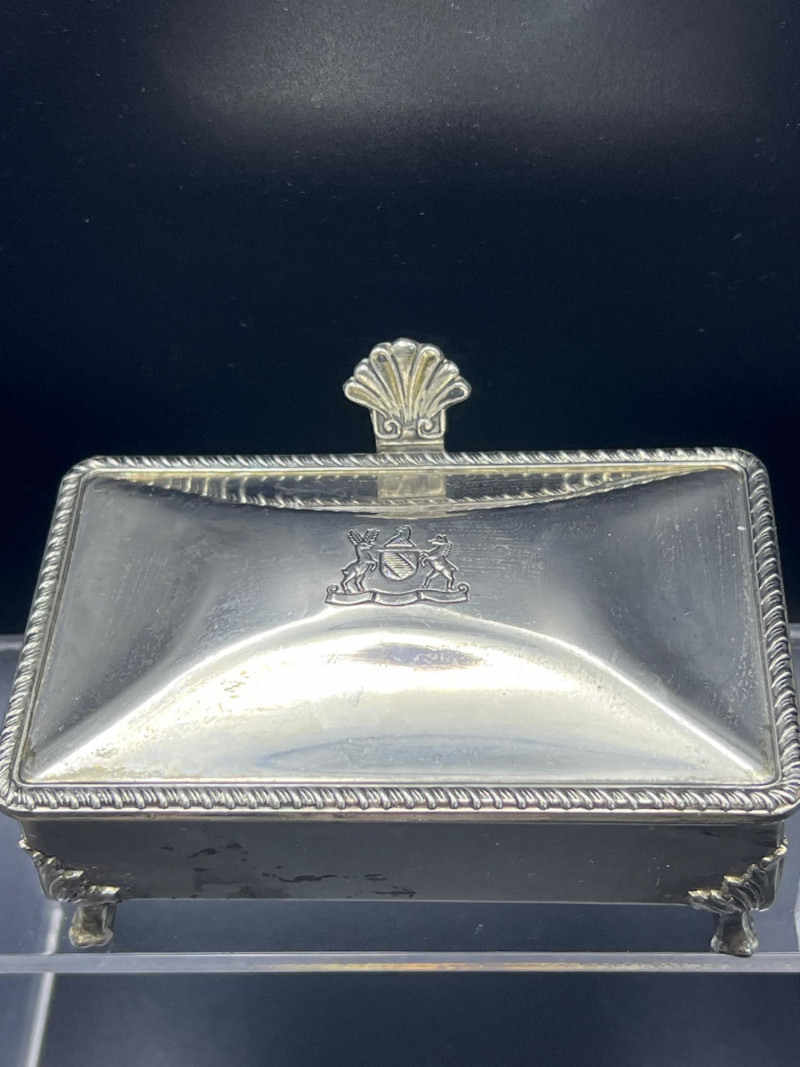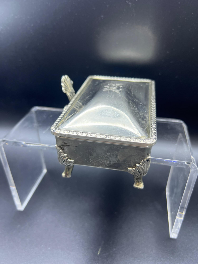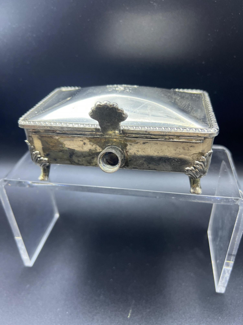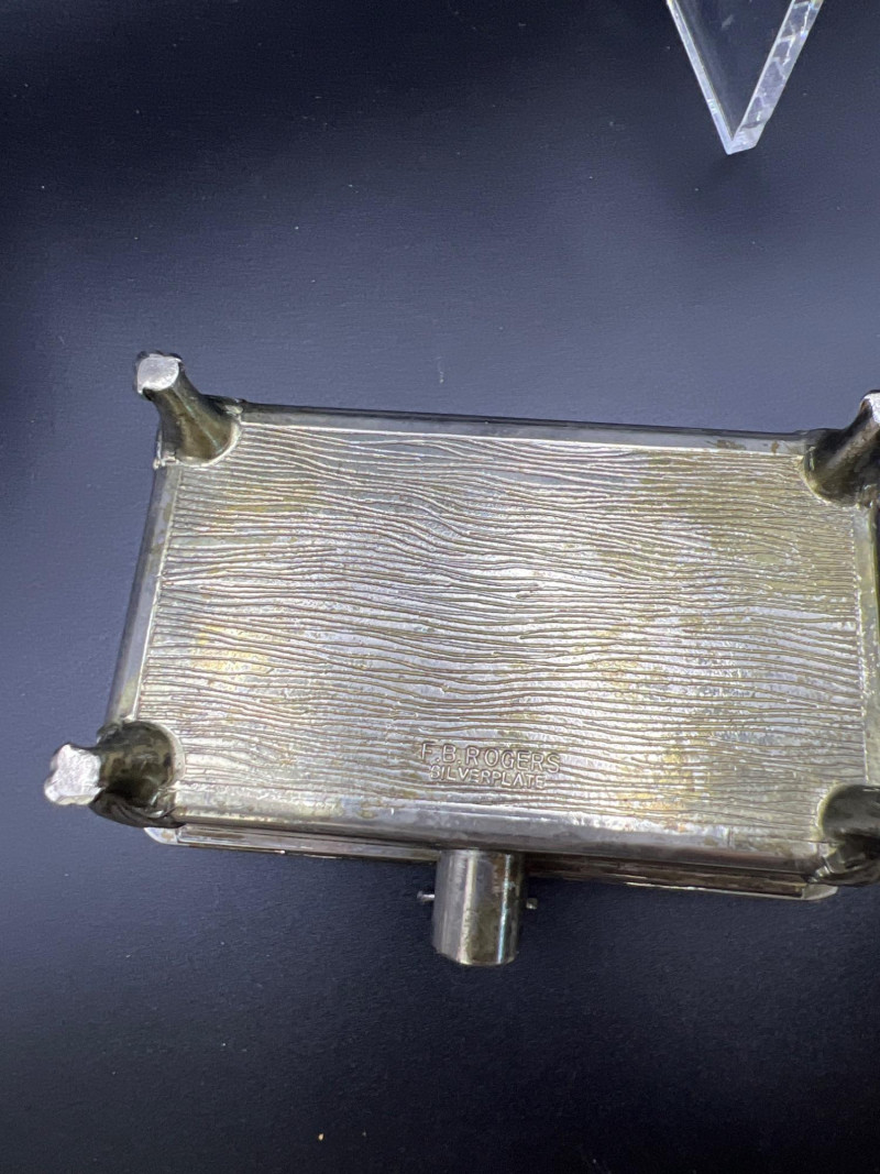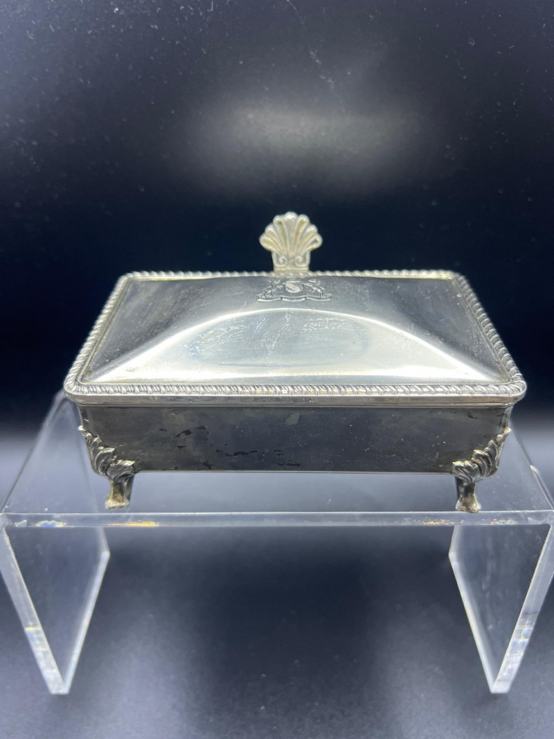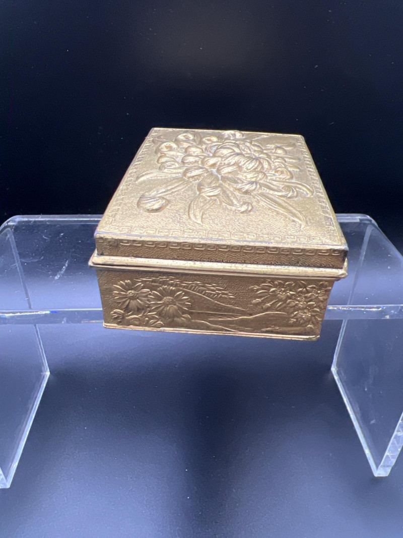 Elegant mixed‑metal vanity lot featuring a mid‑century Josef evening purse paired with three decorative metal trinket boxes: Josef Metal Mesh Evening Bag – Classic mid‑century mesh purse with structured frame and original interior mirror marked Josef. Known for its glamorous sparkle and quality craftsmanship. Gold‑Tone Embossed Trinket Box – Rectangular box with ornate floral relief and hinged lid. Metal match box holder inside. Silver‑Tone Footed Trinket Box – Domed lid with shell finial and decorative feet; hinged construction. Socket in back to insert threaded handle. FB Rogers silverplate. Oval Engraved Silver‑Tone Trinket Box – Intricate floral and leaf engraving around the body; hinged lid. A refined, display‑ready grouping ideal for collectors of vintage handbags, metalwork boxes, and mid‑century vanity décor.