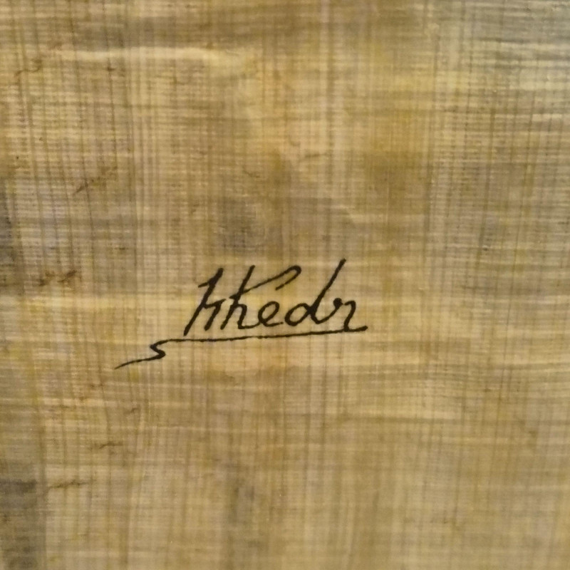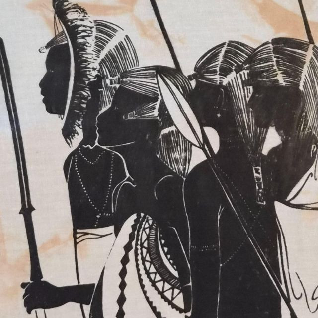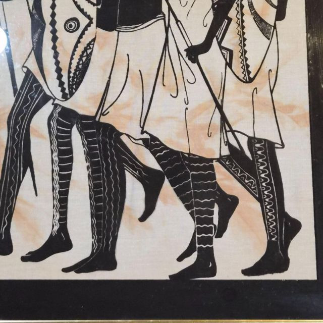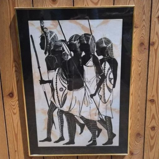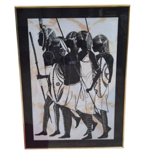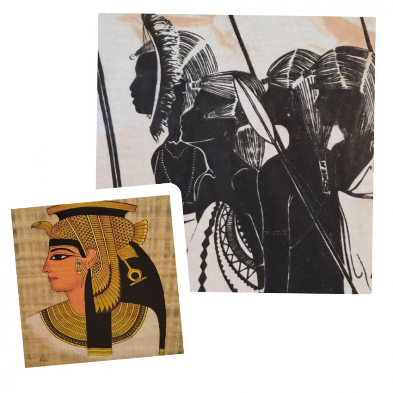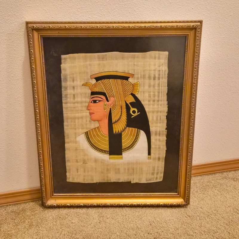 A striking duo of framed global artworks—each rich in history, symbolism, and hand‑crafted detail. 1. Cleopatra on Papyrus (Signed Khedr) 2. “Tribal Warriors” Fabric Painting by Heidi Lange Together, these framed pieces create a compelling pairing—one rooted in ancient Egyptian iconography, the other in modern textile African tribal expression—perfect for eclectic interiors, world‑art collectors, or statement wall displays.