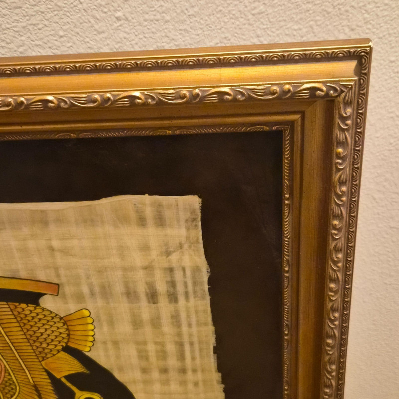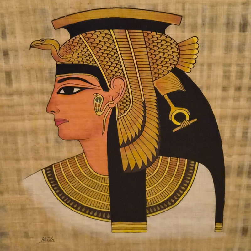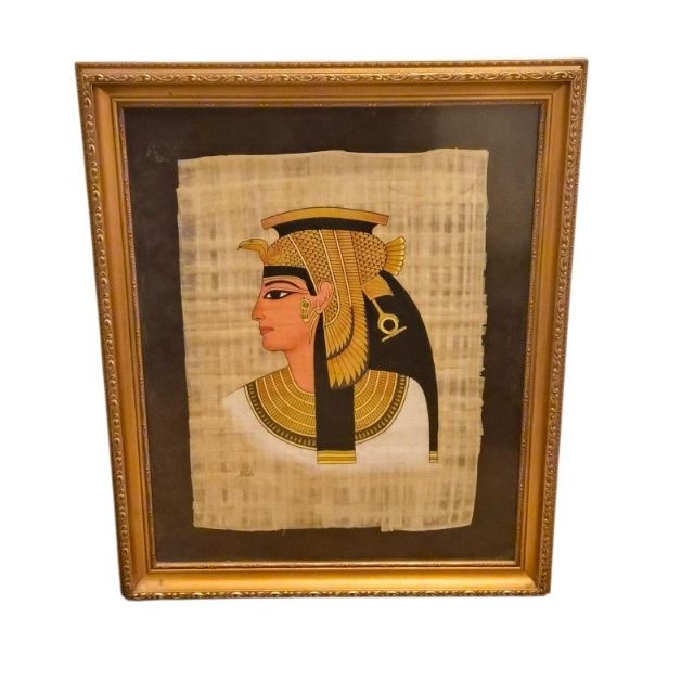 Cleopatra, often called The Last Pharaoh, is shown in regal profile wearing the traditional vulture headdress, a powerful emblem of protection and royal authority in ancient Egypt. The portrait is painted on authentic papyrus, created from layered Cyperus papyrus fibers harvested along the Nile. Presented in a gold gilt laminate frame measuring 21" x 25", this piece blends cultural heritage with timeless visual appeal.