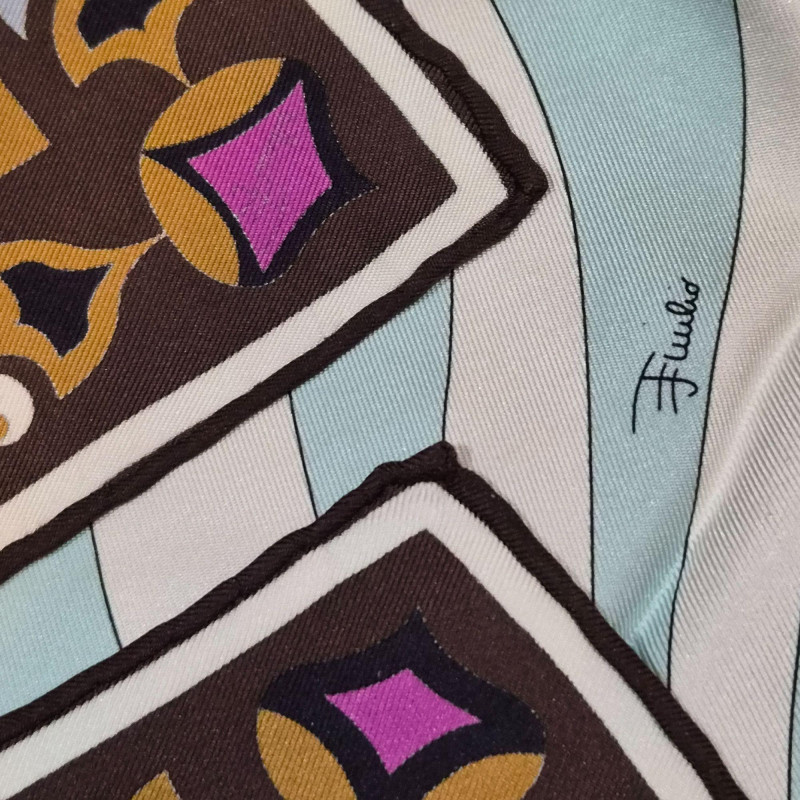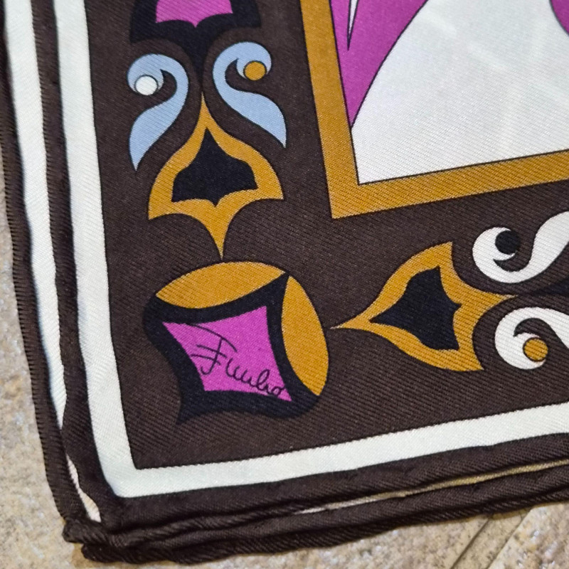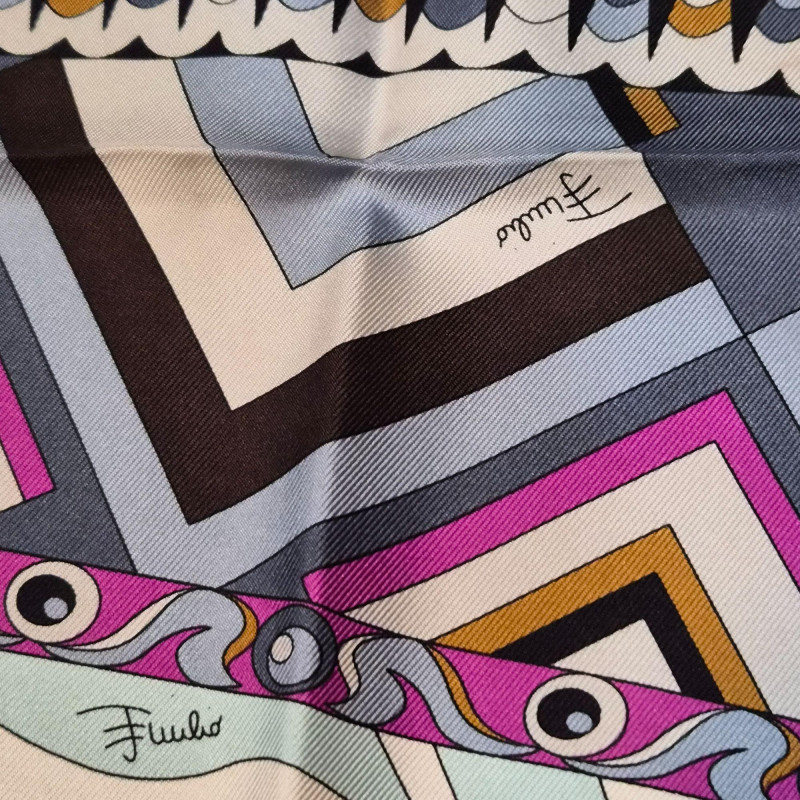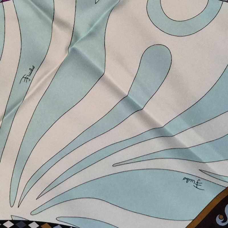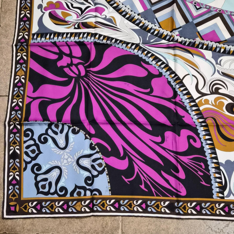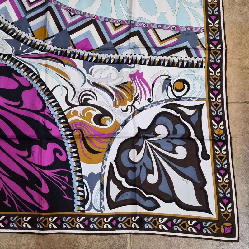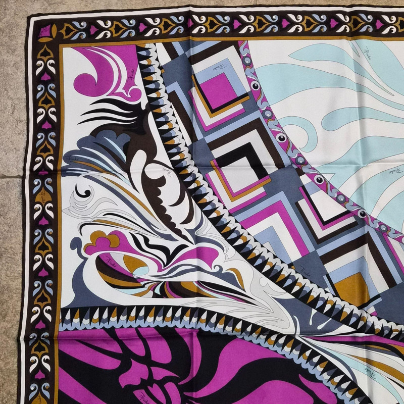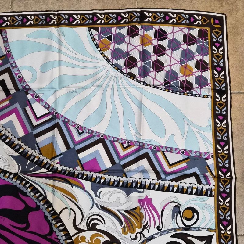 A striking Emilio Pucci pure silk scarf showcasing the designer’s iconic abstract artistry in a rich palette of purples, blues, black, white, and gold. This 34" square features swirling geometrics, floral‑inspired motifs, and bold patchwork‑style sections—an unmistakable Pucci visual symphony. The border frames the composition beautifully, making it a standout accessory whether worn or displayed. A collectible, wearable piece of fashion art—vibrant, expressive, and quintessentially Pucci.