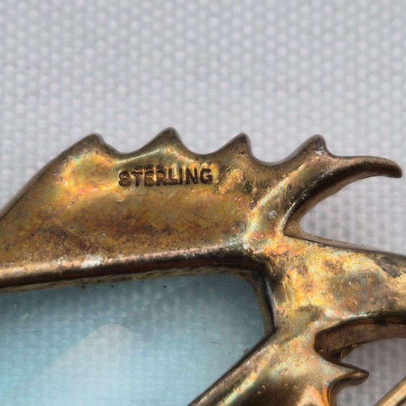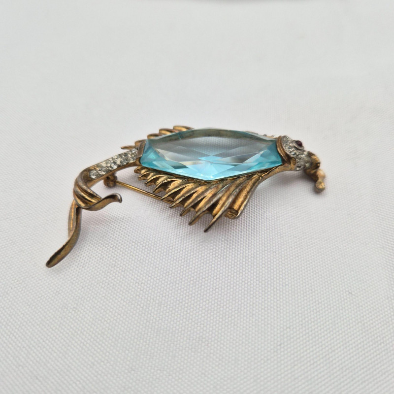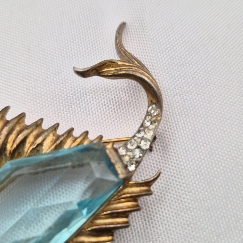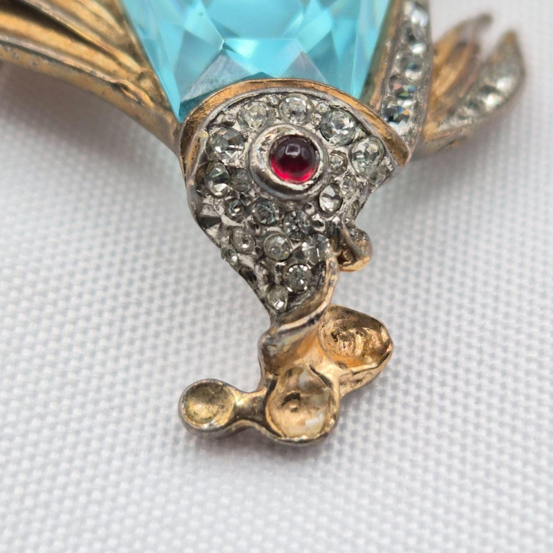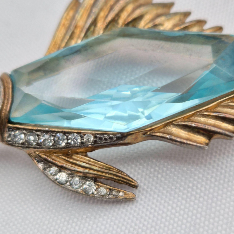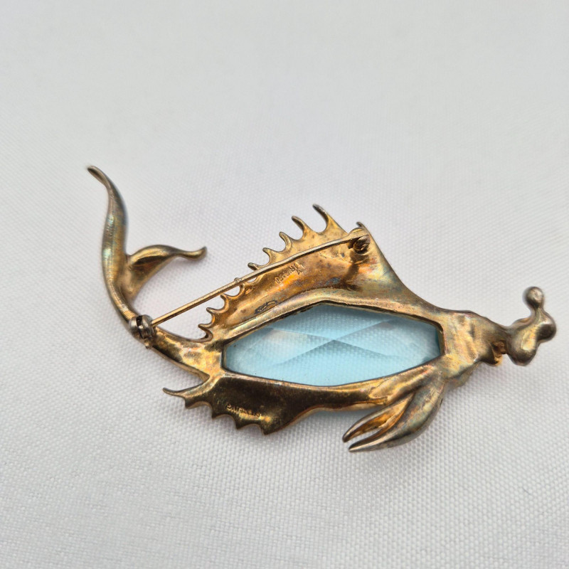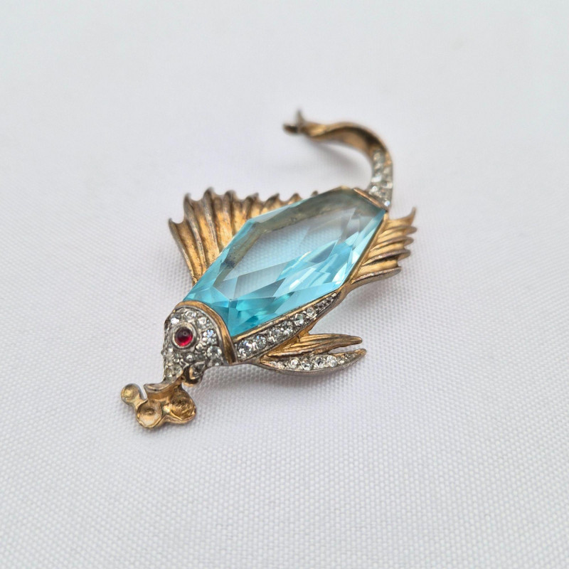 A highly sought‑after Crown Trifari sterling “Jelly Belly” fish brooch, attributed to designer Alfred Philippe and dating to the late 1940s–early 1950s. This iconic figural design features a luminous, faceted aqua blue glass stone as the fish’s body—one of the most desirable Jelly Belly styles from the era. Crafted in sterling silver with a gold wash, the brooch is hallmarked and displays classic Trifari detailing: a red stone eye, sculpted fins, and once‑sparkling clear stones along the head and “bubble” accents. It currently shows two missing clear stones on the top of the head and missing pearl‑style bubbles near the mouth. With proper restoration, this could be a tremendous value, as similar examples are considered “book pieces” in vintage costume jewelry collecting.