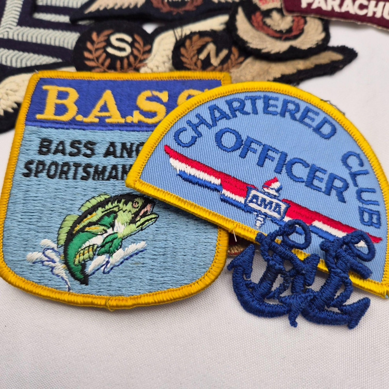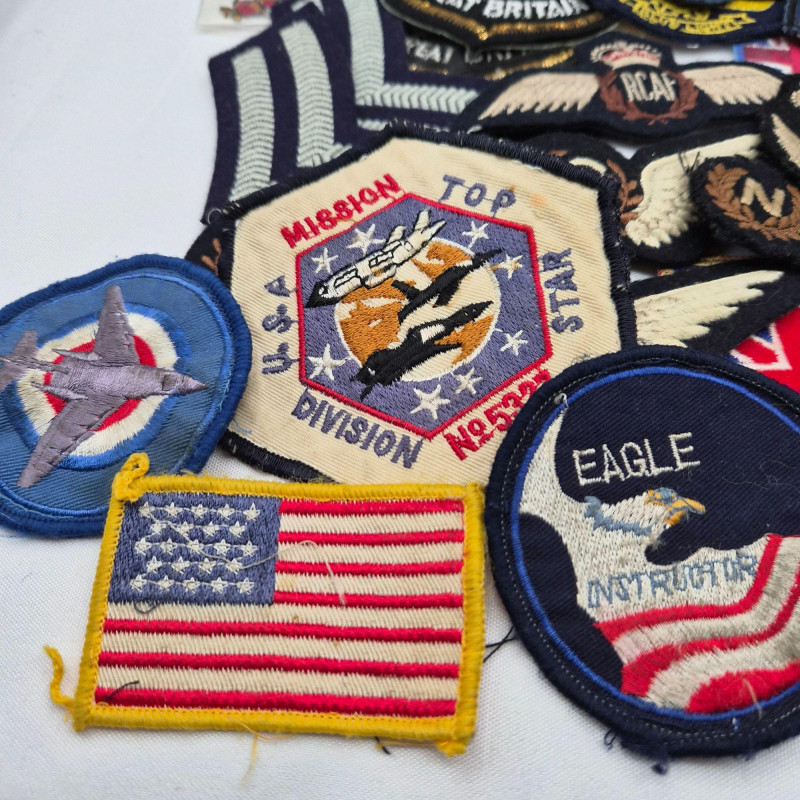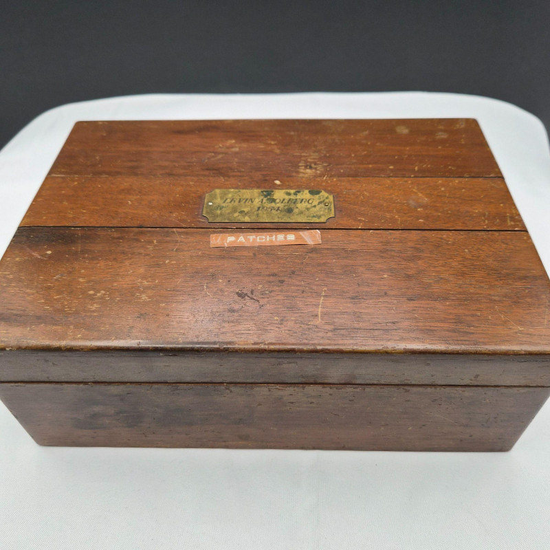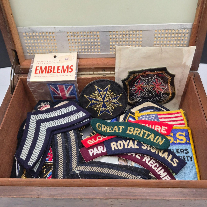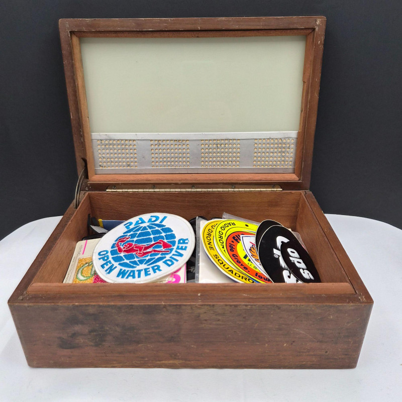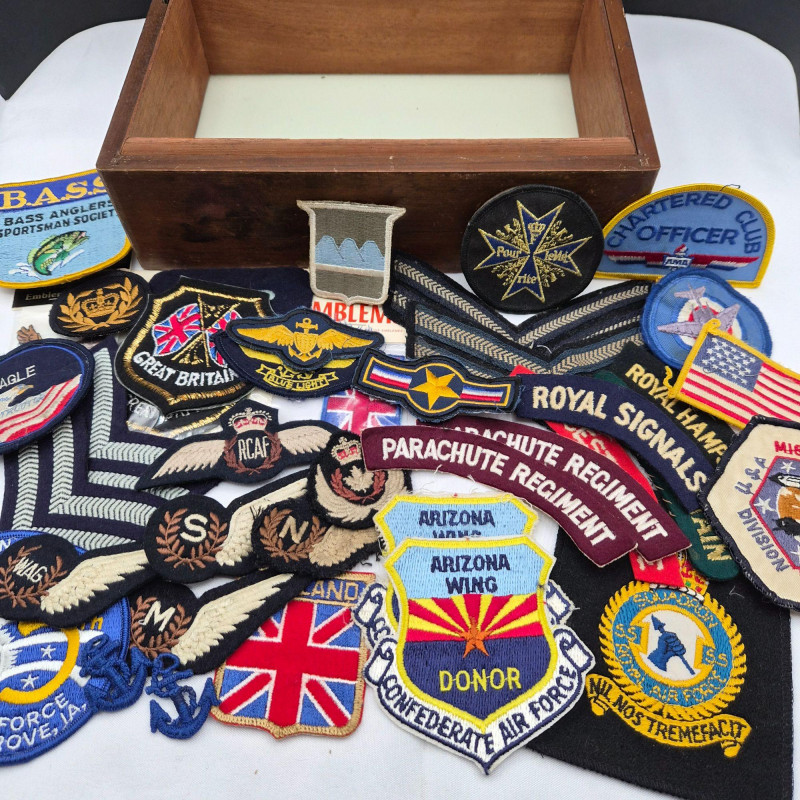 A character‑rich wood storage box—measuring 10.75" x 7.5" x 4.25"—packed with an eclectic assortment of vintage embroidered patches and stickers. This mix spans decades and themes, offering a treasure‑hunt experience for collectors, crafters, and nostalgia lovers. Inside you’ll find a variety of WWII‑era and military patches, along with pieces representing Great Britain, the United States, Mt. St. Helens ’80, and more. A fun, varied collection with history, color, and personality. A great lot for display, resale, or creative projects—full of discovery and vintage charm.