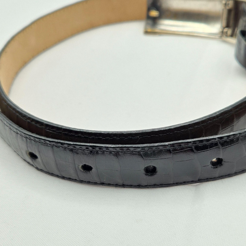 Classic black leather with embossed croc texture and a two‑tone buckle for subtle shine.