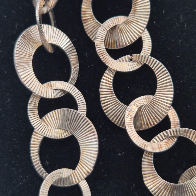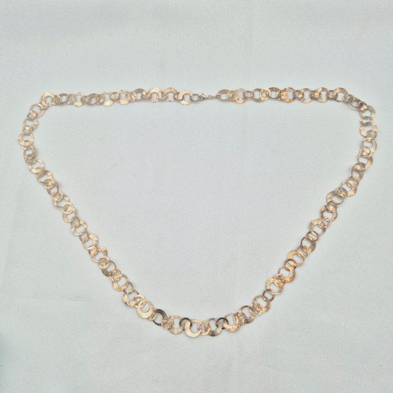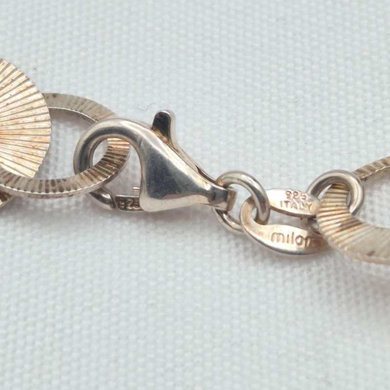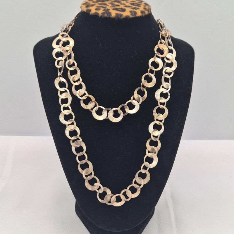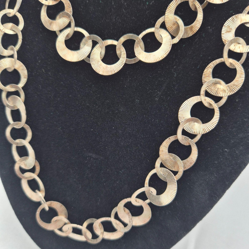 A striking gold‑wash sterling silver chain necklace by Milor Italy, known for its high‑quality Italian craftsmanship and bold, sculptural metalwork. This long 34-inch chain features deeply textured circular links, each with fine radial grooves that catch the light beautifully, giving the necklace a dimensional, almost sunburst‑like shimmer. The links are substantial yet fluid, creating a dramatic drape that works equally well as a standalone statement or layered with other chains. The necklace weighs 40.8 grams, offering a satisfying, quality feel without being overly heavy. A gorgeous piece for collectors of Italian silver, lovers of bold gold‑tone chains, or anyone seeking a versatile statement necklace with vintage sophistication.