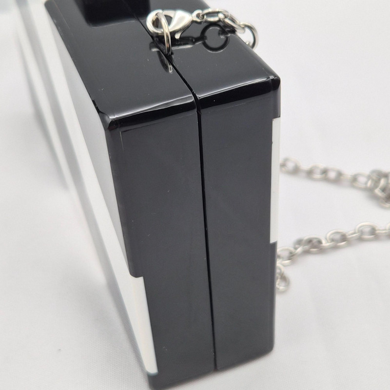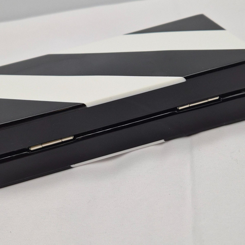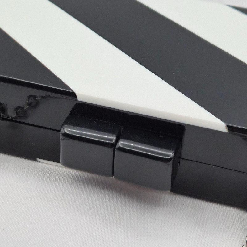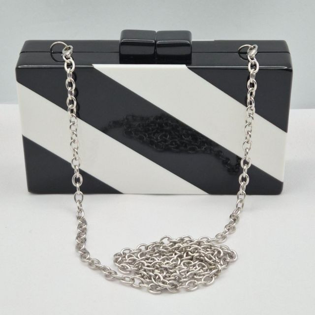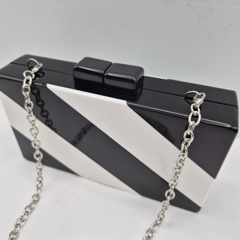 A bold 1980s‑inspired La Regale acrylic box‑style purse, featuring striking black and white diagonal stripes in a glossy, hard‑shell design. This hinged clutch has a clean, sculptural silhouette with a magnetic closure and a removable long silvertone chain strap, allowing it to shift effortlessly from shoulder bag to handheld evening clutch. A standout accessory with unmistakable retro flair—perfect for collectors, evening wear, or anyone who loves a bold 1980s fashion moment.