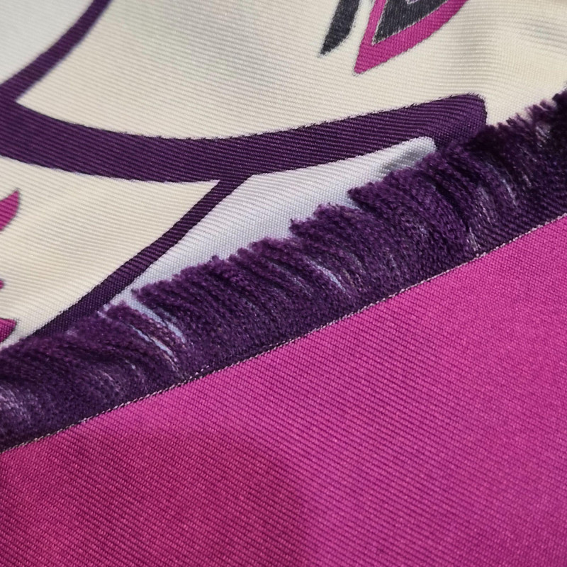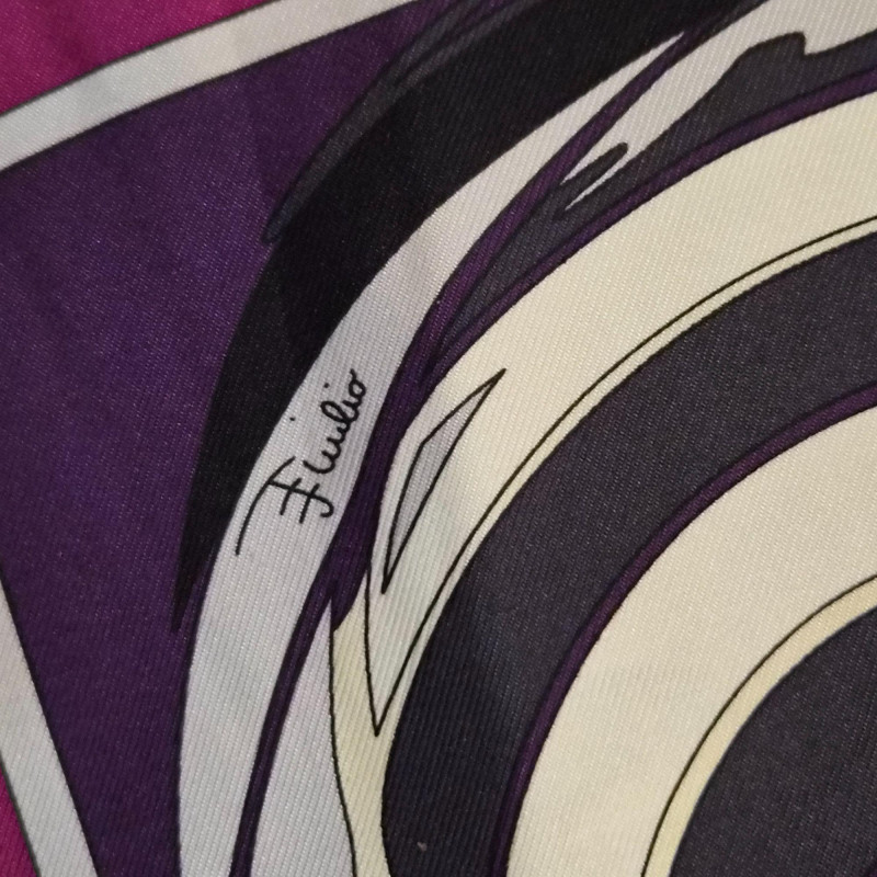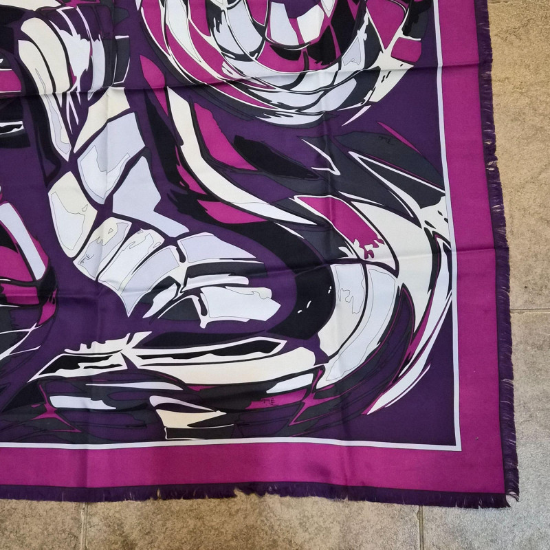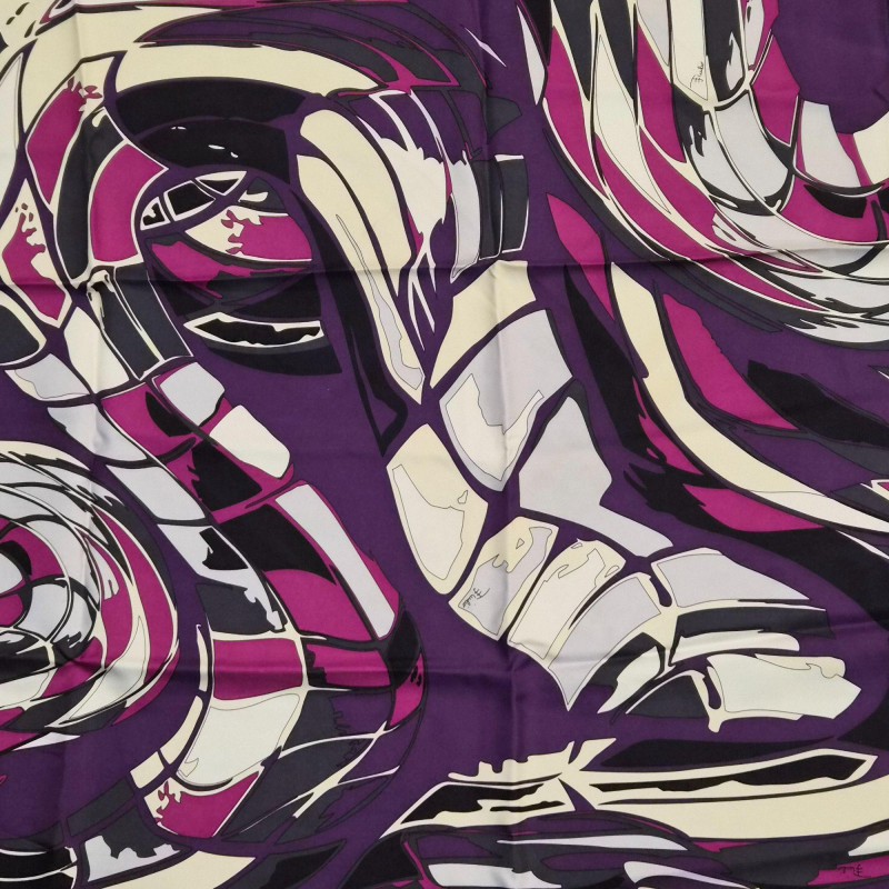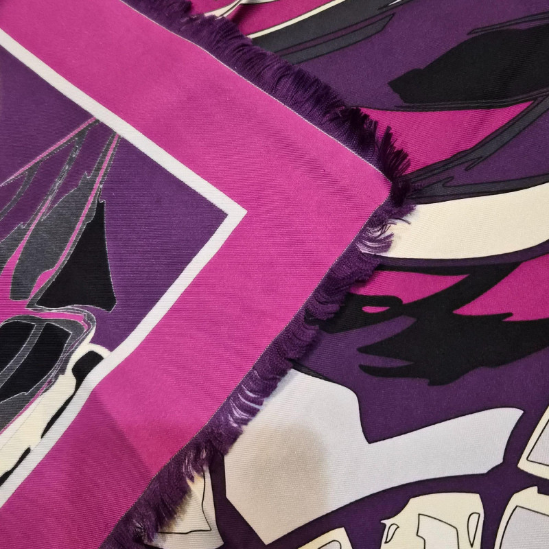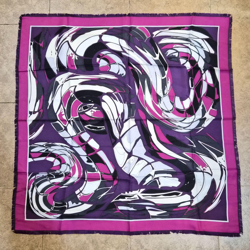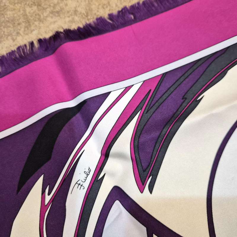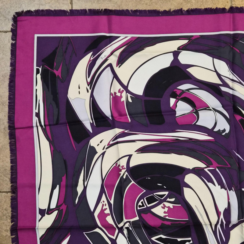 A striking Emilio Pucci silk scarf featuring a bold, flowing abstract ribbon design in rich shades of purple, magenta, black, and white. The composition has that unmistakable Pucci sense of movement—curved, interwoven shapes that feel dynamic and sculptural. The scarf is finished with a solid magenta outer border and a crisp white inner frame, giving the artwork a clean, elevated edge. Soft fringe adds a touch of texture and relaxed elegance, making this piece equally suited for wearing, styling on a handbag, or displaying as textile art. A vibrant, modern Pucci statement piece—bold, collectible, and instantly eye‑catching.