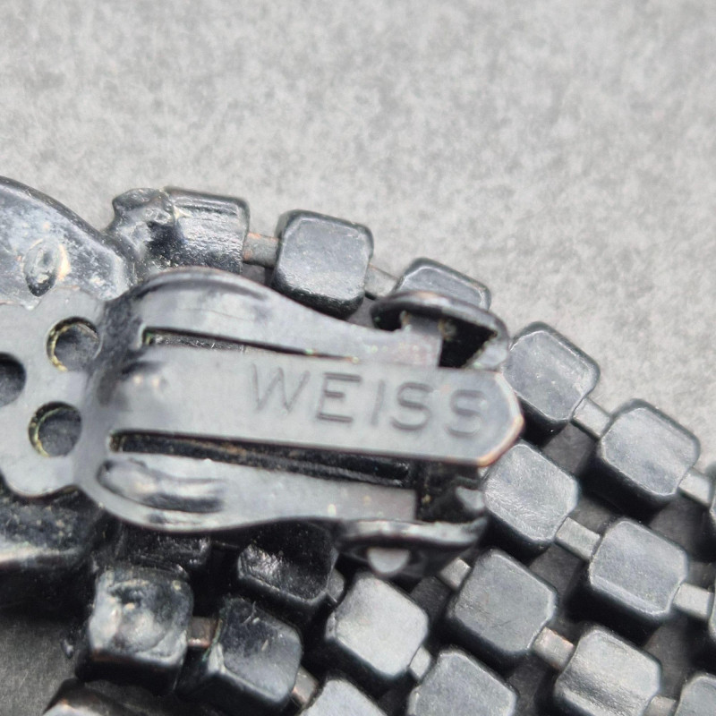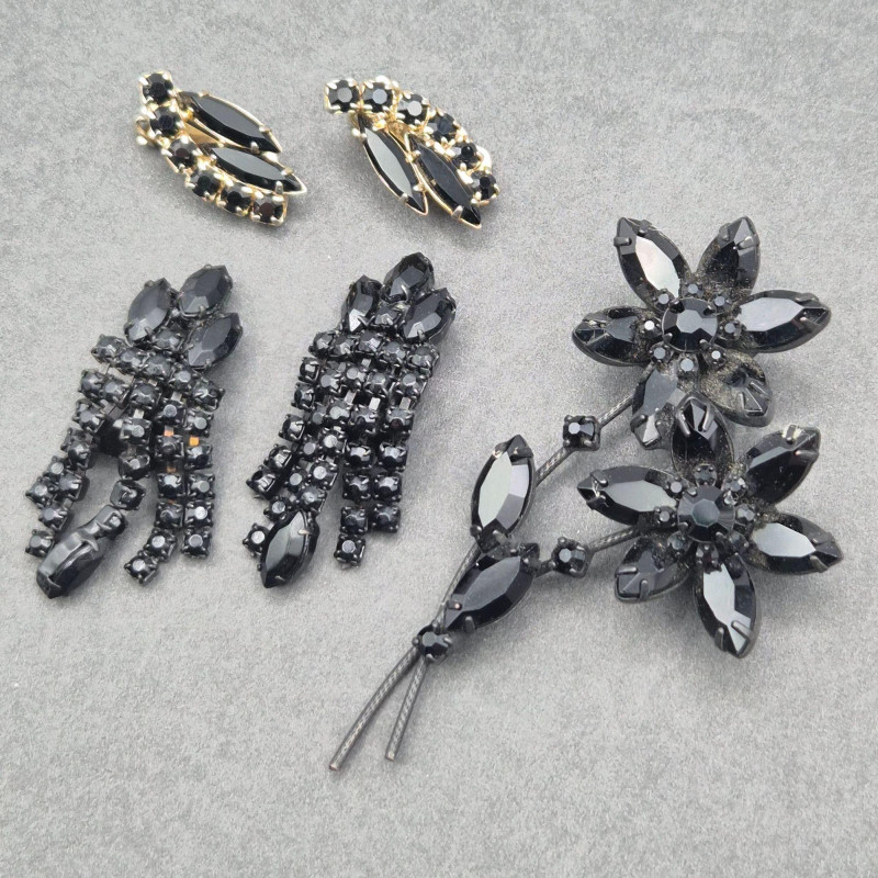A dramatic jet‑black rhinestone set featuring a bold Weiss brooch with coordinating clip earrings, plus an additional pair of goldtone clip earrings for added versatility. All stones are prong‑set and intact, with excellent sparkle against the darkened metal settings. Included Pieces The rhinestones are bright and all prong‑set, with no missing stones. The metal shows some wear on the back, consistent with age and use, but the front presentation remains striking.