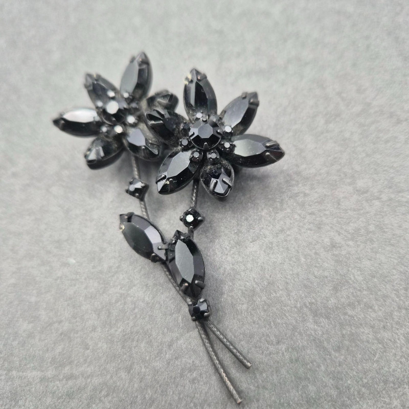 A layered floral design in a blackened setting, packed with faceted jet rhinestones that create deep, dimensional shine.