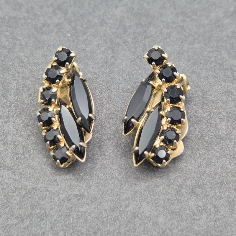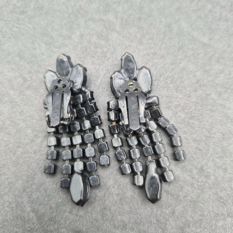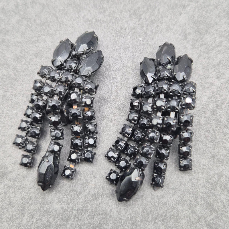 Coordinating black rhinestone earrings with matching darkened metal, designed to pair perfectly with the brooch.
