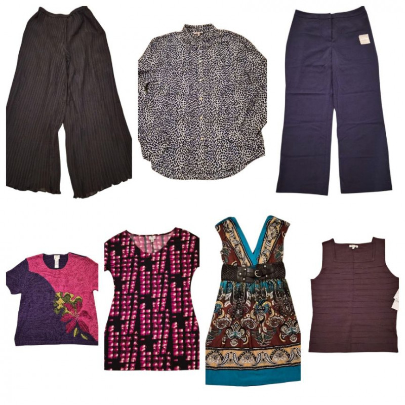 A versatile bundle of five tops and two pairs of pants, featuring a range of silhouettes, fabrics, and well‑known makers. Most pieces fall within the Medium–Large size range, offering flexible fit options. Brands included: Style Variety: