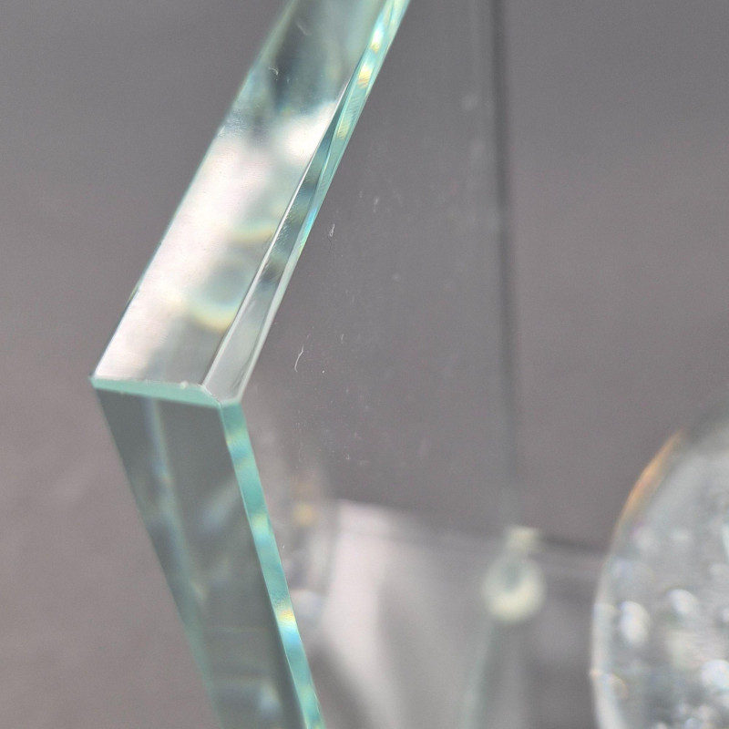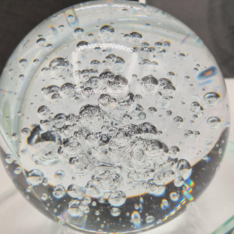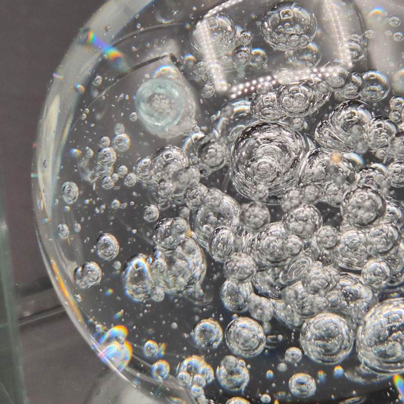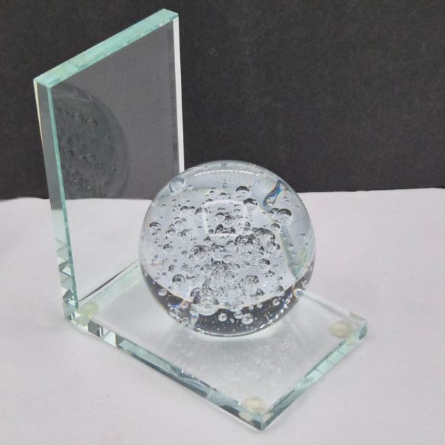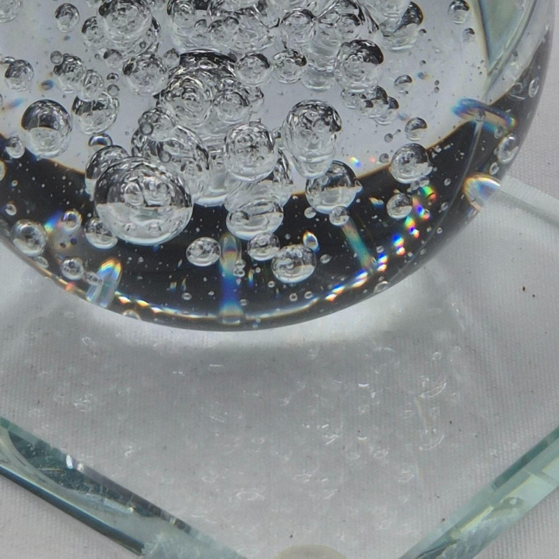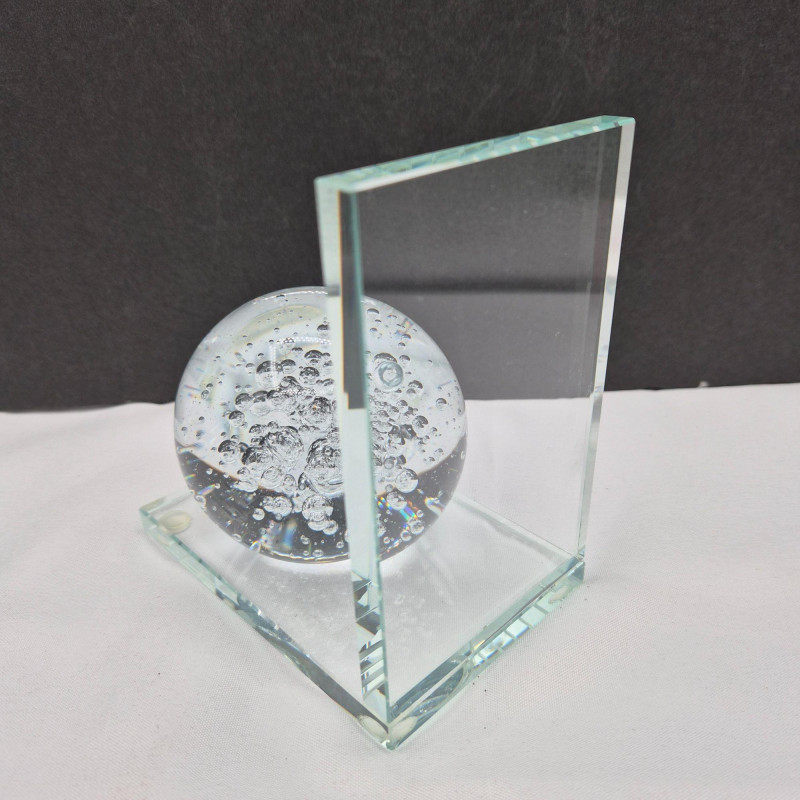 A sculptural single crystal bubble sphere bookend, featuring a 3-inch clear orb filled with suspended air bubbles that create mesmerizing light play. The sphere is mounted on a sleek L‑shaped beveled crystal stand. This piece blends modern elegance with classic glass artistry—perfect as a standalone decorative accent or as a functional bookend. A beautiful choice for lovers of contemporary décor, art glass collectors, or anyone who appreciates clean, luminous design.