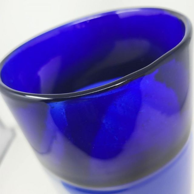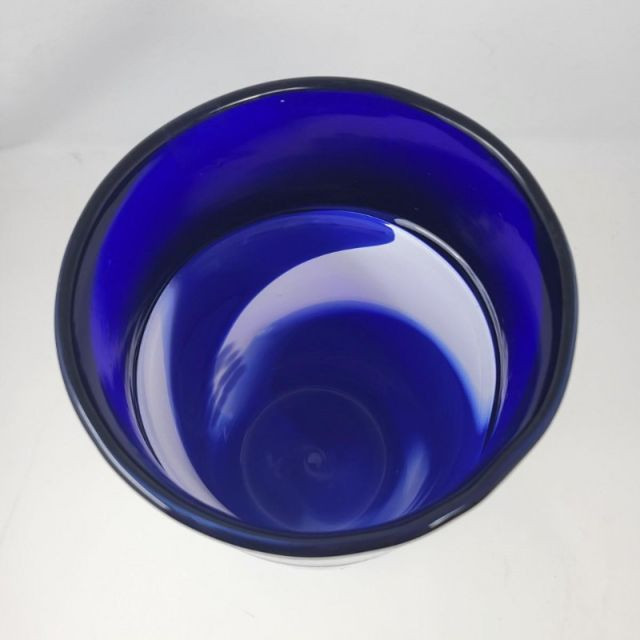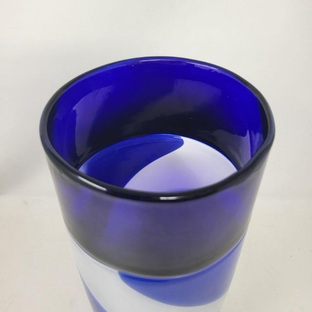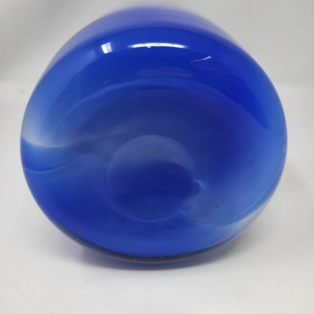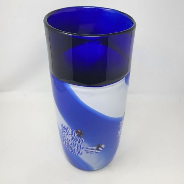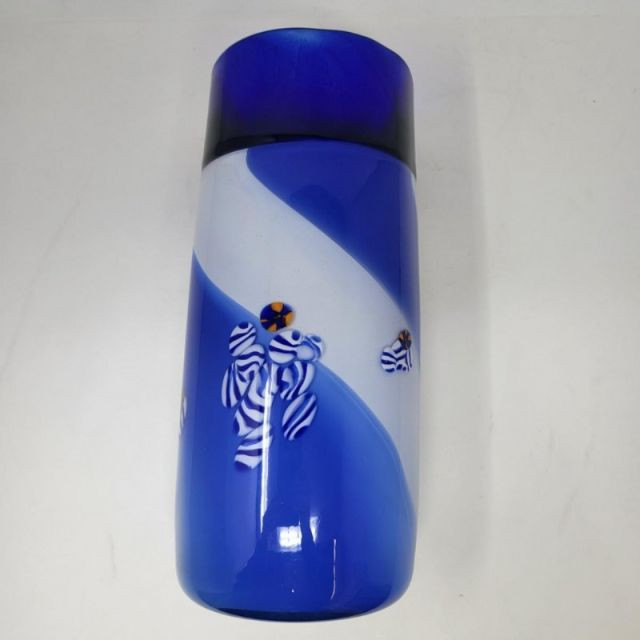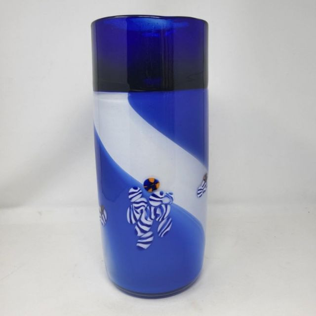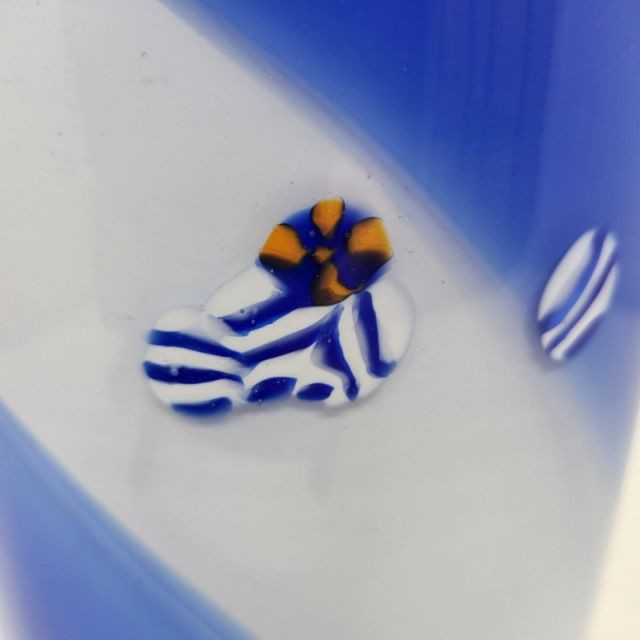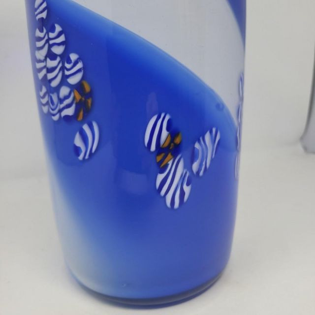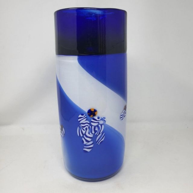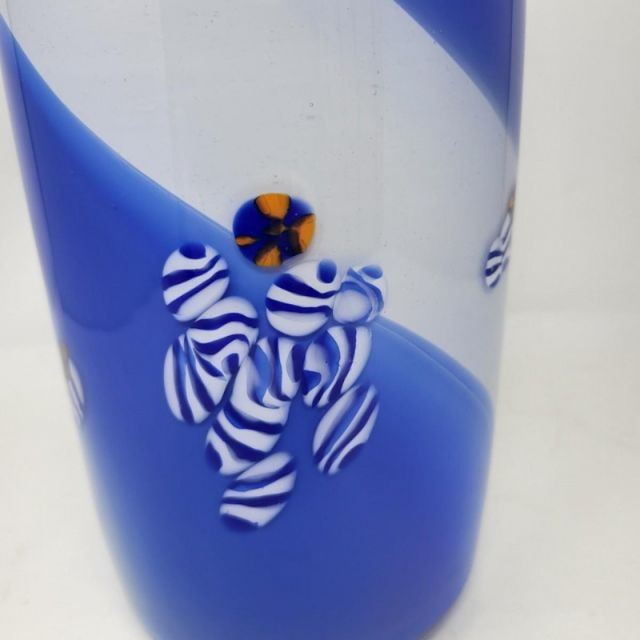 A striking 13-inch Murano‑style art glass vase showcasing bold color, fluid motion, and classic Venetian inspiration. The form features a deep cobalt blue top that flows into a white and blue swirled body, creating a dynamic sense of movement throughout the piece. A playful millefiori stripe and scattered millefiori spots add bursts of color and texture, giving the vase a lively, handcrafted character reminiscent of traditional Murano artistry. A beautiful choice for collectors of Murano‑style glass or anyone who loves bold, expressive colorwork.