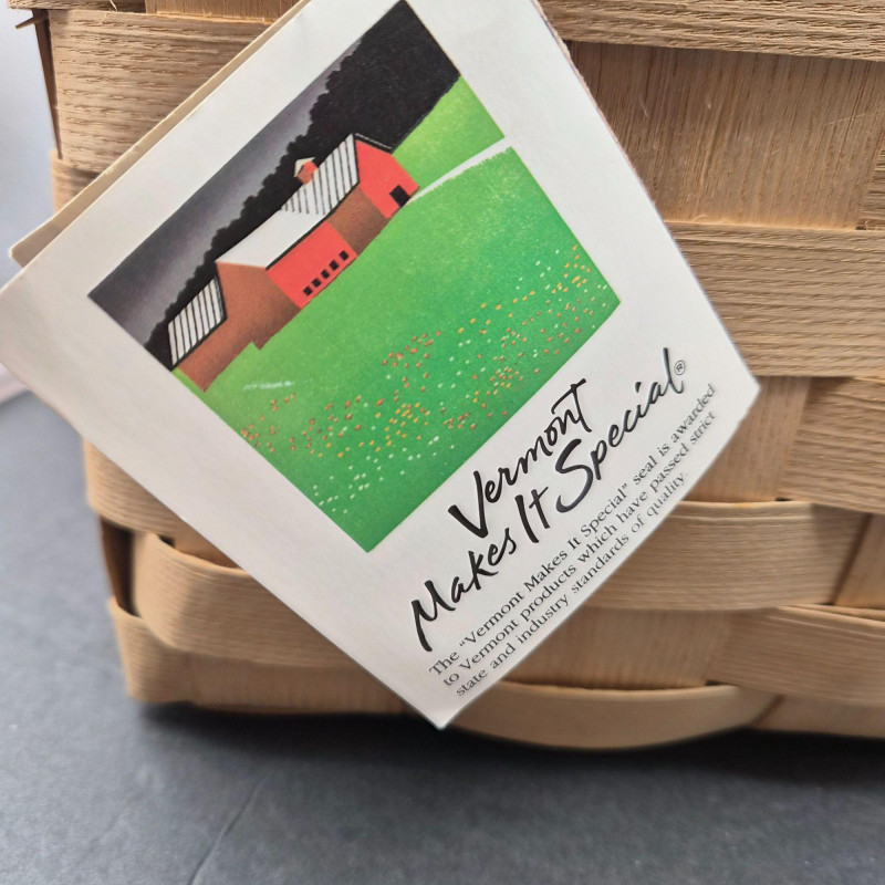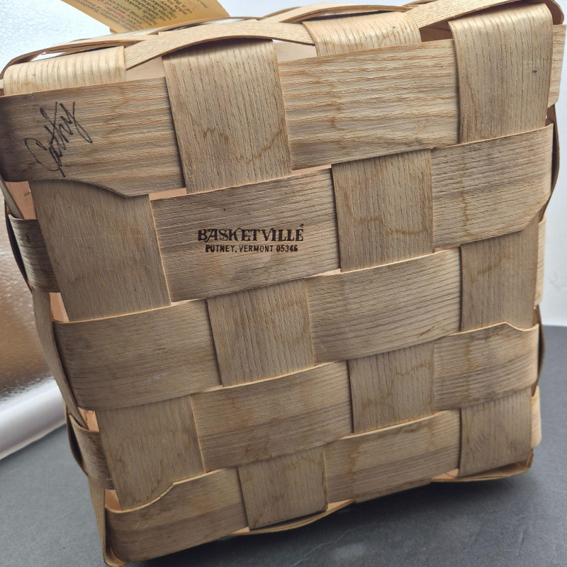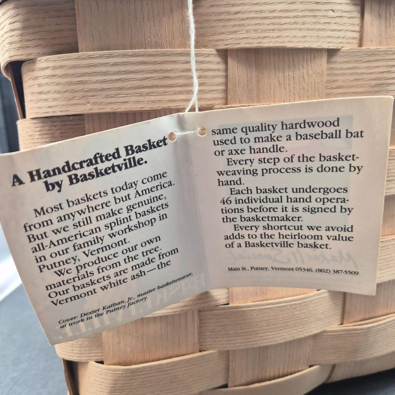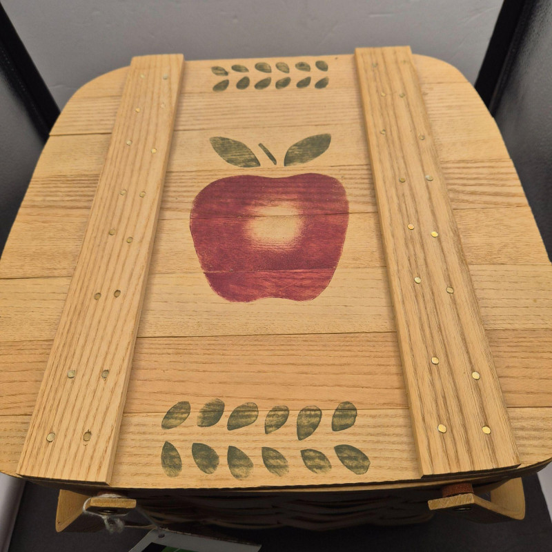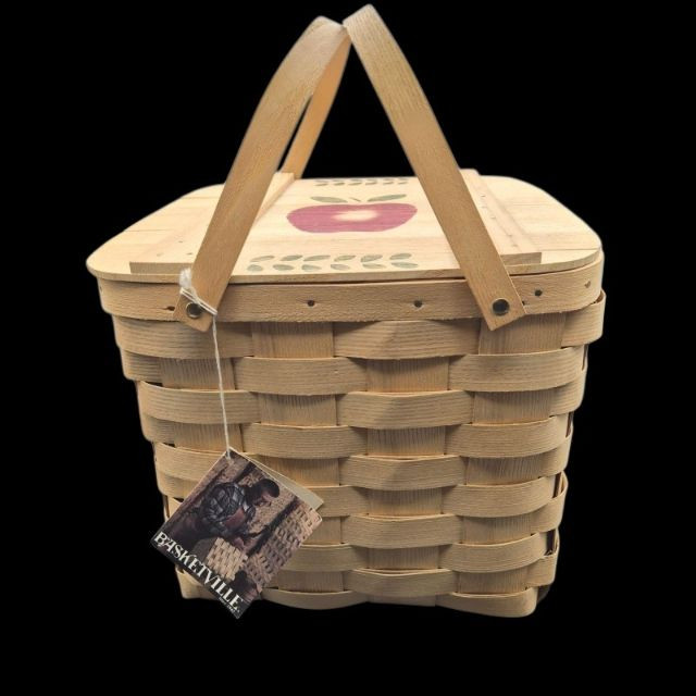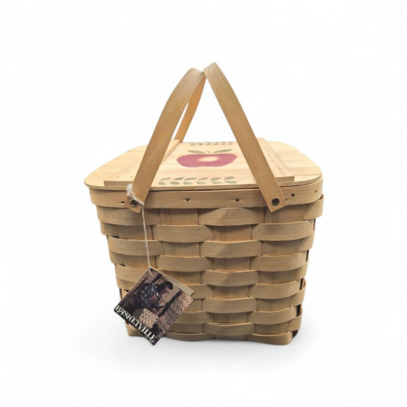 A charming handcrafted Basketville basket featuring the brand’s signature Vermont craftsmanship and warm, rustic character. This piece includes hardwood handles and a sturdy woven wood body, making it both decorative and functional. The top edge is accented with a hand‑painted apple stencil, adding a touch of folk‑art charm and classic country style. The basket is signed 'Cathy' and carries the original tag with the well‑known Basketville motto, “Vermont Makes It Special,” underscoring its regional heritage and collectible appeal. Its generous size makes it ideal for storage, display, or seasonal décor.