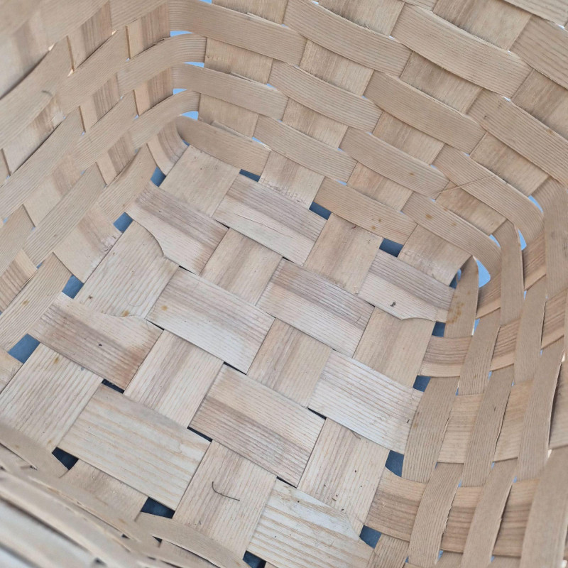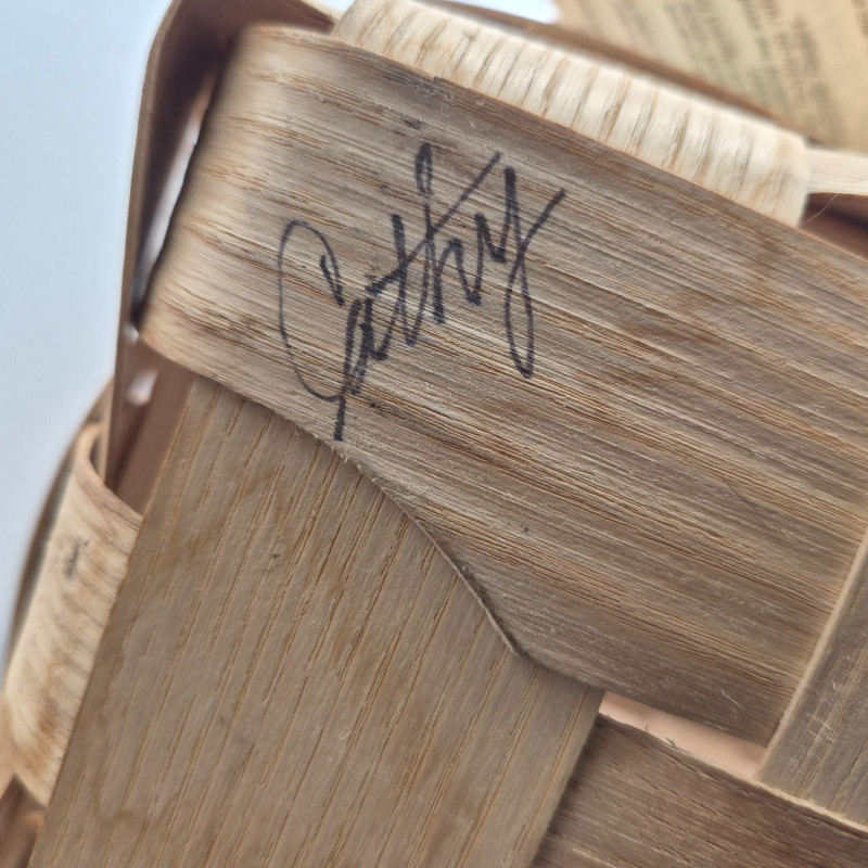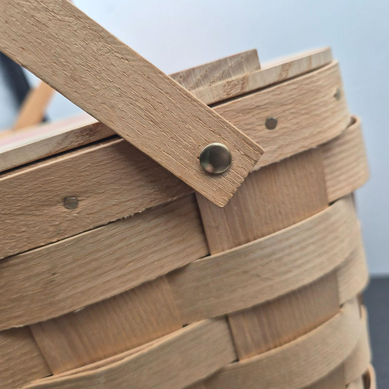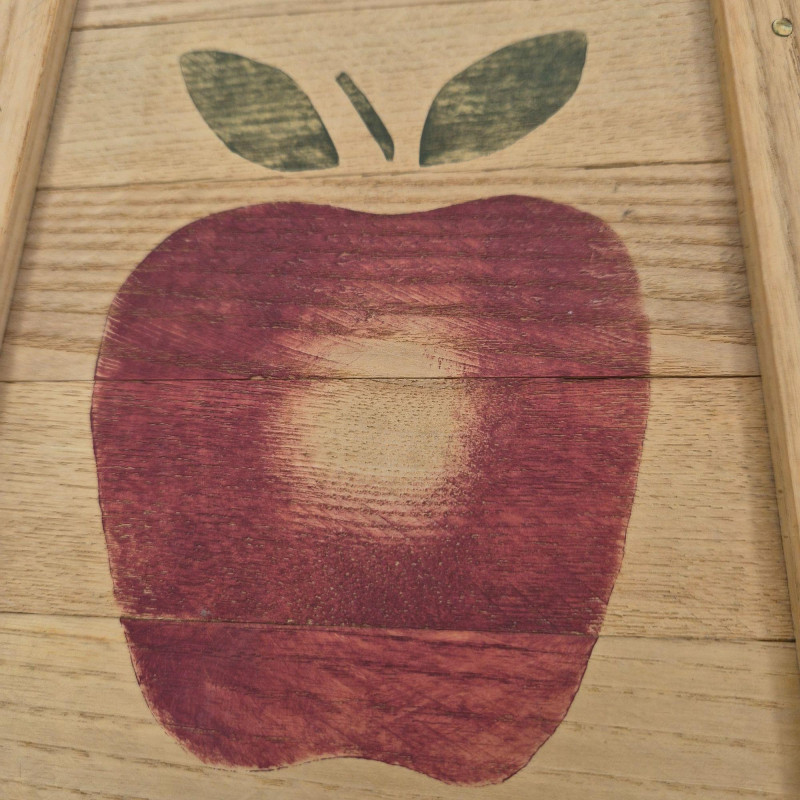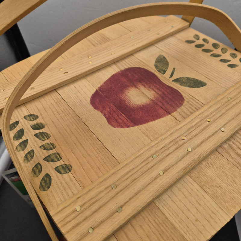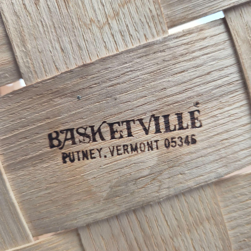 A charming handcrafted Basketville basket featuring the brand’s signature Vermont craftsmanship and warm, rustic character. This piece includes hardwood handles and a sturdy woven wood body, making it both decorative and functional. The top edge is accented with a hand‑painted apple stencil, adding a touch of folk‑art charm and classic country style. The basket is signed 'Cathy' and carries the original tag with the well‑known Basketville motto, “Vermont Makes It Special,” underscoring its regional heritage and collectible appeal. Its generous size makes it ideal for storage, display, or seasonal décor.