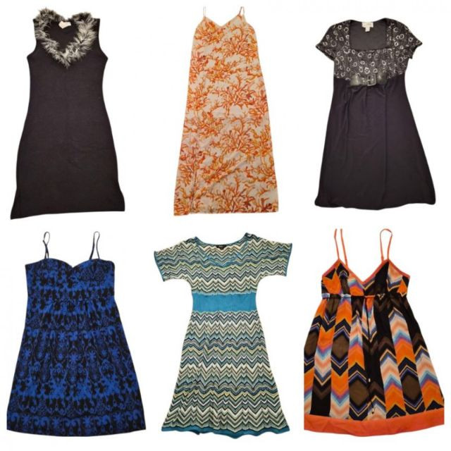 Assortment of six dresses featuring different lengths, patterns, and fabrics. The lot includes both strapless and short‑sleeve styles, giving buyers options for casual outings, evenings out, or warm‑weather wear. Brands represented: Style & Fabric Variety: