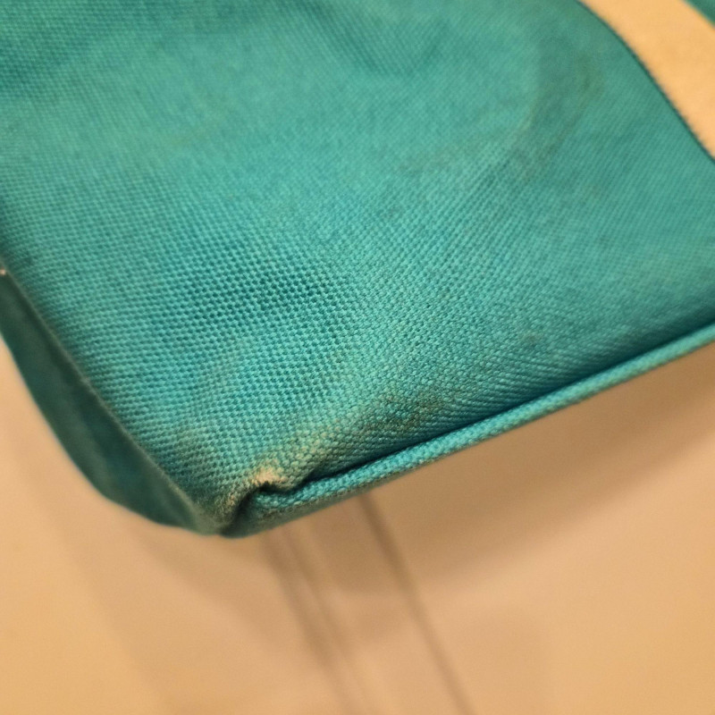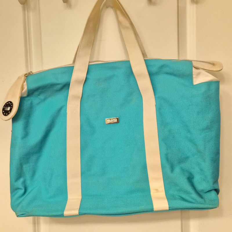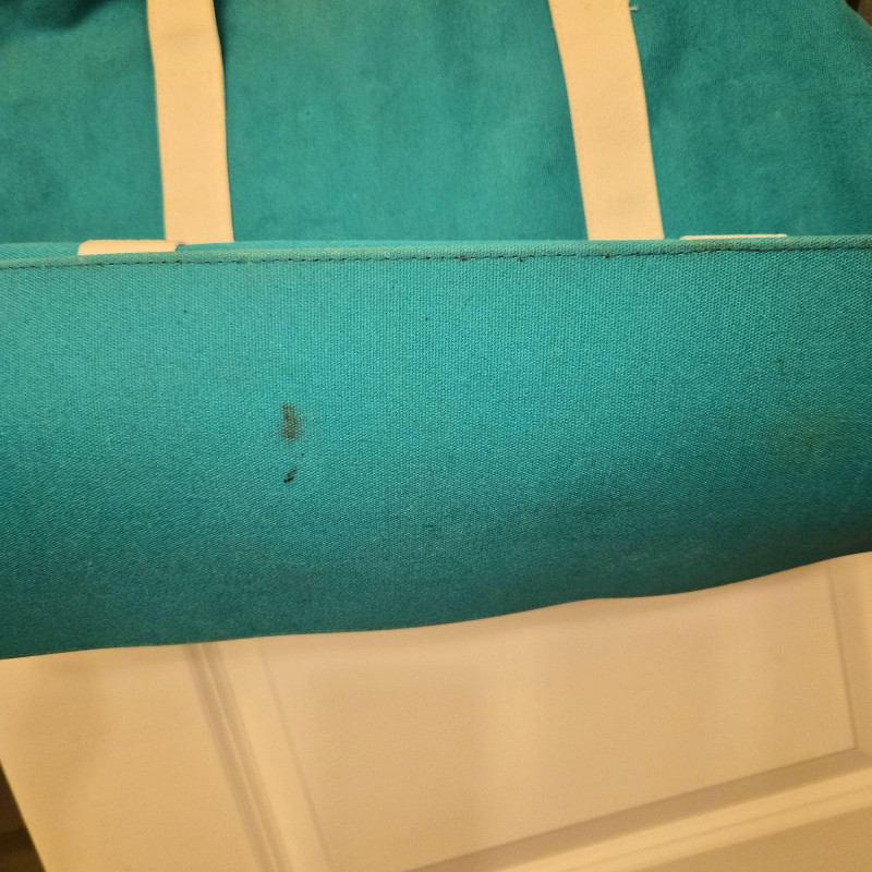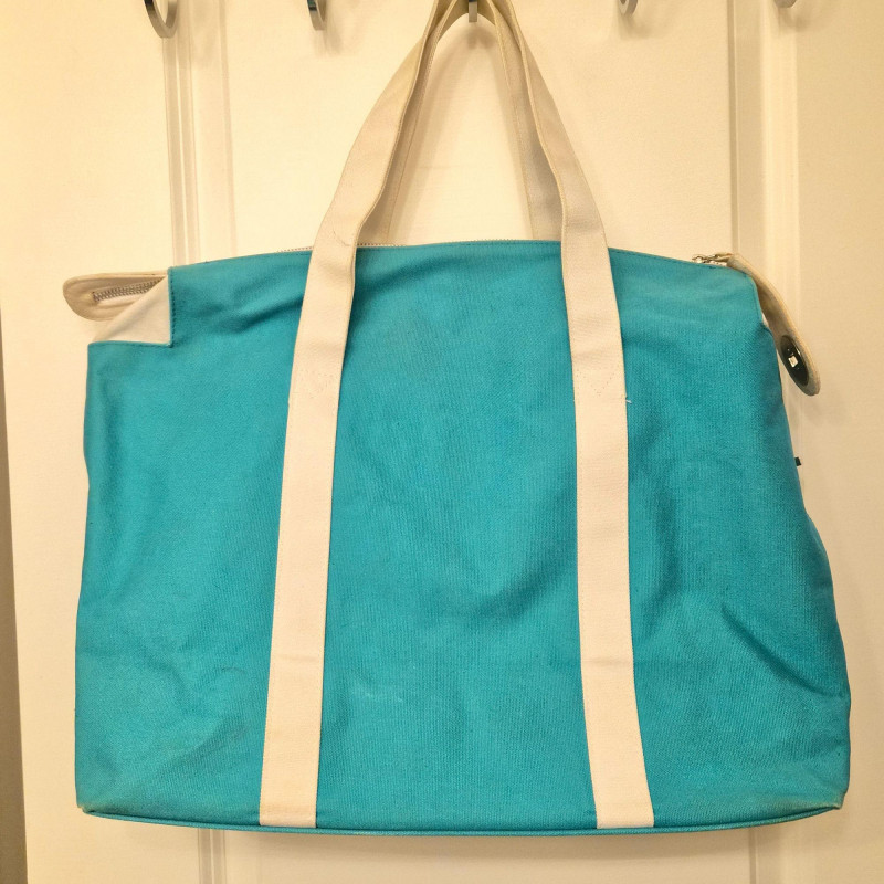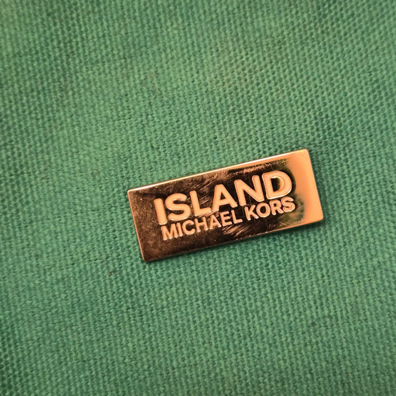 A roomy canvas MK tote with classic styling. Shows some spotting and light wear on the bottom corners, consistent with gentle use. Generous size makes it ideal for towels, books, and beach essentials.