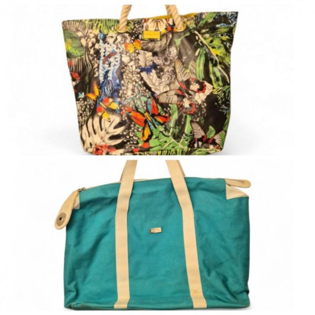 A stylish pair of large designer tote bags, perfect for beach days, travel, or everyday carry. Each bag offers its own personality—one vibrant and artistic, the other classic and practical. Together, these totes offer a blend of designer flair and practical function—great for coastal outings, poolside days, or stylish everyday hauling.