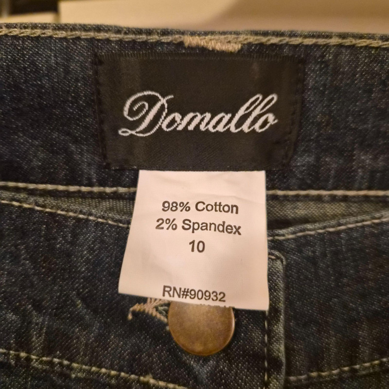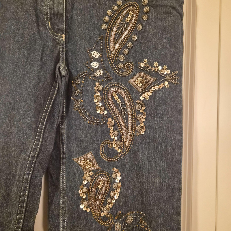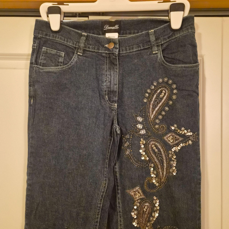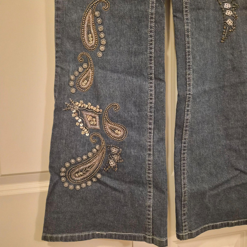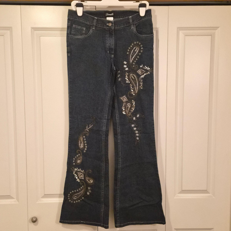 A bold and stylish pair of Damallo flare‑leg denim jeans featuring sparkling sequin embellishment in a cool paisley pattern down the legs. These boot‑cut blue jeans blend comfort and stretch with a fabric composition of 98% cotton and 2% spandex, giving them a soft feel with just the right amount of flexibility. Made in size 10L with a 33" inseam, they offer a long, flattering line and a touch of retro‑glam personality—perfect for concerts, nights out, or adding a standout piece to your denim rotation.