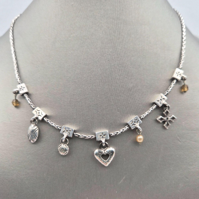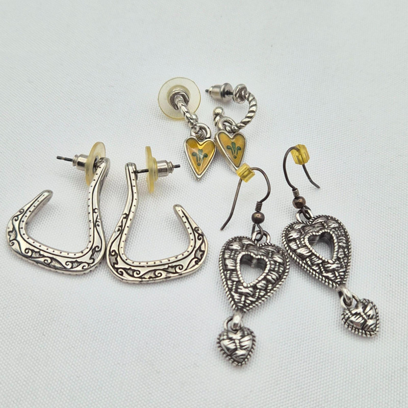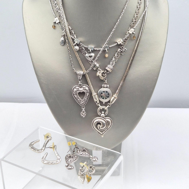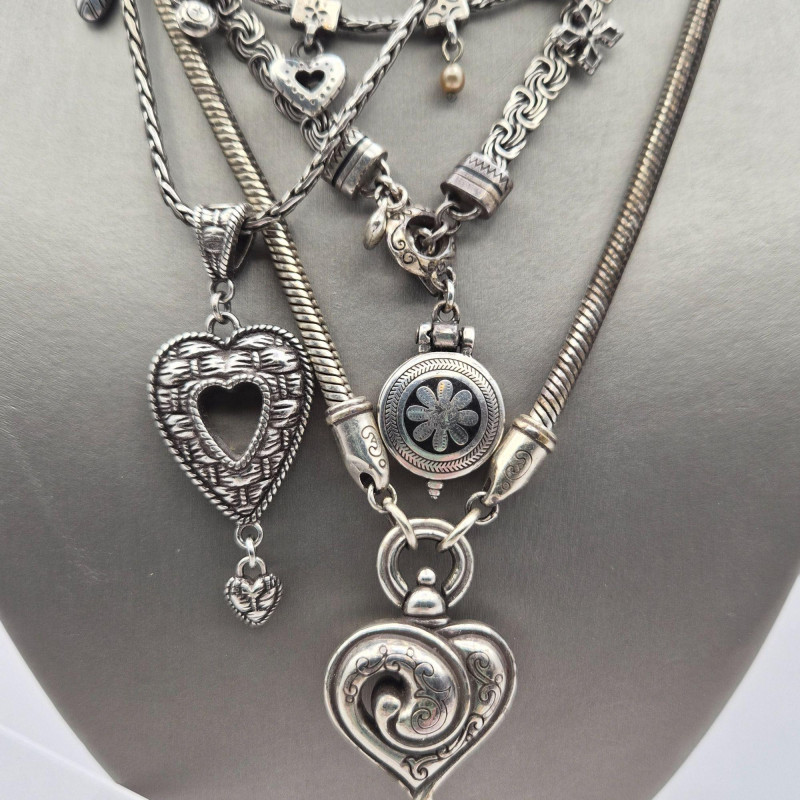 A charming assortment of Brighton necklaces and earrings, featuring signature hearts, mixed metals, and sentimental motifs. All pieces are pre‑owned and show some wear to the metal, consistent with use, but remain fully wearable and visually appealing. This collection includes: A lovely mixed grouping for Brighton fans, gift bundling, or everyday wear with a touch of charm.