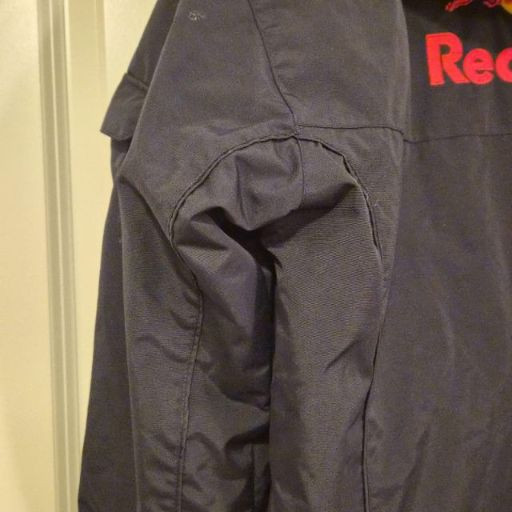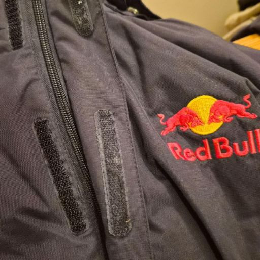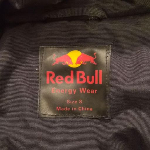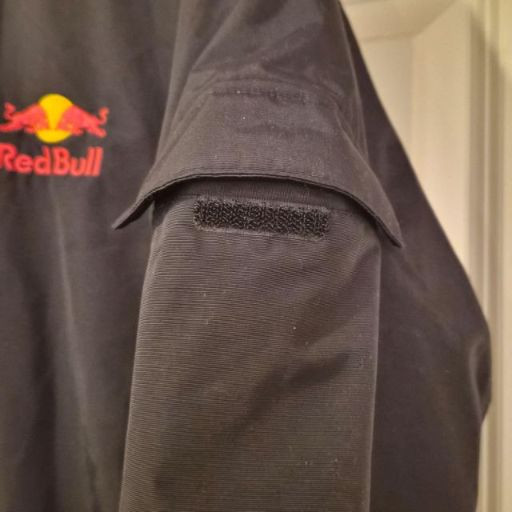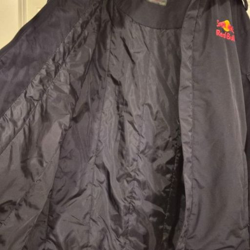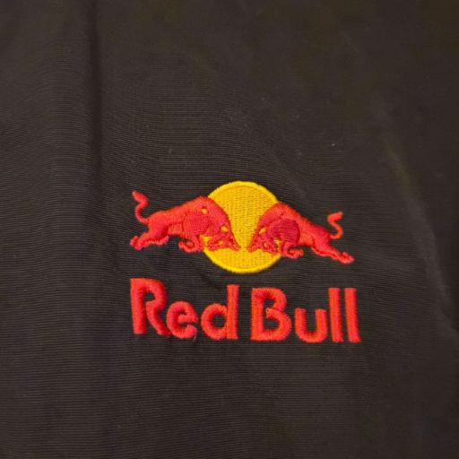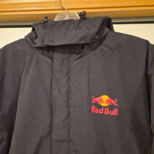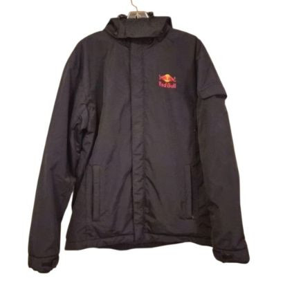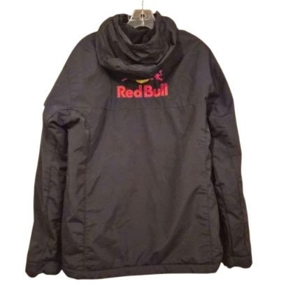A dynamic Red Bull Energy Wear women’s jacket in size small, crafted from durable weather resistant black fabric and designed with sporty, branded flair. It features a zip front with Velcro storm flap, plus a removable hood for adaptable wear in changing weather. Bold embroidered Red Bull logos on both the front and back give this piece unmistakable energy and collector appeal. A great choice for fans of motorsport, energy‑culture branding, or anyone who loves a sleek, athletic edge in their wardrobe. A standout and increasingly hard‑to‑find piece for collectors or everyday wear.