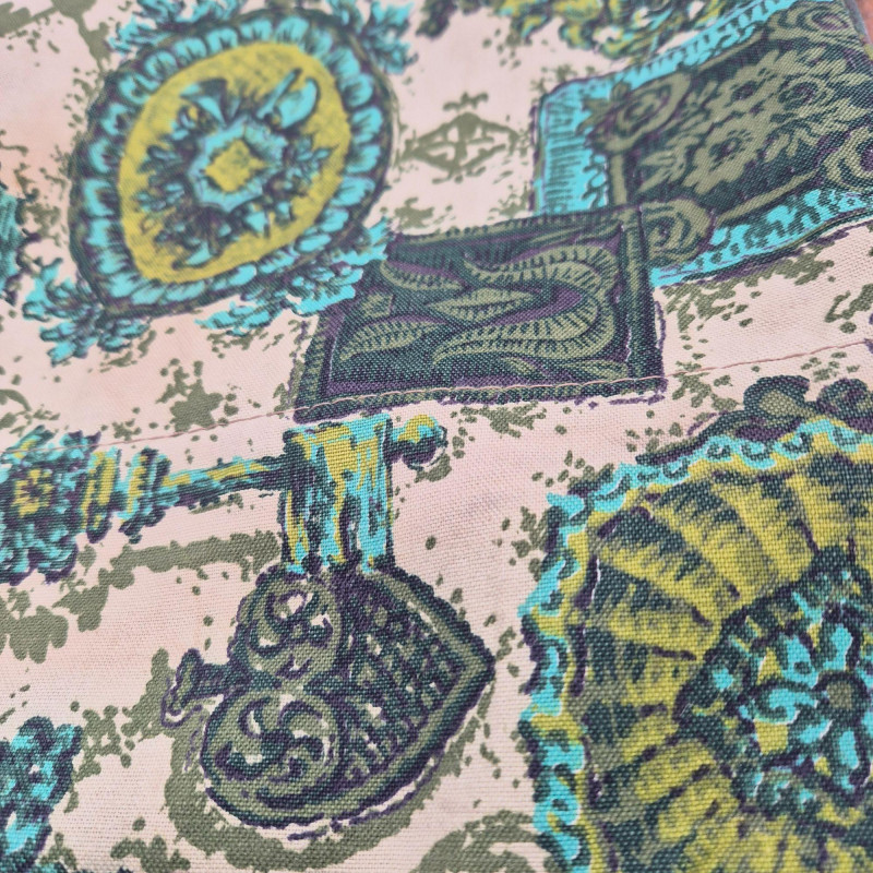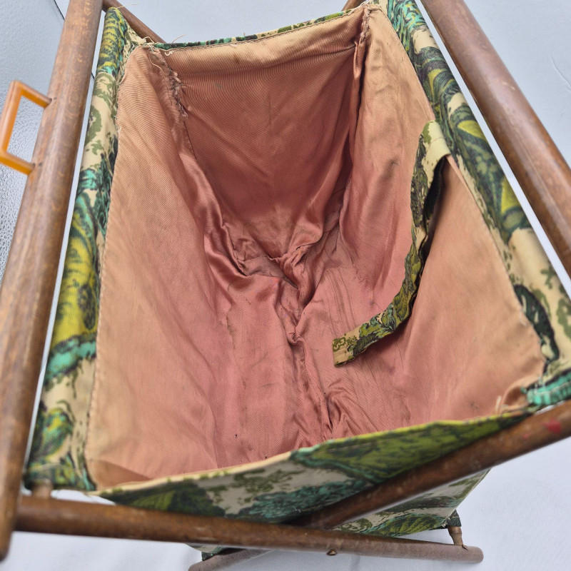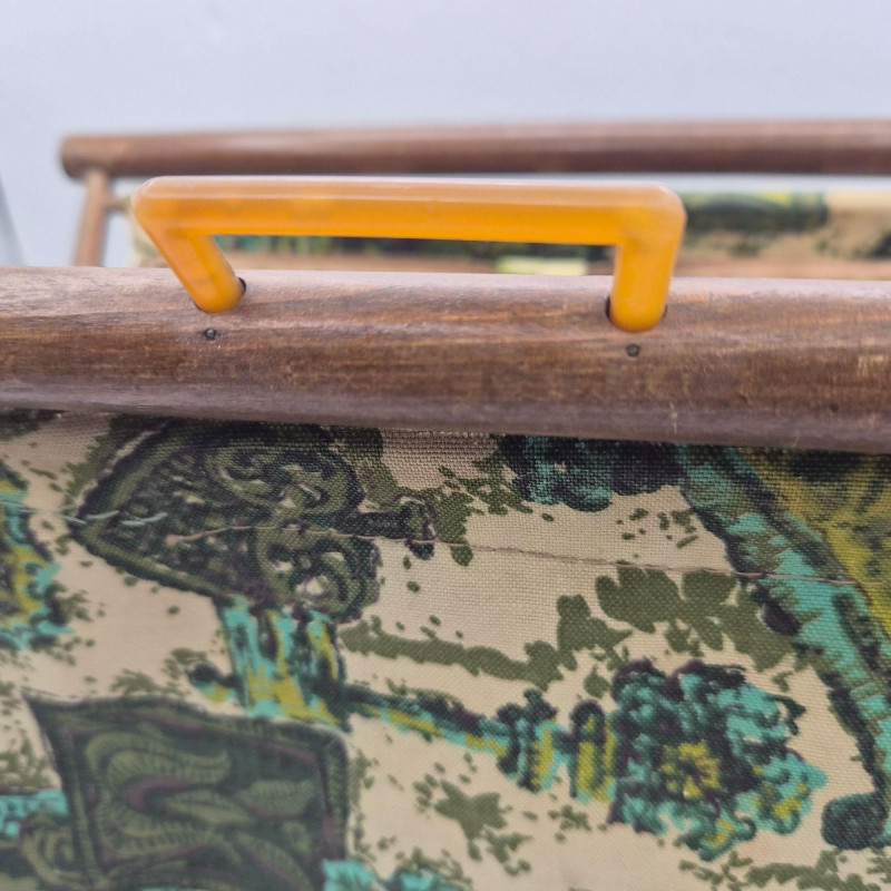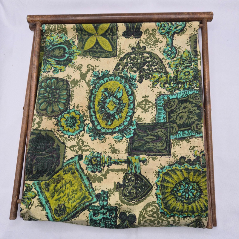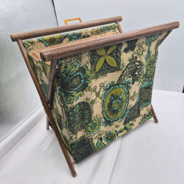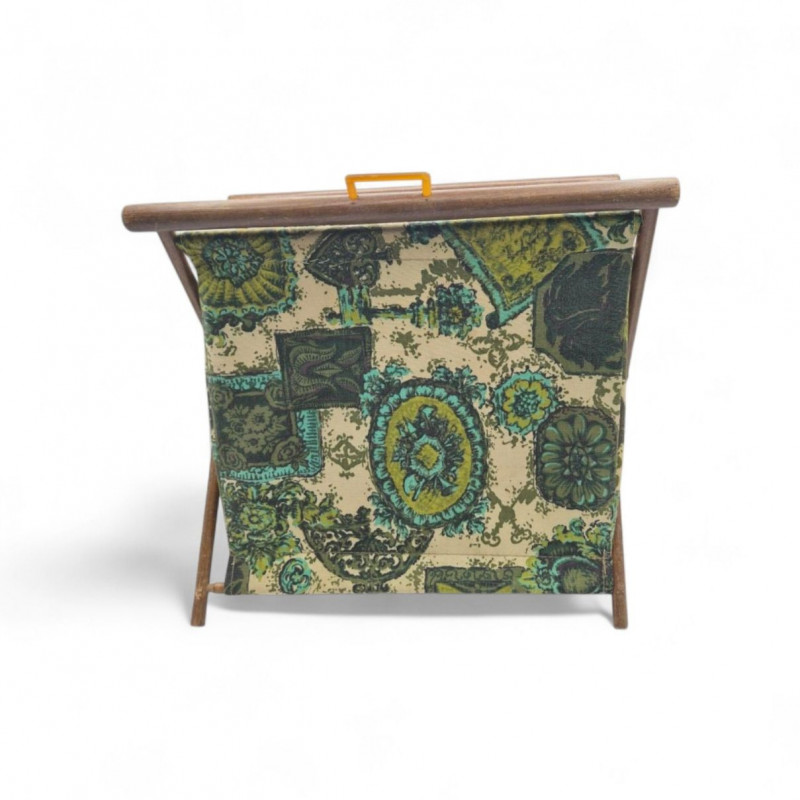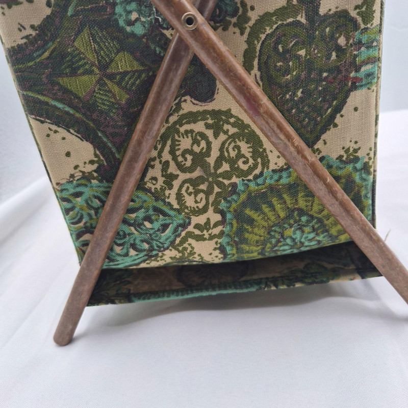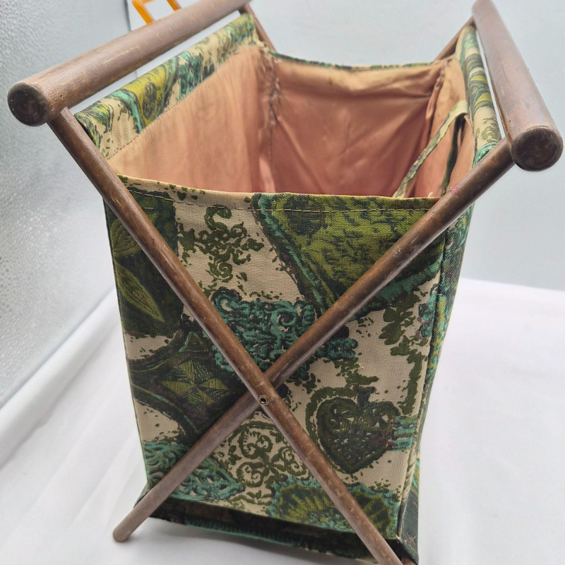 A vintage folding sewing basket caddy featuring a warm wooden frame and a beautifully patterned fabric pouch in multi-green hues, teal, and cream tones. The textile design blends retro florals with geometric accents, creating a lively mid‑century look. The pattern includes stylized blossoms, leaf motifs, and repeating shapes that give the piece both charm and visual rhythm—very much in line with 1960s–1970s home décor aesthetics. The caddy opens to reveal a single satin‑lined compartment (no divider), offering smooth, open storage for sewing notions, yarn, craft supplies, or magazines. When folded, it becomes a compact decorative piece with a clean A‑frame silhouette. A functional and decorative piece for collectors of vintage sewing accessories or lovers of mid‑century patterned textiles.