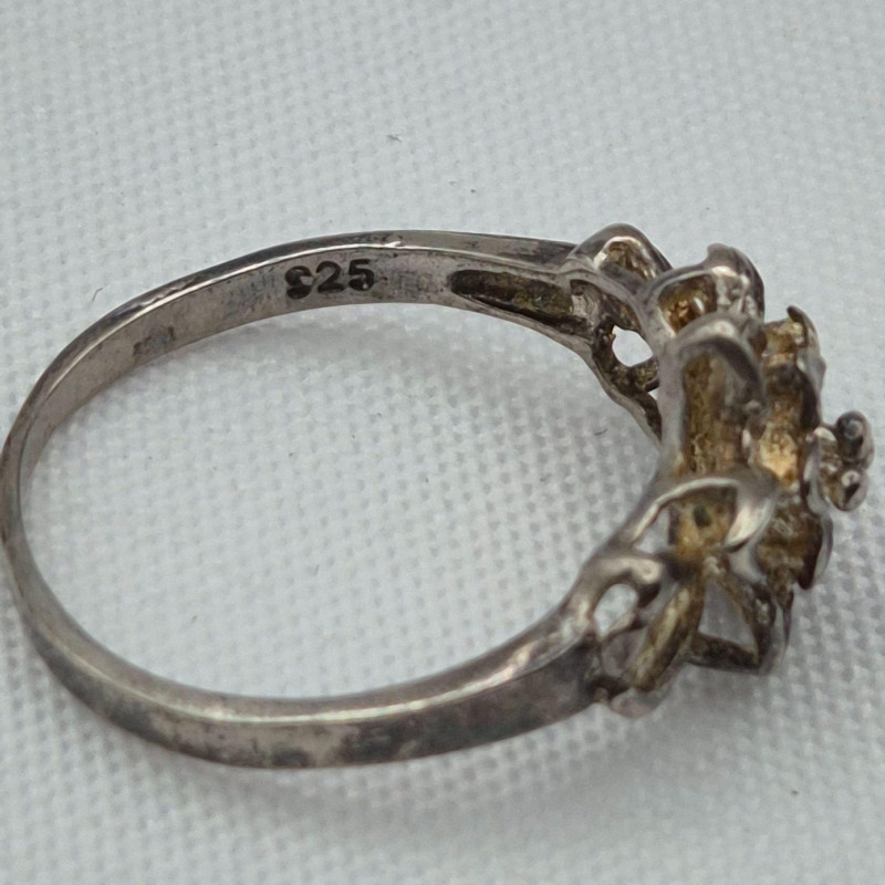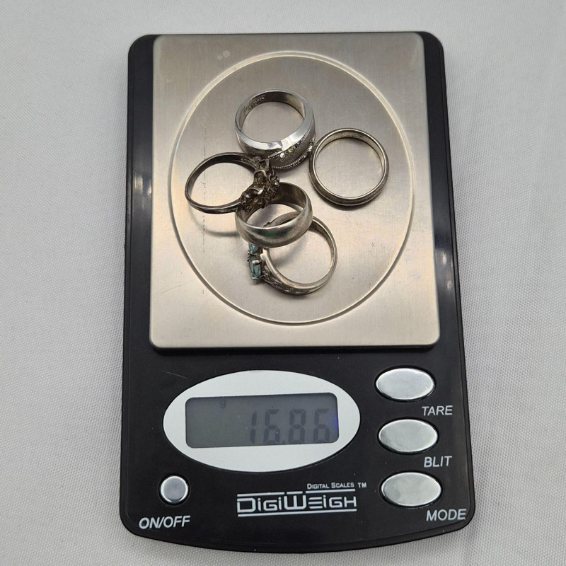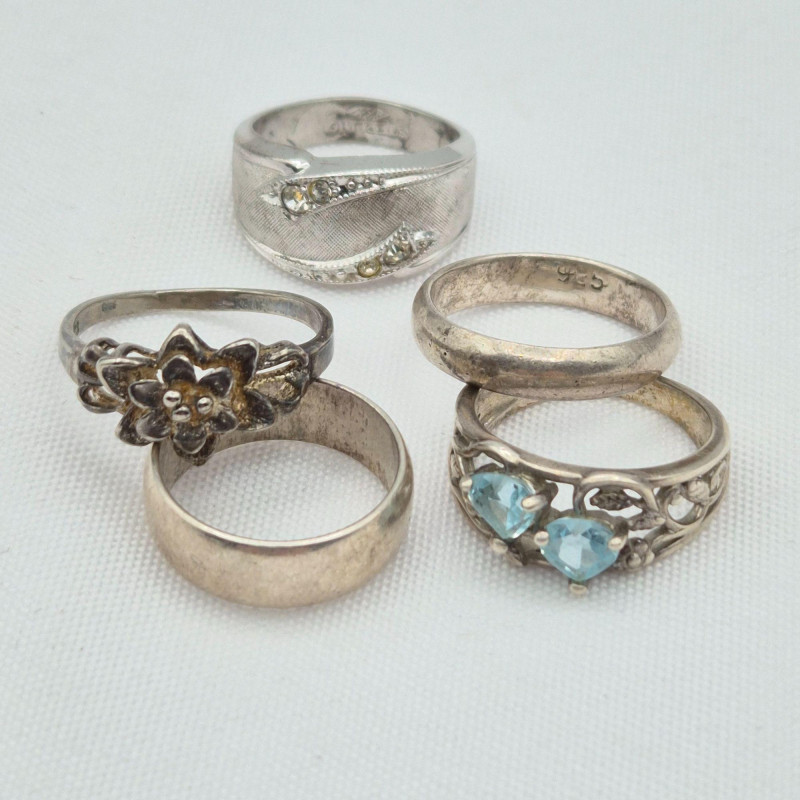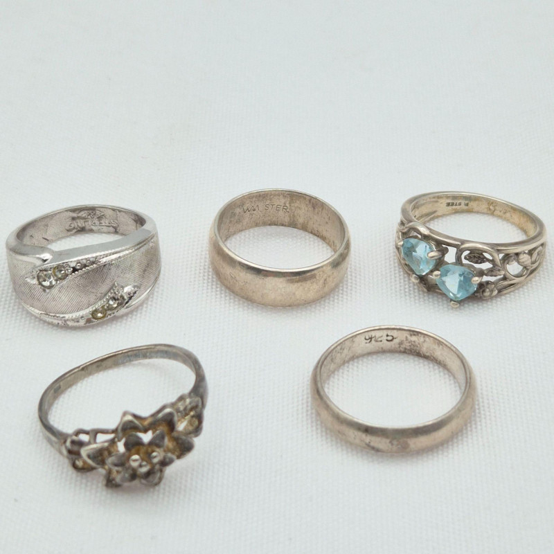 A lovely assortment of petite-size 925 sterling silver rings, perfect for collectors, resellers, or anyone who loves delicate vintage jewelry. This mix includes floral designs, a clear stone ring, a light blue topaz, and several simple silver bands, all crafted in genuine sterling. Sizes range approximately 3–5, ideal for smaller fingers or midi‑ring styling. The group shows a touch of natural age patina, but each piece should polish up beautifully, revealing the bright silver beneath. A charming, wearable sterling bundle with plenty of character.