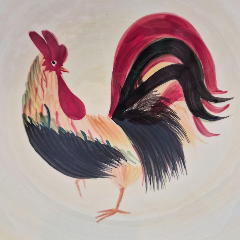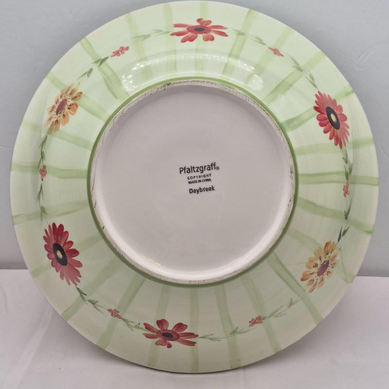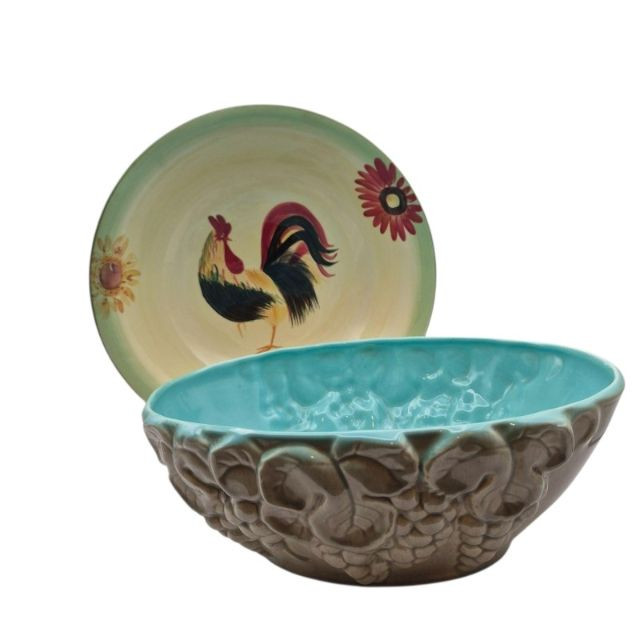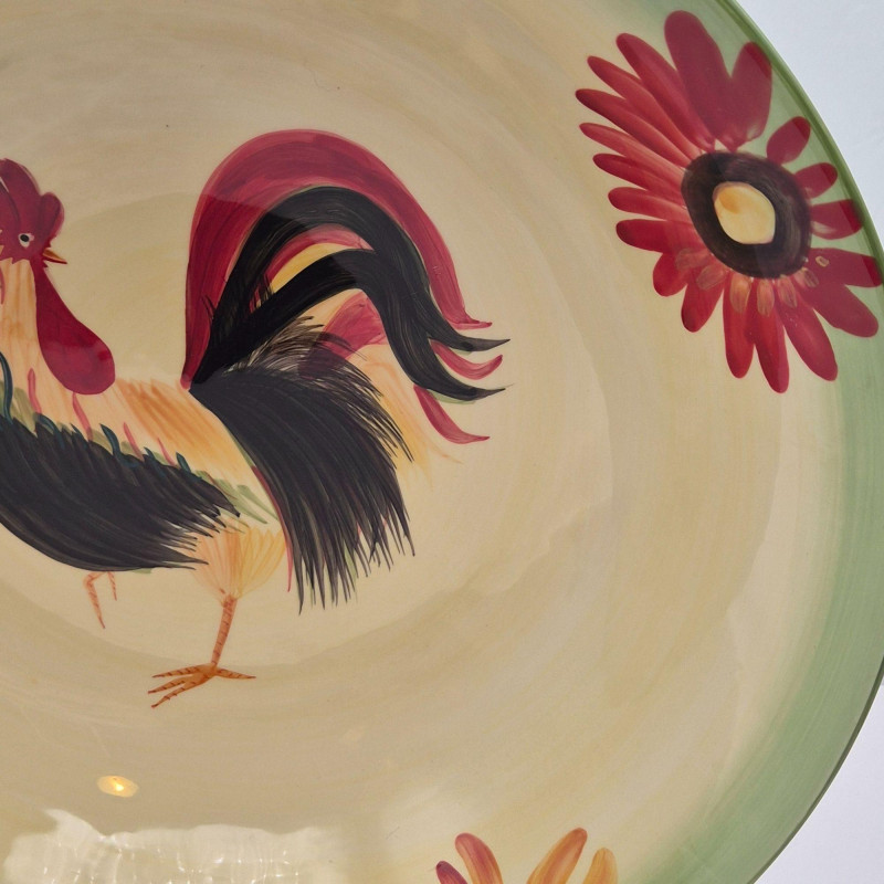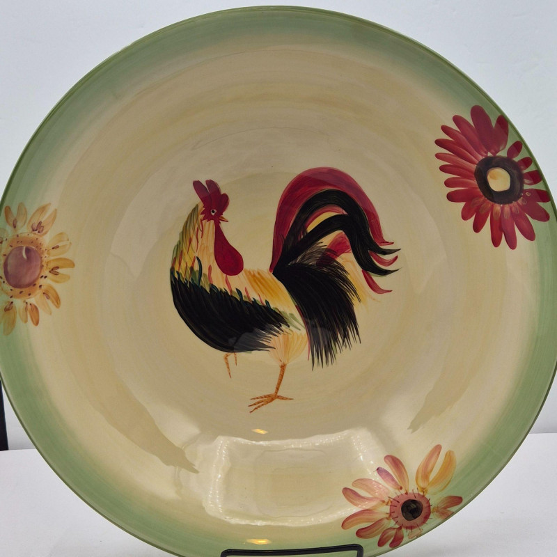 A large 14" x 4" ceramic bowl featuring the Daybreak pattern with its signature rooster and floral motif. The wide, shallow form makes it ideal as a table centerpiece, fruit bowl, or rustic décor accent.