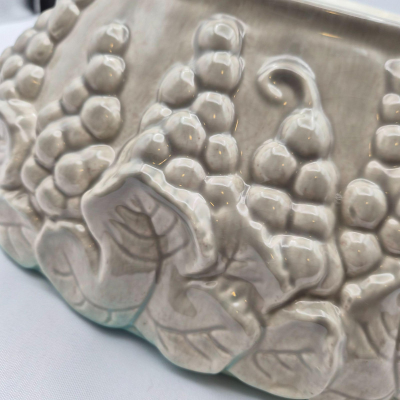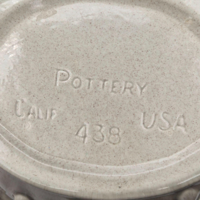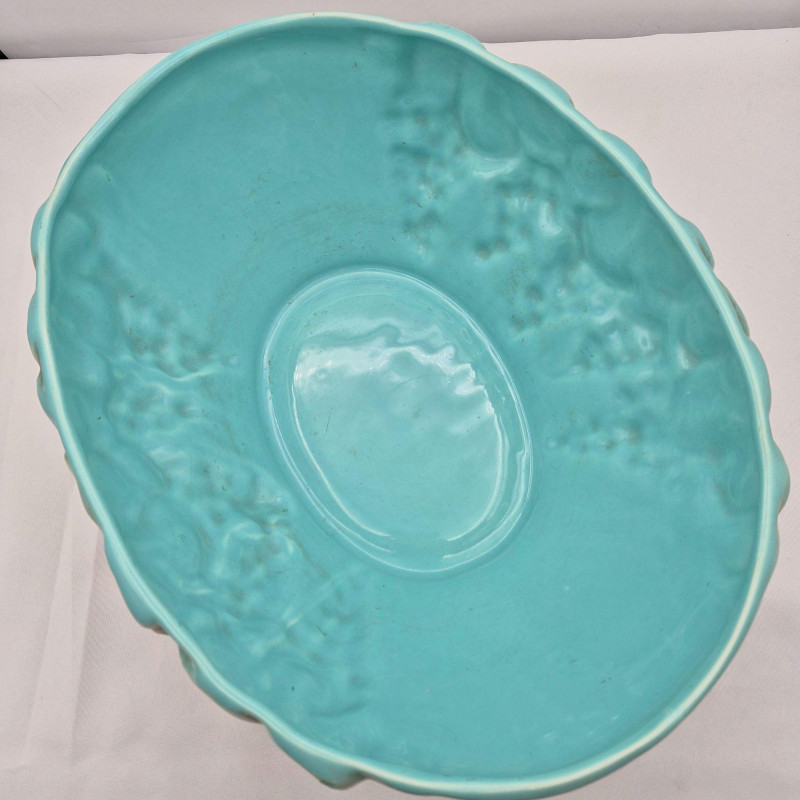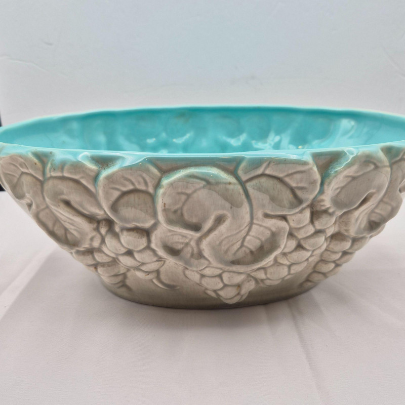 A sculptural 13.5" long x 10" wide x 5.25" tall ceramic bowl with a beige glazed exterior and raised grape cluster and leaf motif. The interior is finished in a beautiful robin’s‑egg blue glaze, creating a striking color contrast. Marked California USA 438, attributed to Los Angeles Potteries.