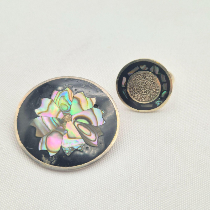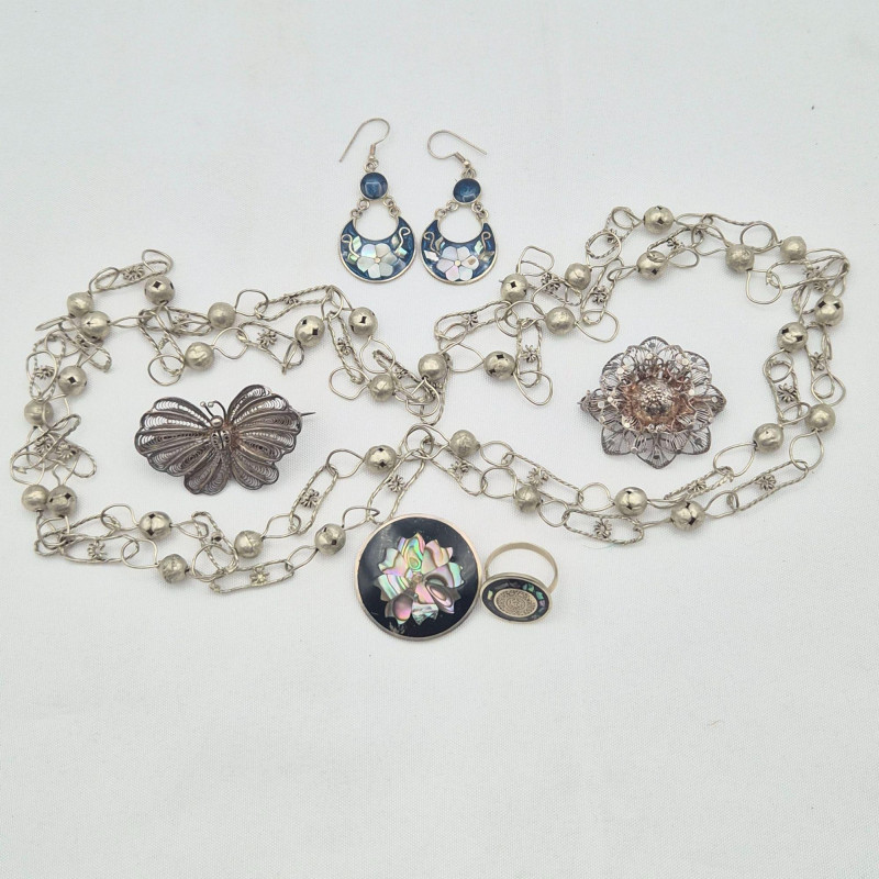 A striking mixed lot of vintage Mexican silver and Alpaca pieces, blending traditional wedding‑style craftsmanship, ornate filigree work, and classic mid‑century inlay designs. Mexican Silver Wedding Necklace Vintage Filigree Brooch Pair – Butterfly & Flower Alpaca Mexico Inlay Earrings Alpaca Mexico Onyx & Abalone Mayan‑Motif Ring