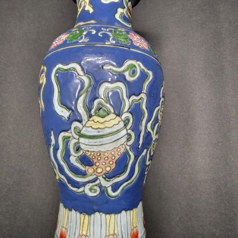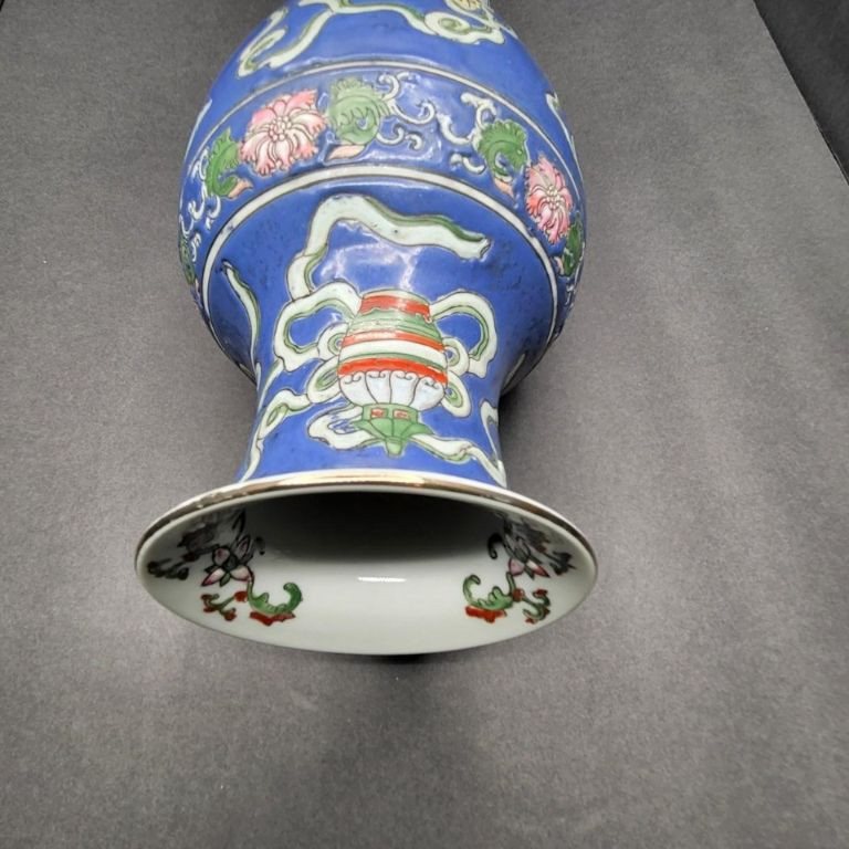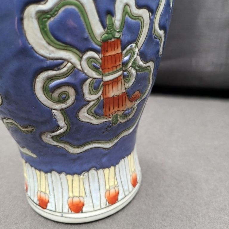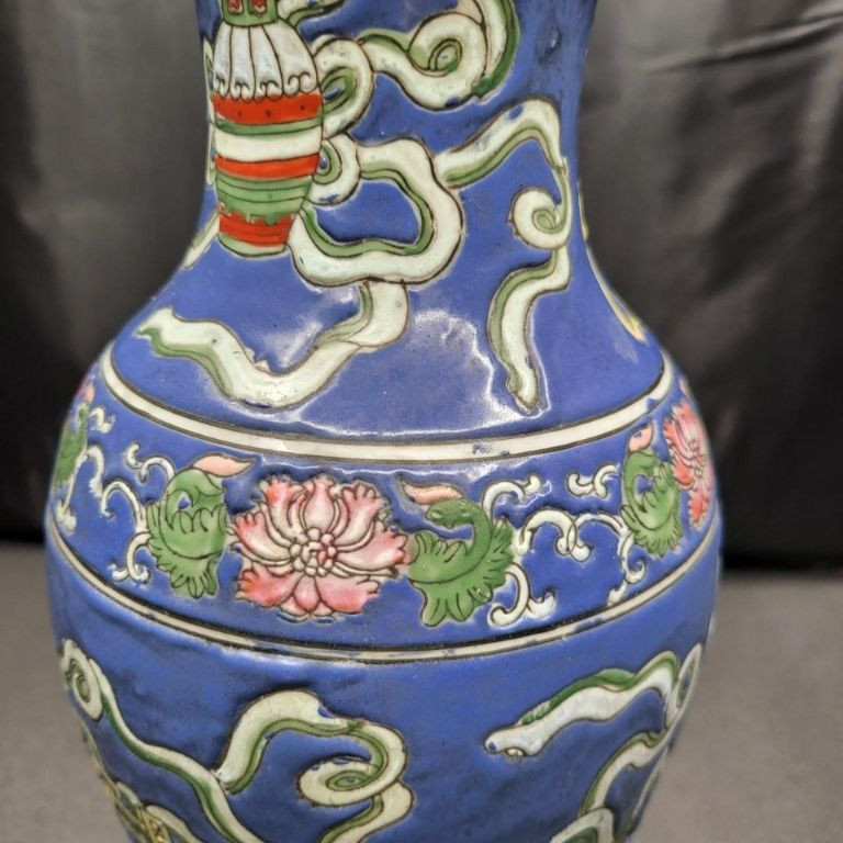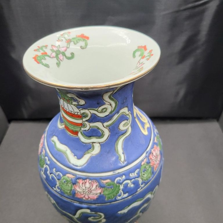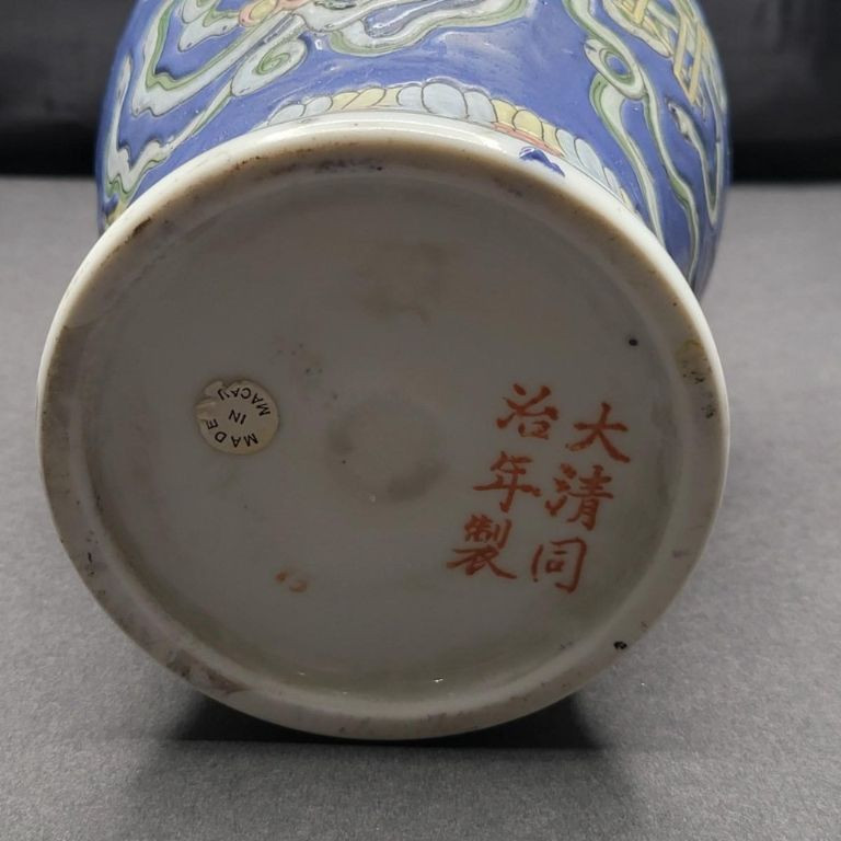 A beautifully detailed 12" handcrafted ceramic vase from Macau, featuring raised pattern work and full‑coverage hand‑painted decoration. The piece stands out for its soft periwinkle‑blue background, intricate motif, and painted rim detail, giving it both elegance and artisan charm. This vintage Macau vase is richly decorated with a slightly raised design that wraps fully around the body, showcasing careful hand‑painting and traditional craftsmanship. The rim is also hand‑painted, adding a finished, intentional touch. The base is stamped/signed, confirming its Macau origin. No chips, cracks, or breaks are visible, making it a strong display‑ready piece.