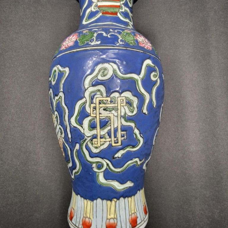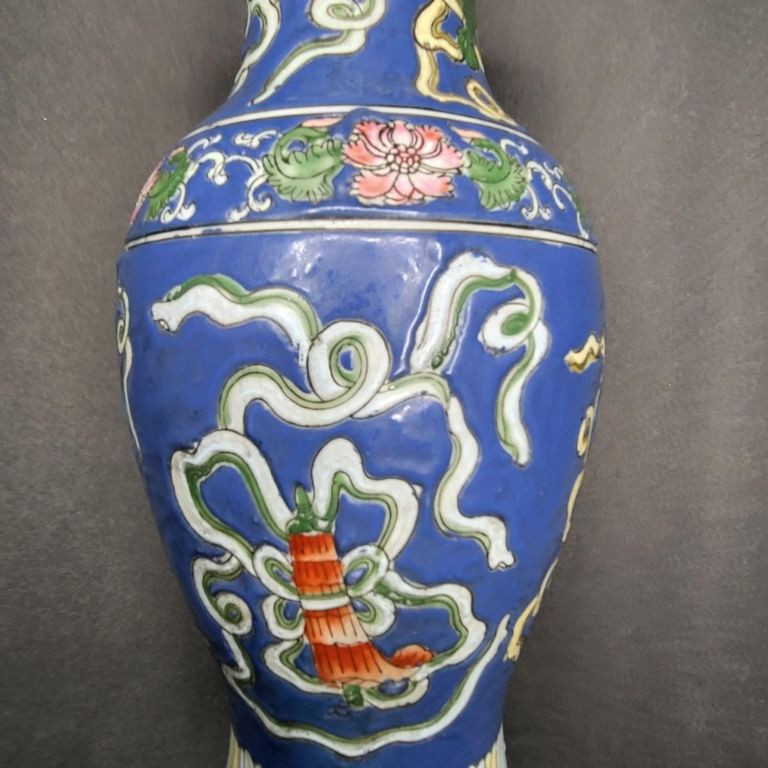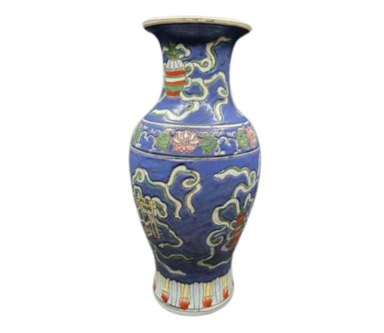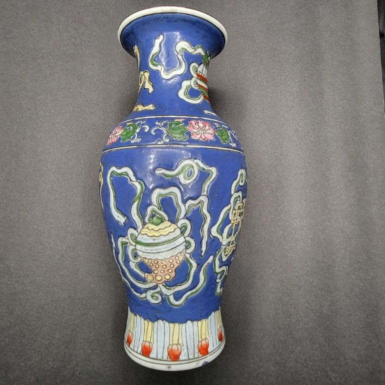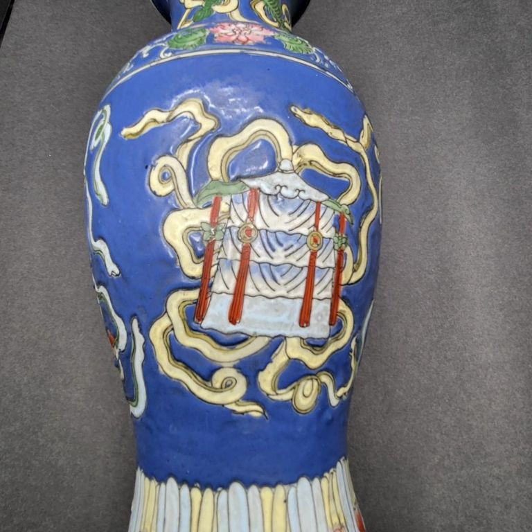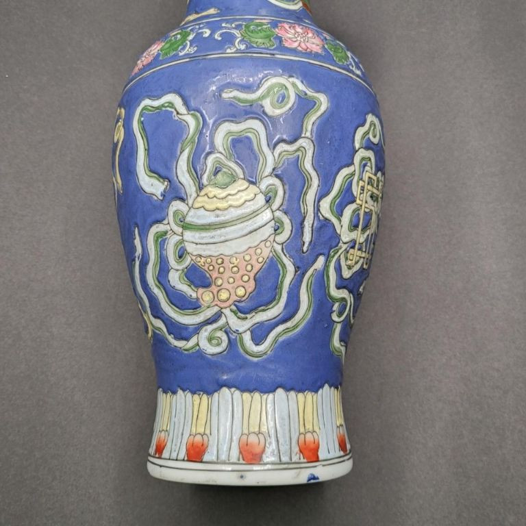 A beautifully detailed 12" handcrafted ceramic vase from Macau, featuring raised pattern work and full‑coverage hand‑painted decoration. The piece stands out for its soft periwinkle‑blue background, intricate motif, and painted rim detail, giving it both elegance and artisan charm. This vintage Macau vase is richly decorated with a slightly raised design that wraps fully around the body, showcasing careful hand‑painting and traditional craftsmanship. The rim is also hand‑painted, adding a finished, intentional touch. The base is stamped/signed, confirming its Macau origin. No chips, cracks, or breaks are visible, making it a strong display‑ready piece.