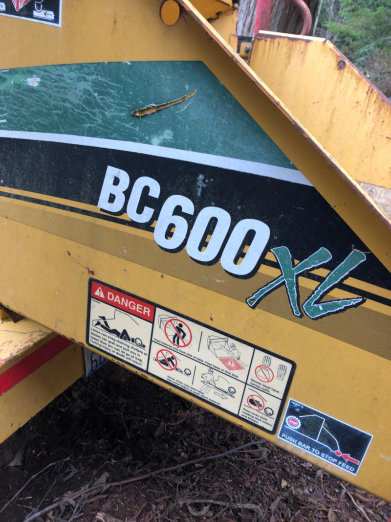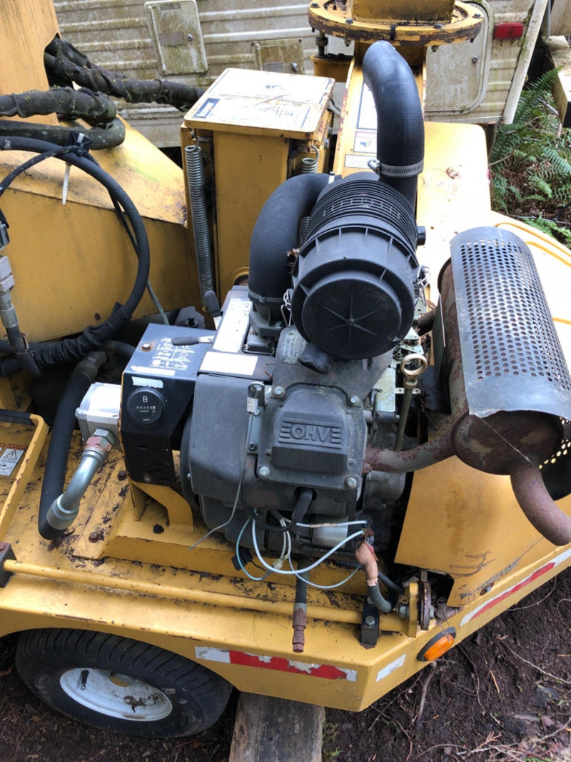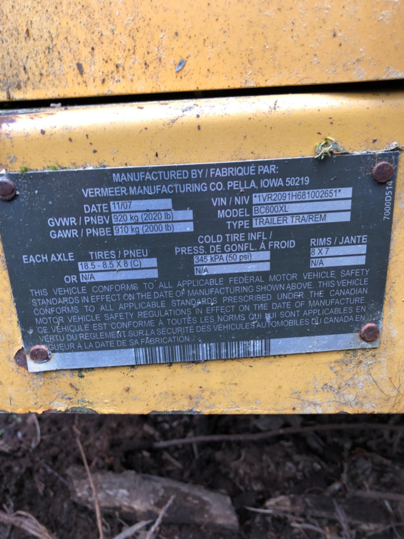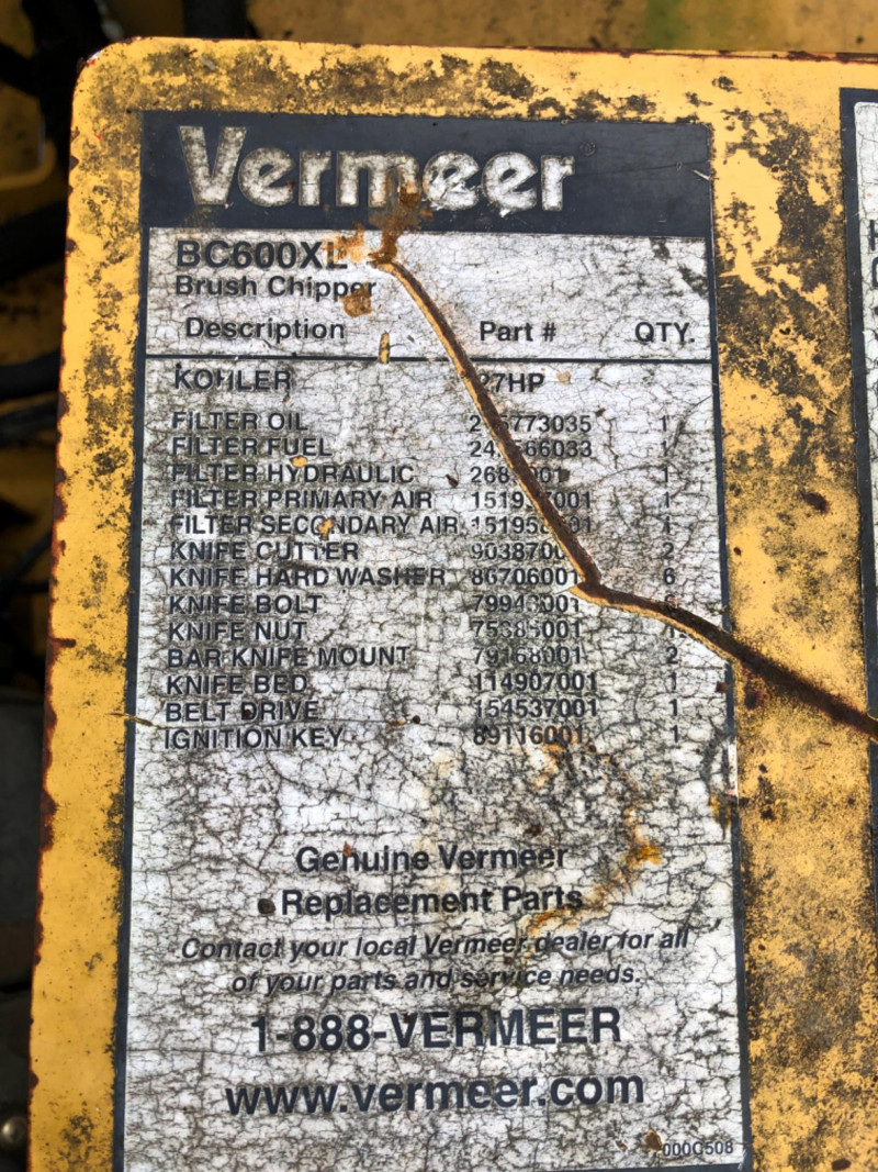 2008 Vermeer BC600XL tow‑behind brush chipper powered by a 27 HP Kohler Command Pro engine. This compact disc‑style chipper processes material up to 6" diameter and features Vermeer’s AutoFeed II® system and Bottom Feed Stop Bar for operator safety. Equipped with a single horizontal feed roller delivering 550 lb clamp load, a two‑stage dry air cleaner, and a 7‑gallon fuel tank. Machine dimensions include 110" length with feed table up (141" extended), 53.5" width, and 94" height, with an approximate operating weight of 1900 lbs. Built on a 2,000 lb torsion axle for smooth towing. VIN: 1VR2091H681002651. Engine specifications include 27 HP (20.1 kW), 42.7 ft‑lb torque, 2.4 gph max fuel consumption, and air‑cooled operation. Chipping system uses two cutter knives, with knife bolts and nuts accessible for service. Tire size is 18.5–8.5×8 (C‑rated) with 50 psi cold inflation. A reliable, maneuverable chipper suitable for landscaping, municipal work, and property maintenance. See photos for chute condition, feed system, engine compartment, and overall wear.