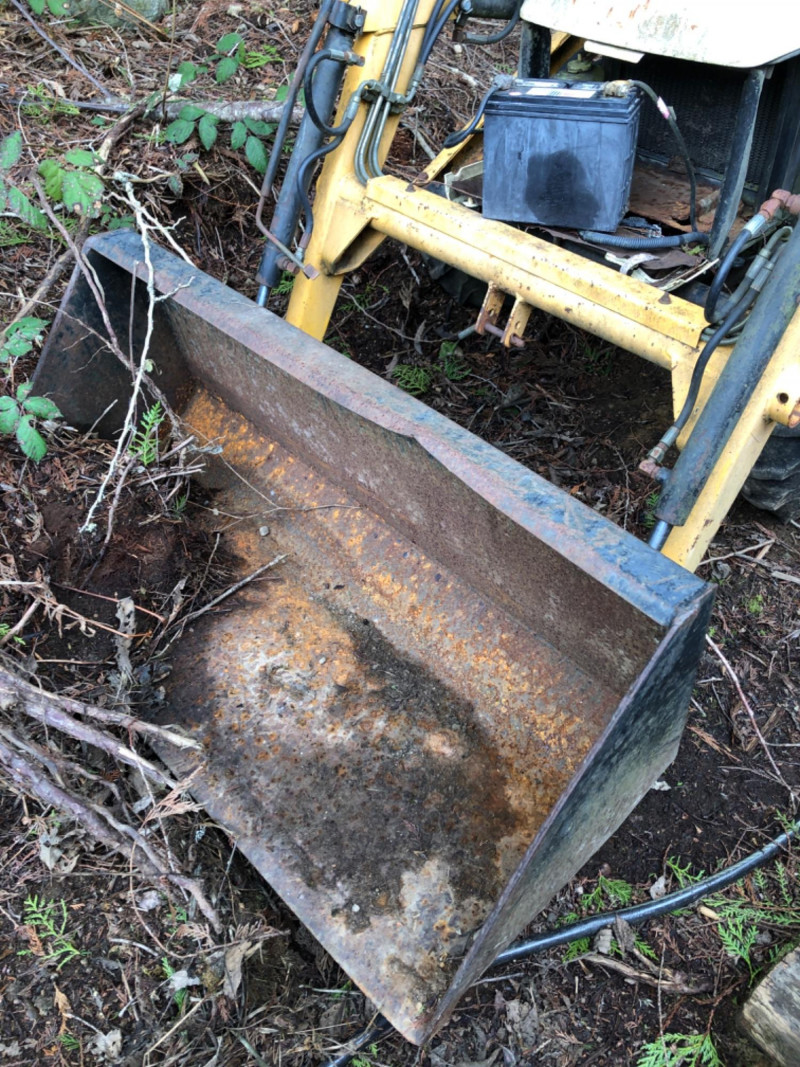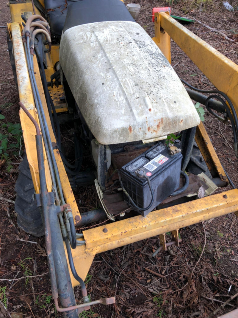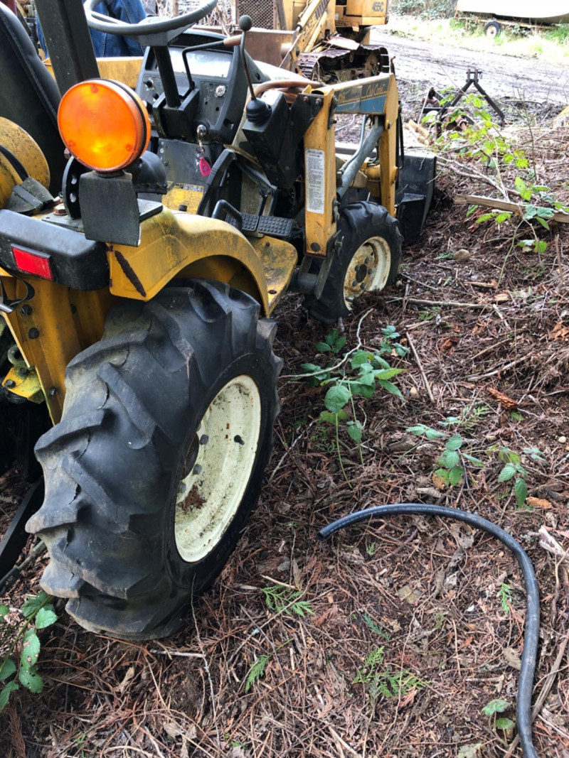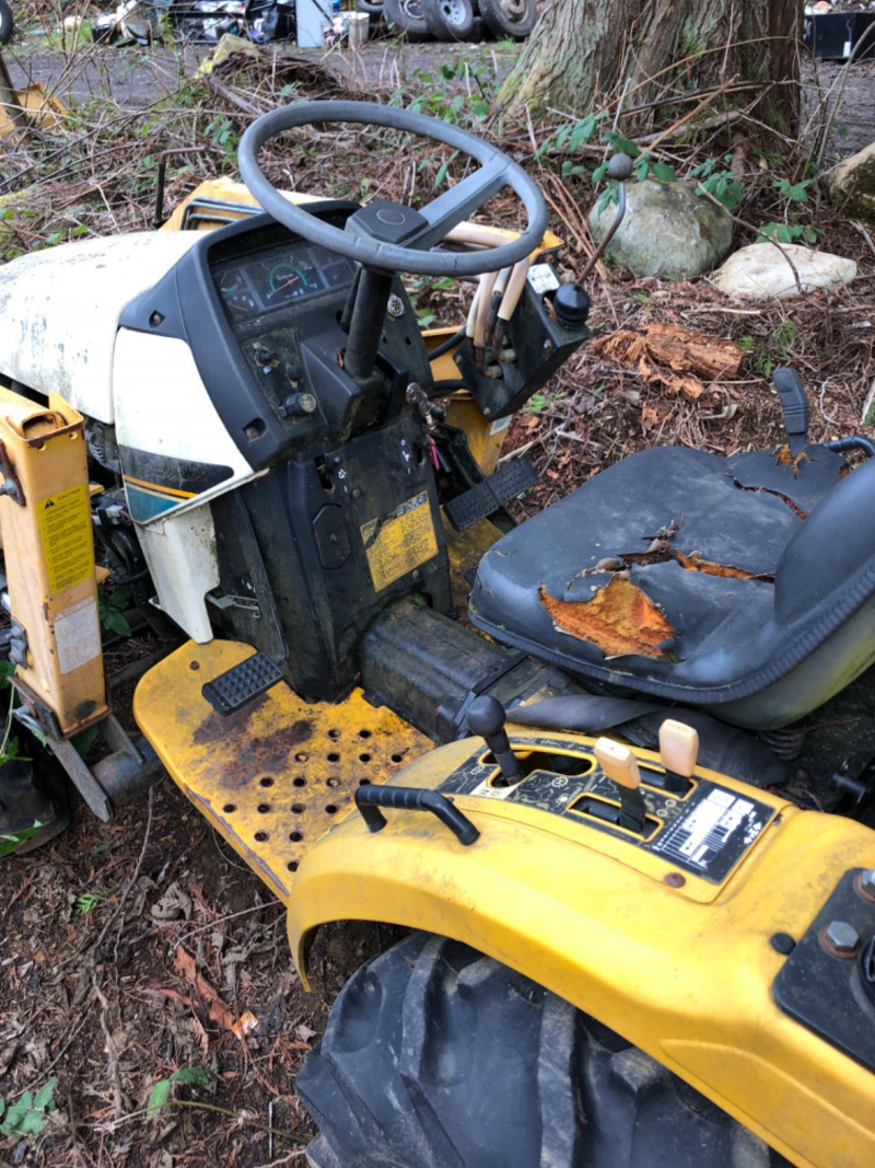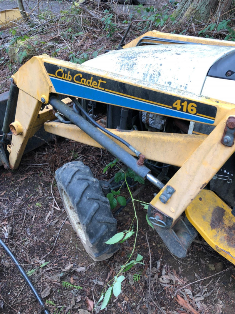 Cub Cadet 416 front‑end loader system mounted on a compact tractor, equipped with a 48" bucket and full hydraulic lift. Loader specifications include 2135 psi hydraulic pressure, 5.4 gpm pump capacity, and a maximum lift height of 84" at the pivot pin. Bucket capacity is 4.1 cu ft struck and 5.0 cu ft heaped, with a maximum dump clearance of 63" and 23" reach at maximum height. The loader weighs approximately 140 lbs and is designed for light earthmoving, landscaping, and material handling. Tractor shows typical outdoor use with wear consistent with age; see photos for bucket condition, hydraulics, and frame. Equipment has been exposed to weather conditions. Seat cover needs to be replaced, and machine needs a surface cleaning. Key included, dashboard lights come on, but unable to start the tractor.
