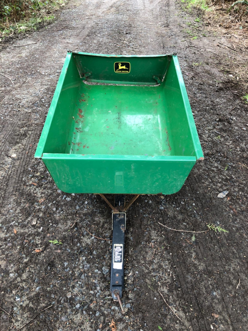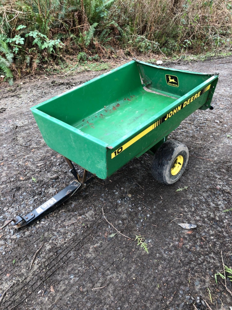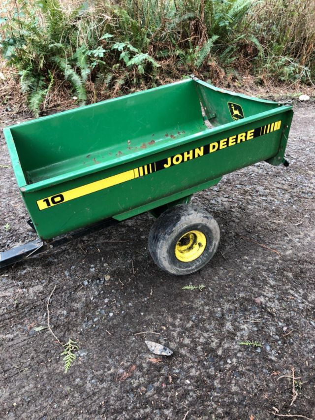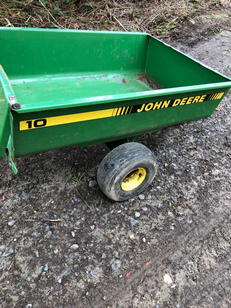 John Deere Model 10 tow‑behind utility trailer with steel bed and yellow wheels. This classic single‑axle cart is a favorite among collectors and acreage owners for its durability and compatibility with vintage John Deere lawn tractors. Exterior shows weathering and age‑appropriate wear from outdoor use, but the frame and bed appear solid and suitable. Tires show good tread. Hitch assembly present. Length overall - 64 inches Tongue - 21 inches Bed - 47 inches long x 36 inches wide x 28 inches height