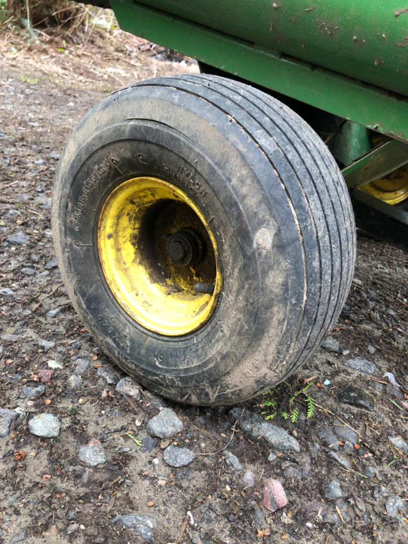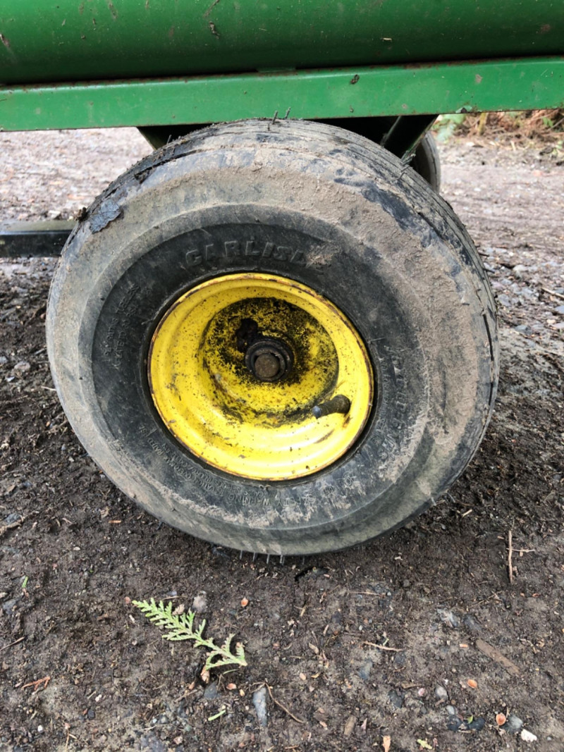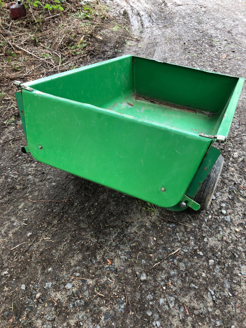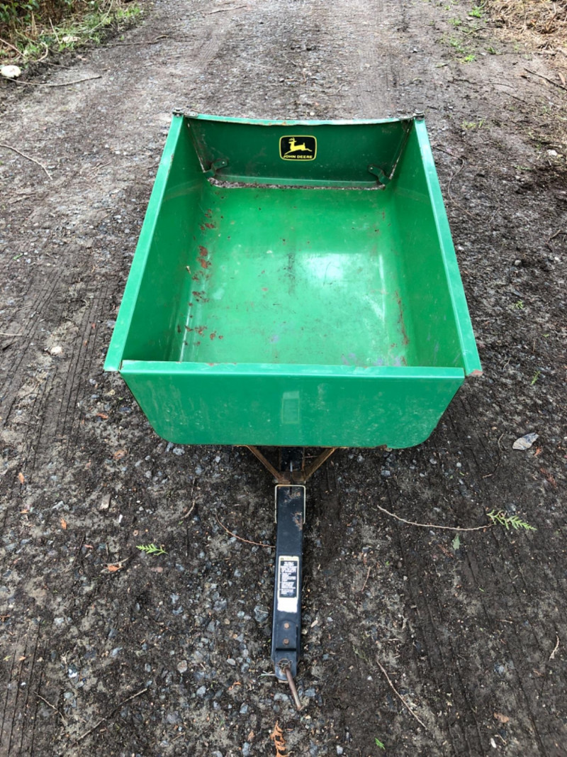 John Deere Model 10 tow‑behind utility trailer with steel bed and yellow wheels. This classic single‑axle cart is a favorite among collectors and acreage owners for its durability and compatibility with vintage John Deere lawn tractors. Exterior shows weathering and age‑appropriate wear from outdoor use, but the frame and bed appear solid and suitable. Tires show good tread. Hitch assembly present. Length overall - 64 inches Tongue - 21 inches Bed - 47 inches long x 36 inches wide x 28 inches height