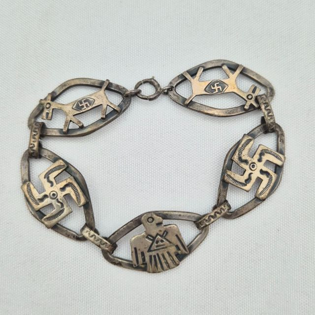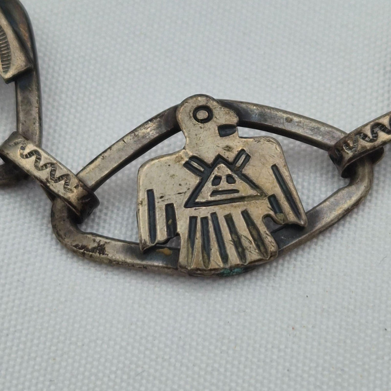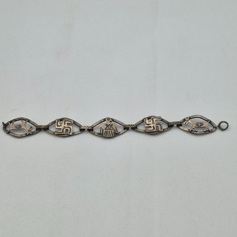 Traditional Southwestern “Fred Harvey” era motifs are featured on this vintage coin silver bracelet, featuring a thunderbird, horse (or dog), and whirling sanskrit good-fortune symbols, circa late 20s early 30s. Likely machine tooled stamped motifs. Appears clasp is stamped Sterling (but somewhat hard to read). 5-panel links, 7" long. **This lot qualifies for shipping**