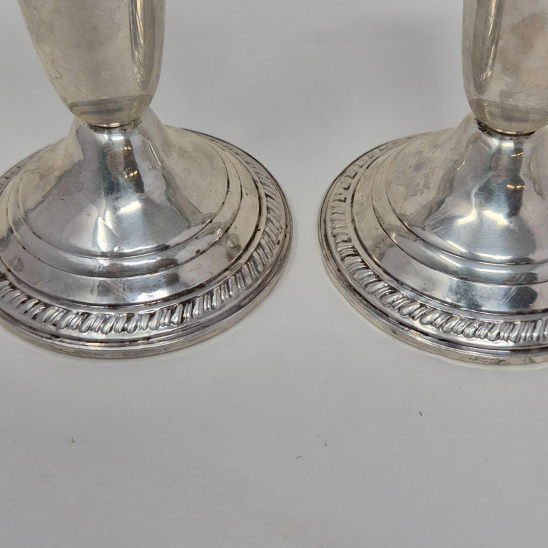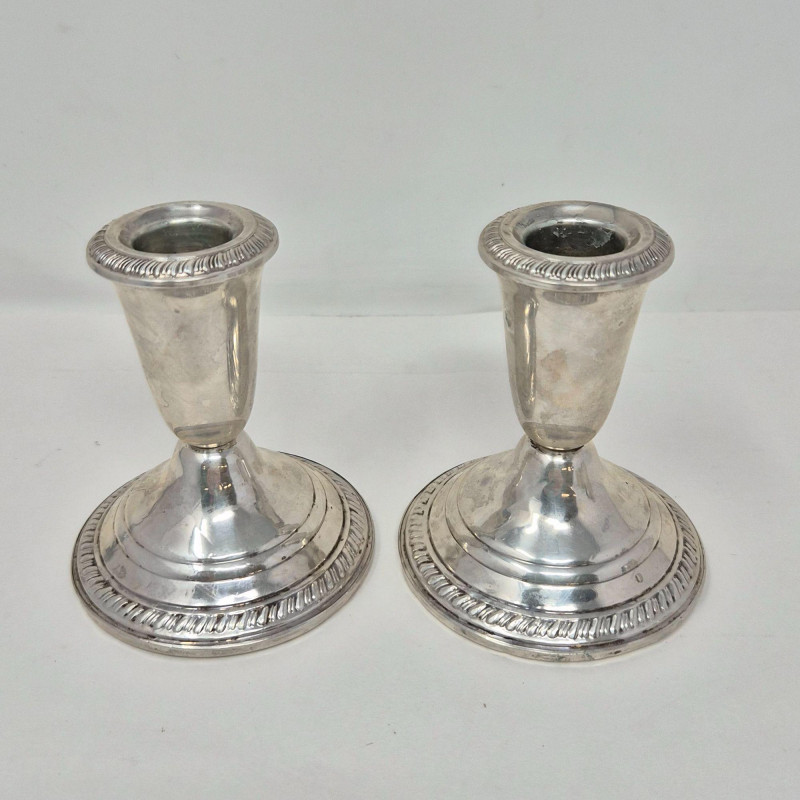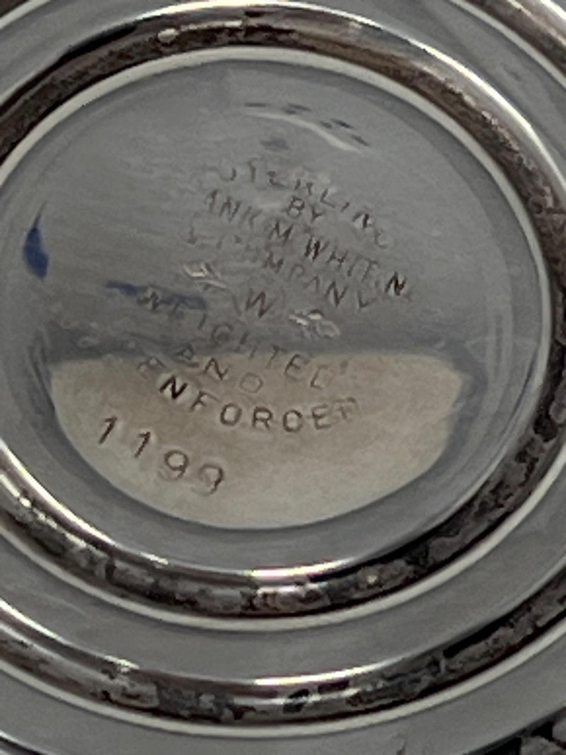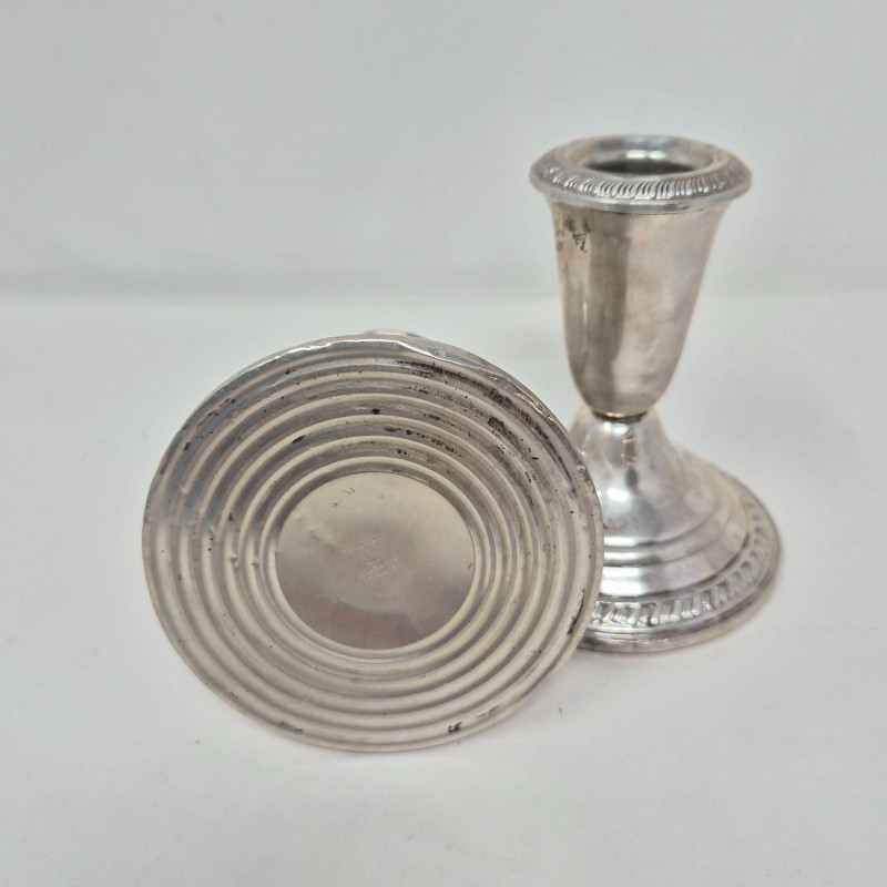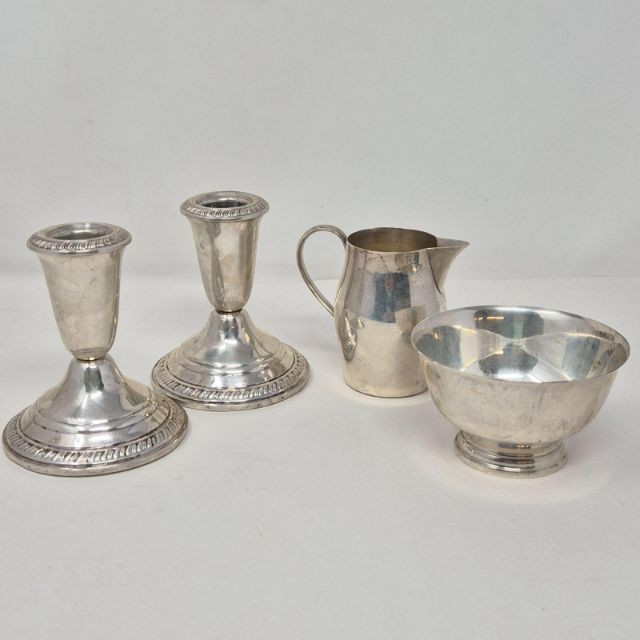 Collection of sterling silver and weighted‑sterling tableware, including two International Sterling Paul Revere Reproduction pieces (marked International Sterling C120) and additional weighted sterling items by Crown and Frank M. Whiting. Also includes one unmarked bowl with an Asian maker’s mark. All pieces show typical surface wear and tarnish from age. A solid mixed lot for collectors, silver refiners, or décor use. International Sterling – Paul Revere Reproduction, C120 Sugar Bowl and Creamer Crown Sterling Weighted Candlestick Holders (pair) Frank M. Whiting Sterling Weighted 1199 Pedestal Dish Unidentified small cup with Asian maker’s mark (material not confirmed)Included (Based on Marks Visible)