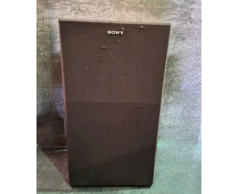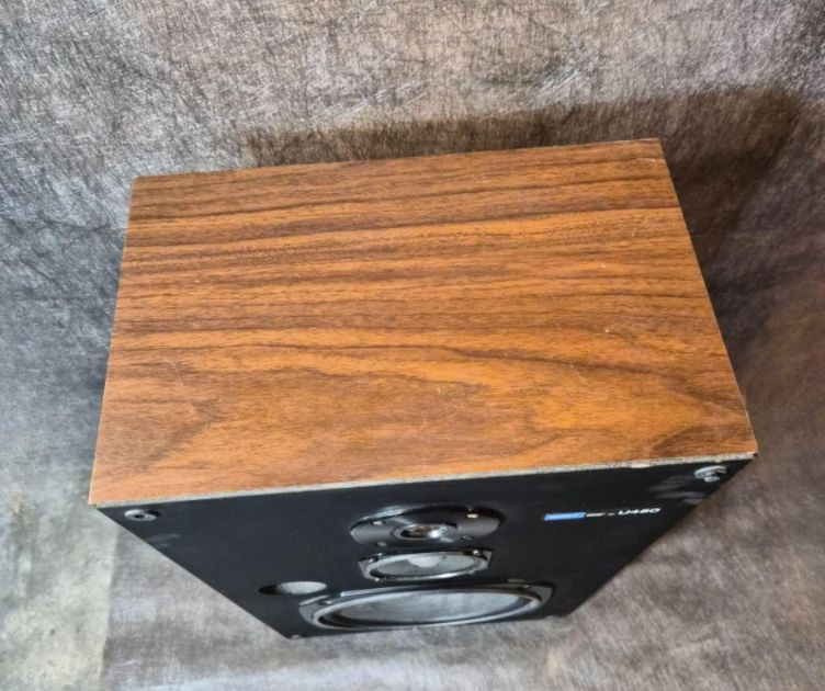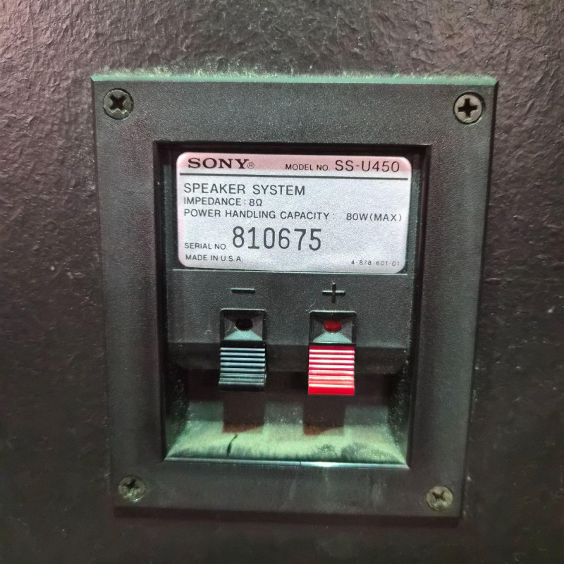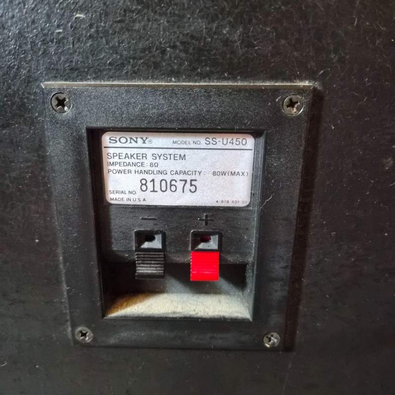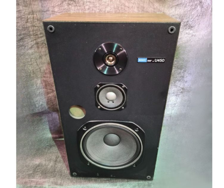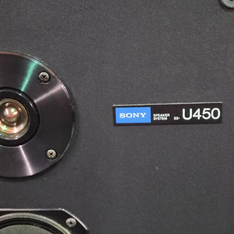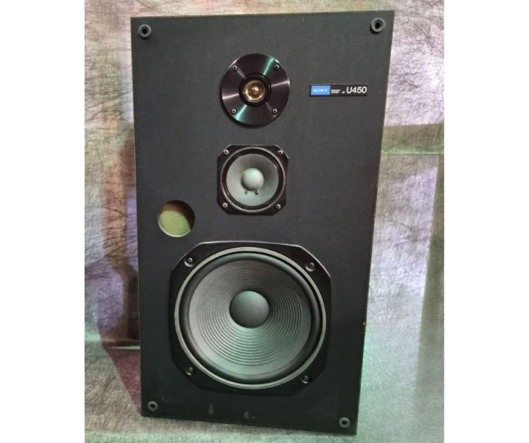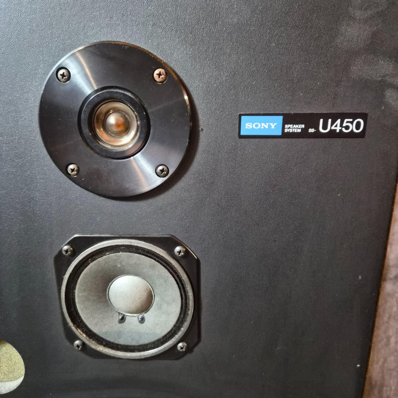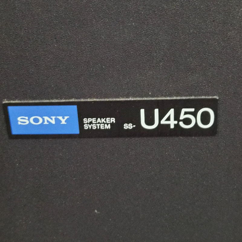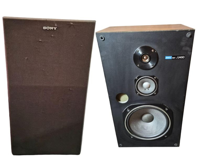 Pair of vintage Sony U450 speakers, one has its original front grille and the other is missing. The exposed unit features a tweeter, mid‑range driver, bass port, and woofer in classic Sony layout. Cabinets show age‑appropriate wear consistent with vintage audio equipment. Untested and presented as found from the estate. See photos for condition and component details.
