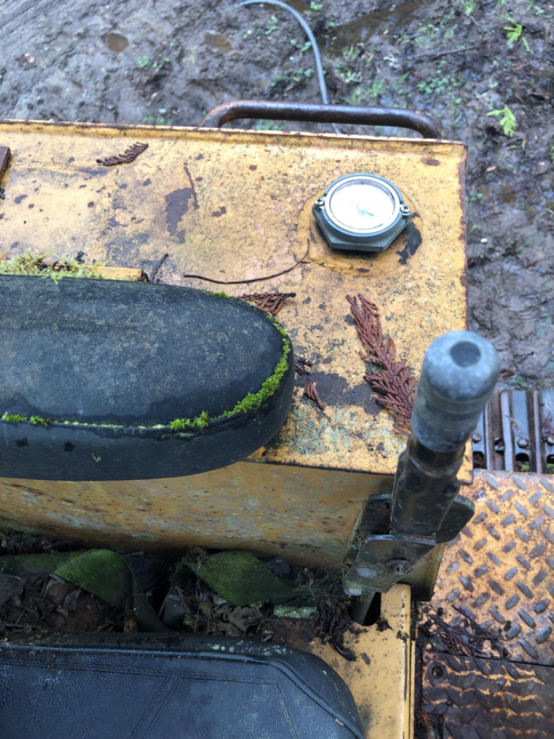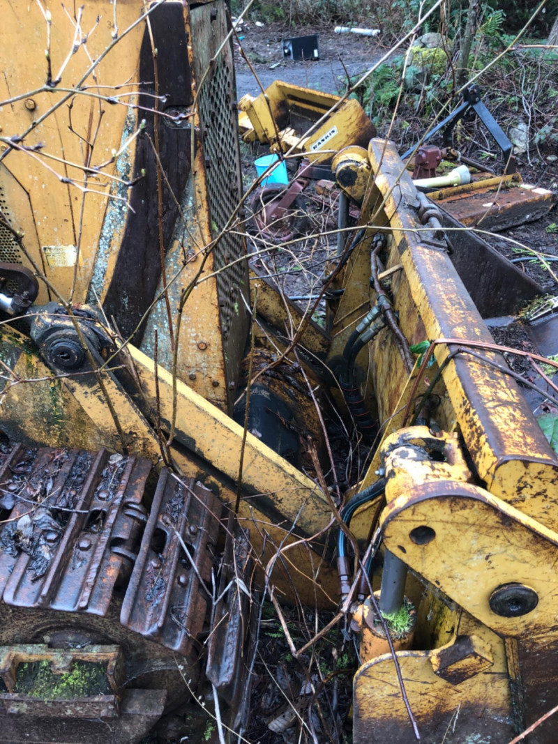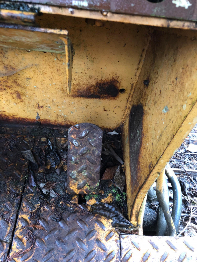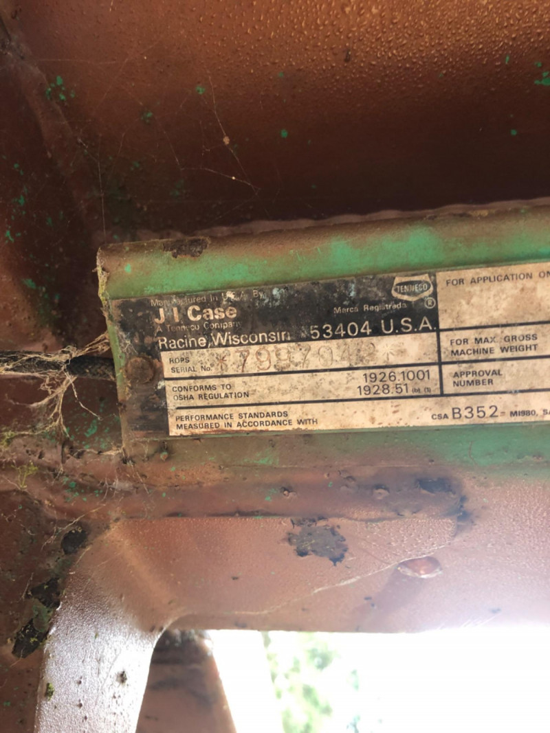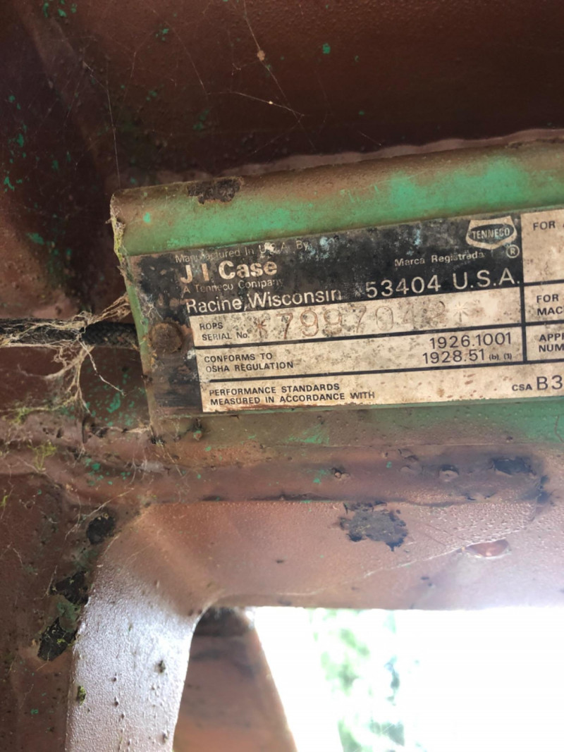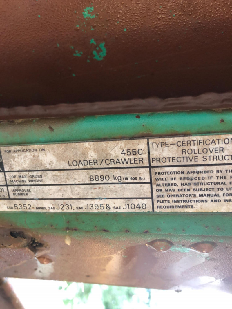 Case 455C crawler loader, diesel‑powered track loader with front bucket and factory ROPS. Machine shows long‑term outdoor storage with visible rust, weathering, and vegetation around the tracks. Identification plates confirm ROPS certification for the 455C model with OSHA and CSA compliance. Condition consistent with a non‑running project or parts machine. Offered as shown; see photos for undercarriage, hydraulics, cab structure, and overall condition.