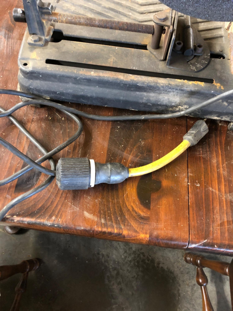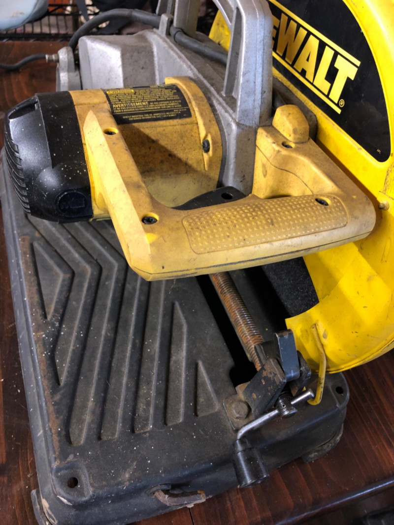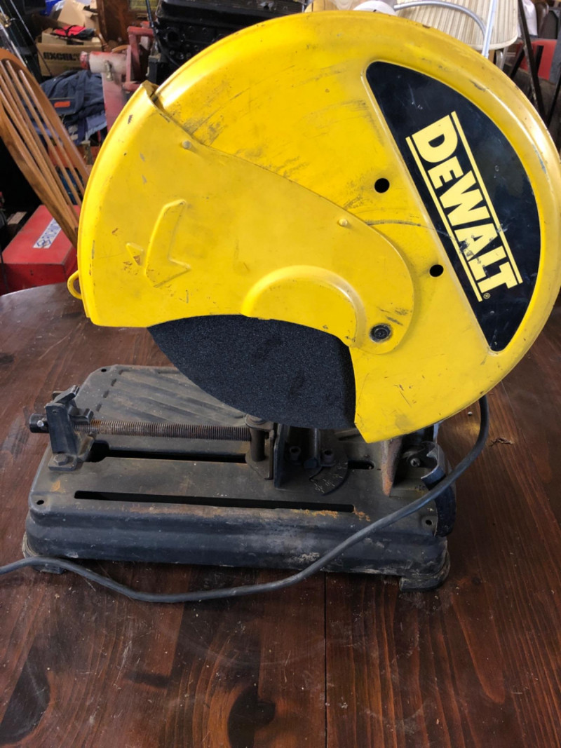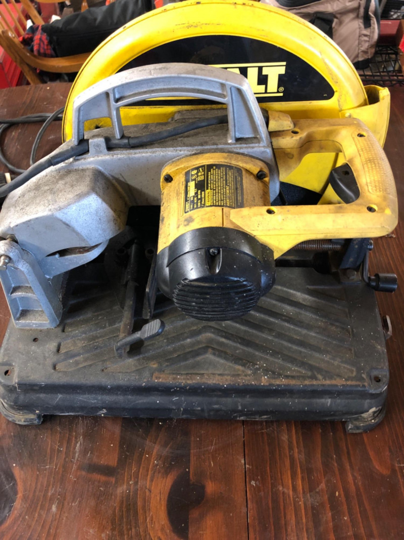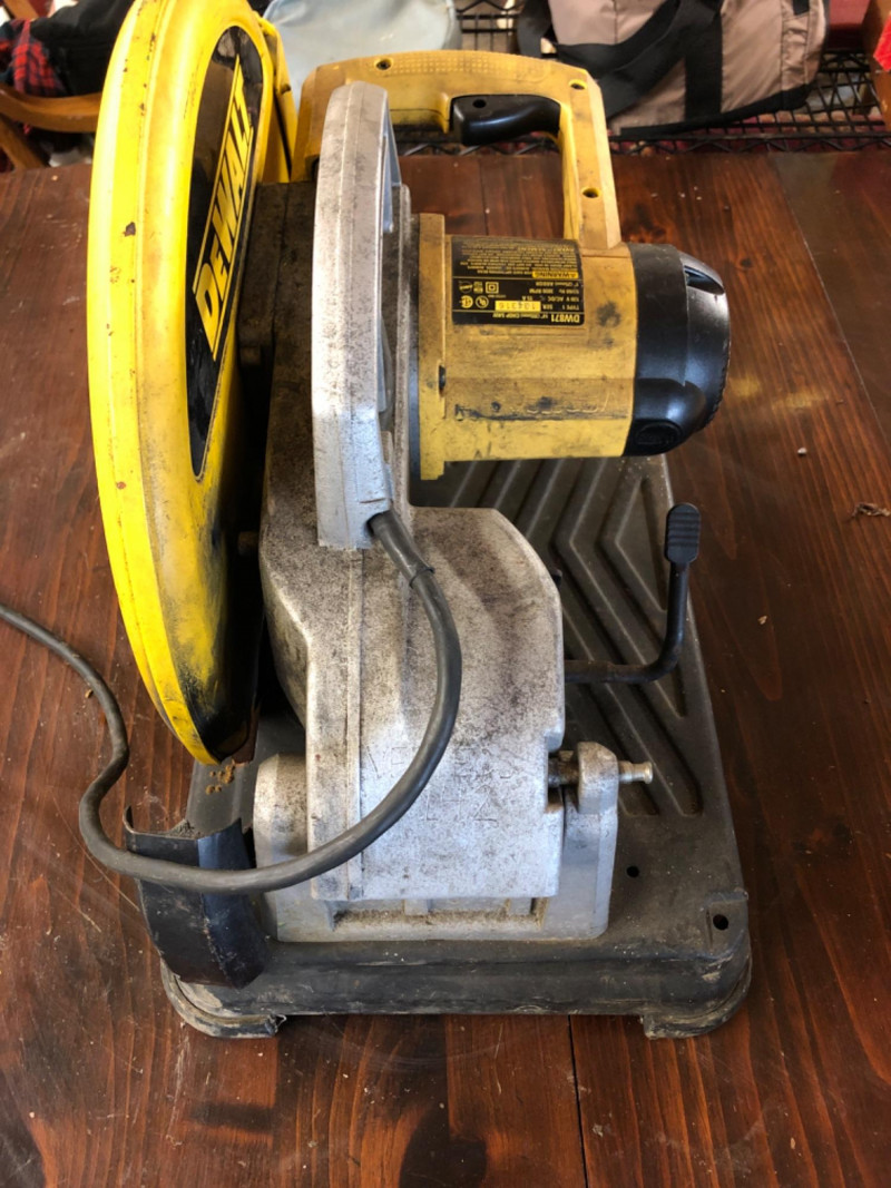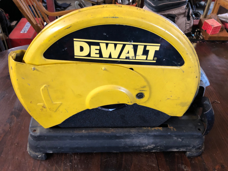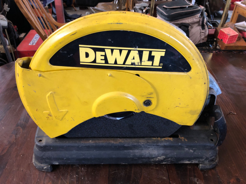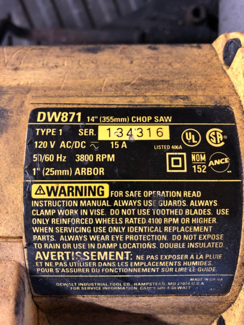 DeWalt DW871 14‑inch metal‑cutting chop saw, 120V AC/DC, serial 134316, with a 3800 RPM motor and 1" arbor. Heavy‑duty corded design suitable for cutting steel, pipe, angle iron, and other metal stock. Unit powers on and is working. Shows typical wear from shop use; see photos for condition and blade details. Offered as found from the estate.