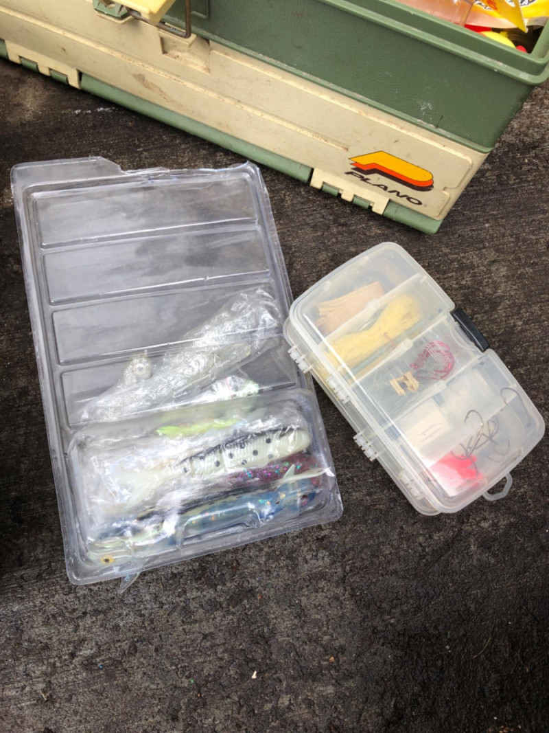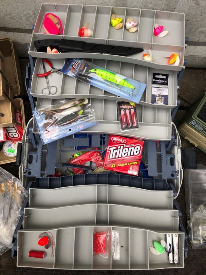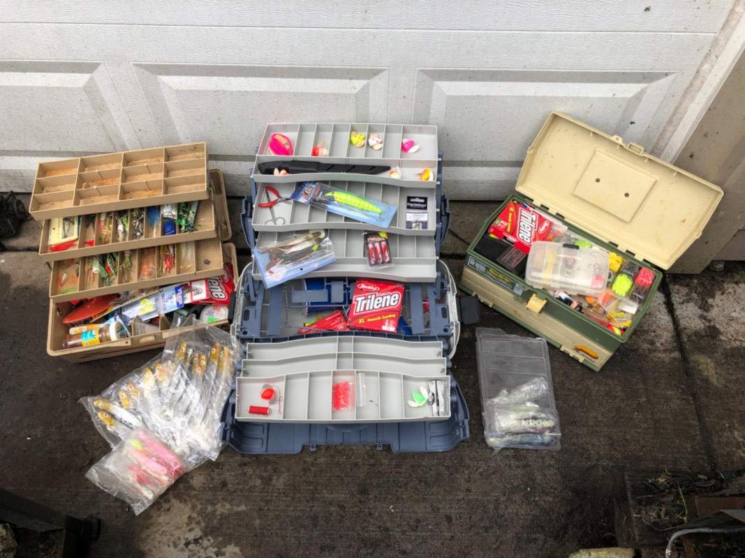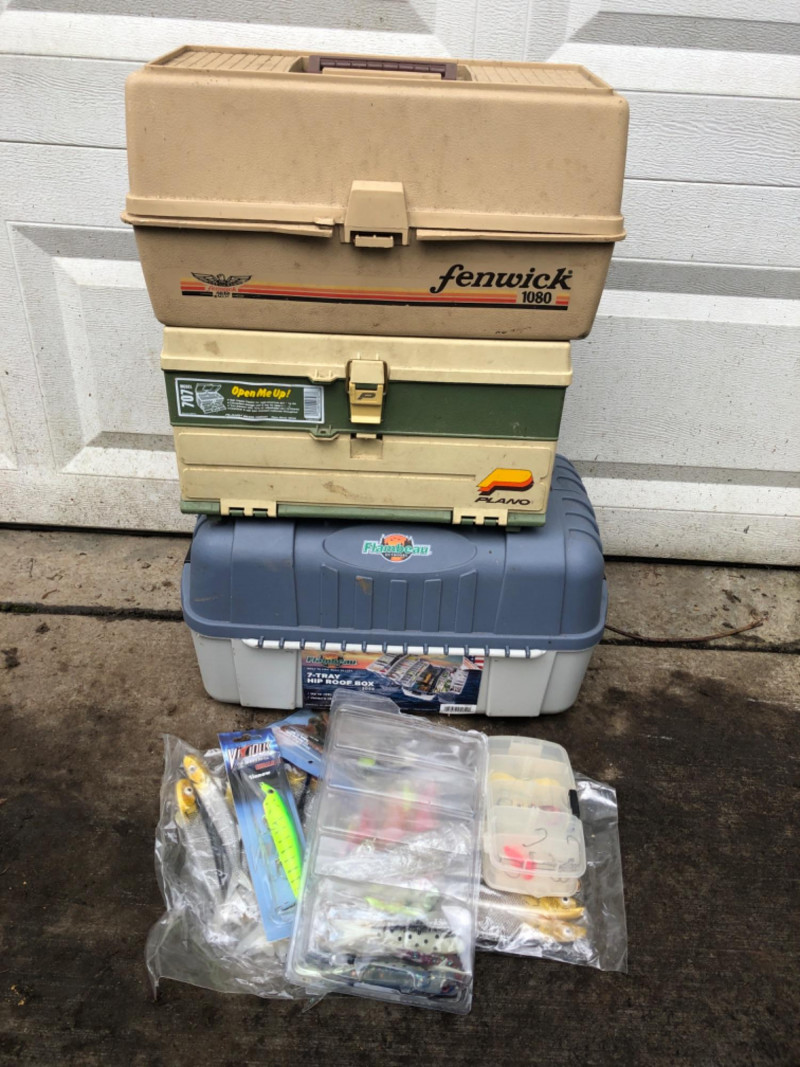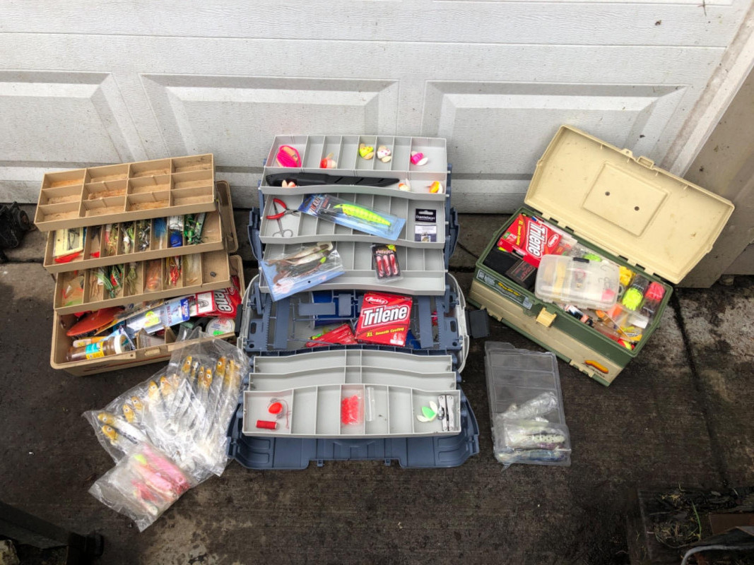 Large mixed fishing tackle lot with three multi‑tray tackle boxes and a wide assortment of lures, bobbers, hooks, swivels, sinkers, and fishing line. Includes multiple trays of organized gear plus additional bags of soft plastics, hard baits, and accessories. Brands visible include Trilene and assorted vintage and modern tackle. Ideal for restocking, beginners, or resale. Offered as shown; see photos for quantity, variety, and condition.