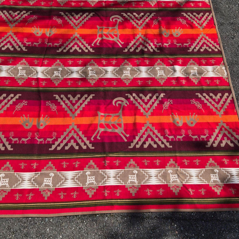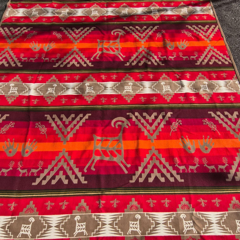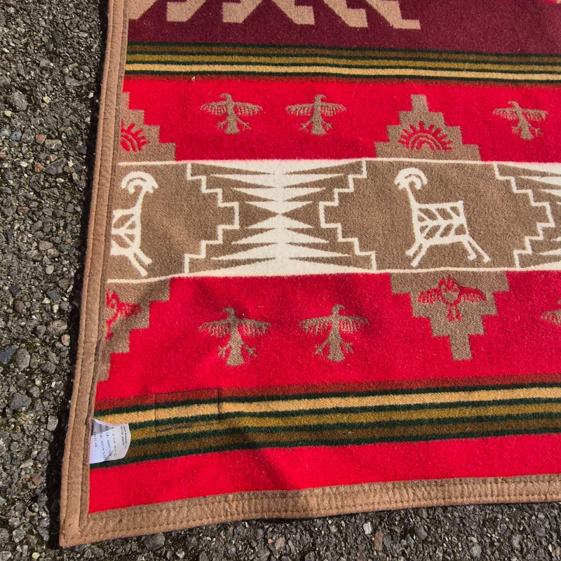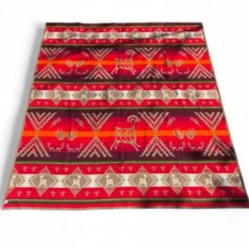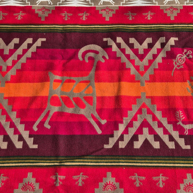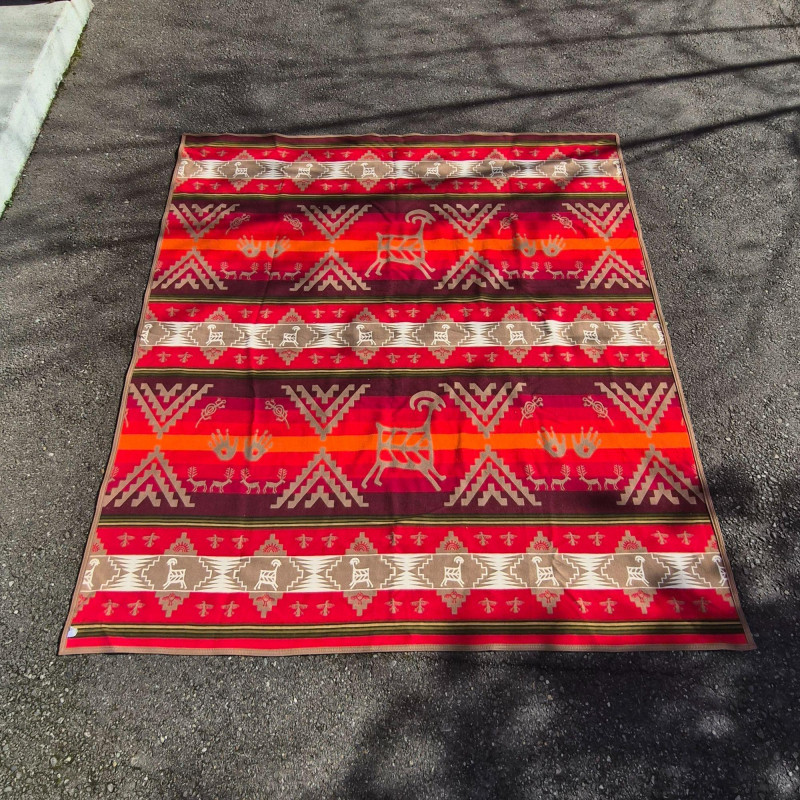 Large Pendleton cotton‑wool blanket measuring 92" x 82", featuring bold woven patterning in warm, saturated tones with stylized animal and geometric motifs. Soft, mid‑weight construction suitable for use as a bed covering or decorative textile. Estate‑found with expected wear for age; see photos for color, weave detail, and overall condition.